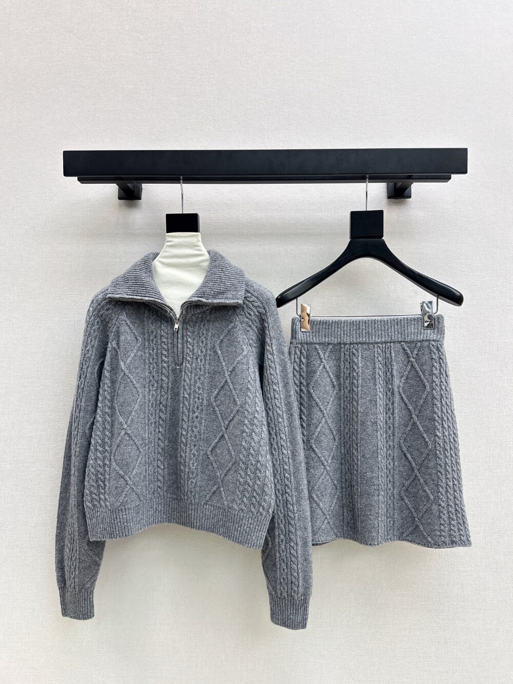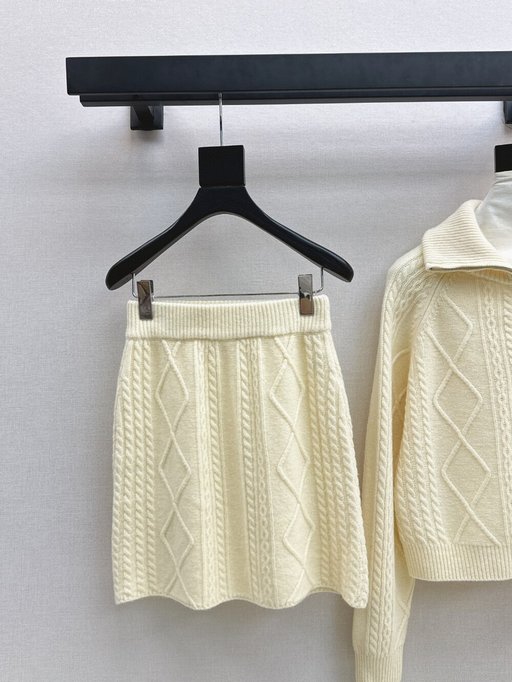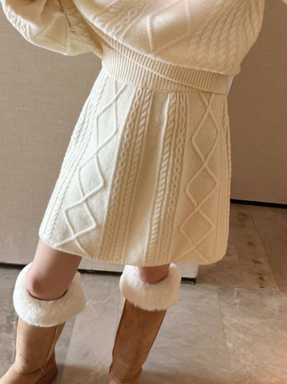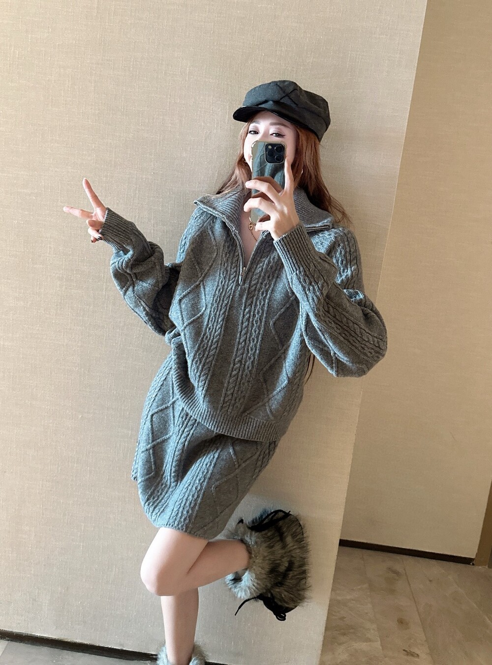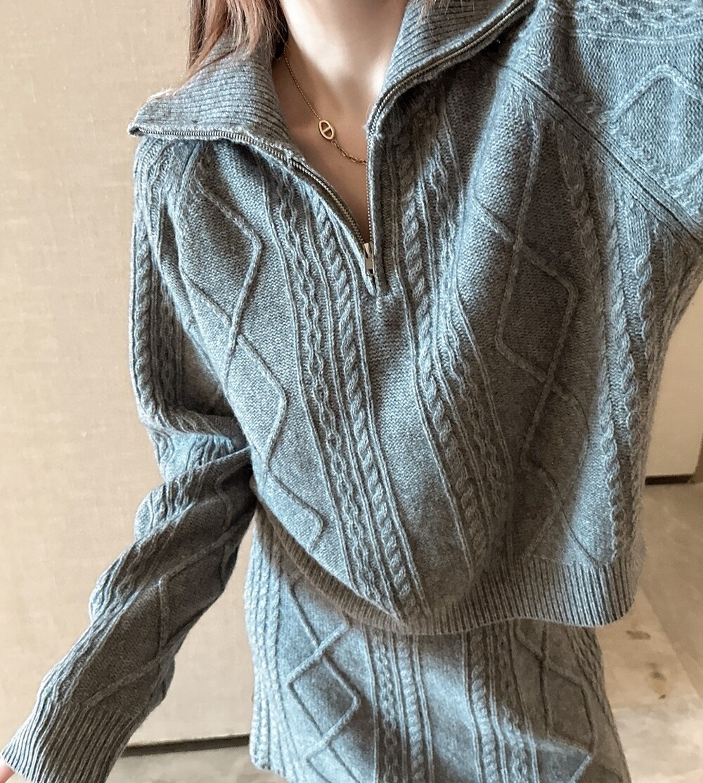 반오픈 지퍼 니트에 케이블짜임 A라인 스커트 구성이라
