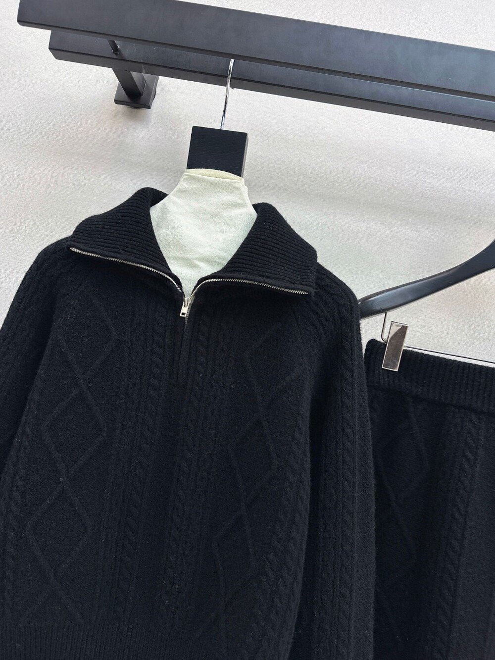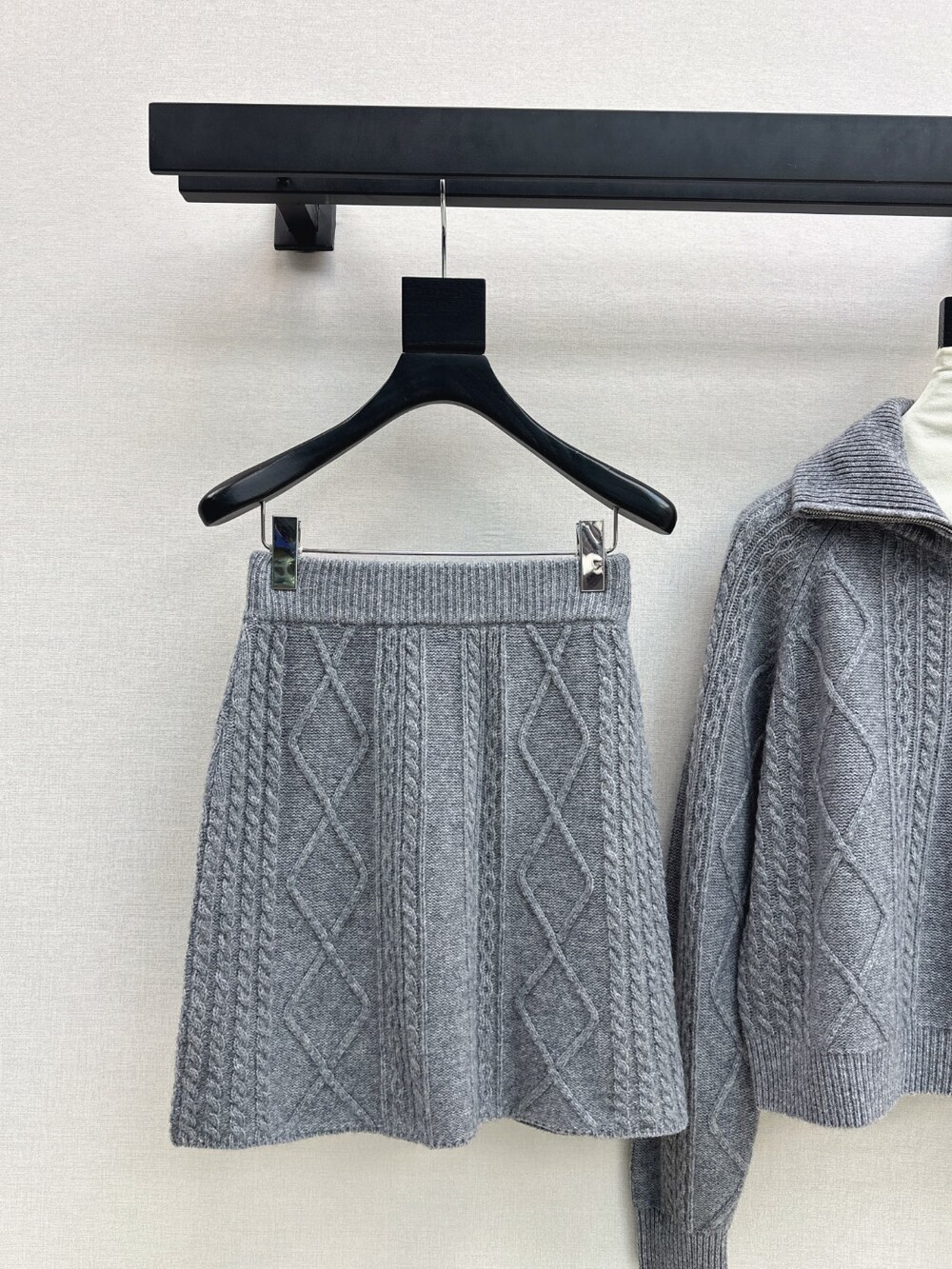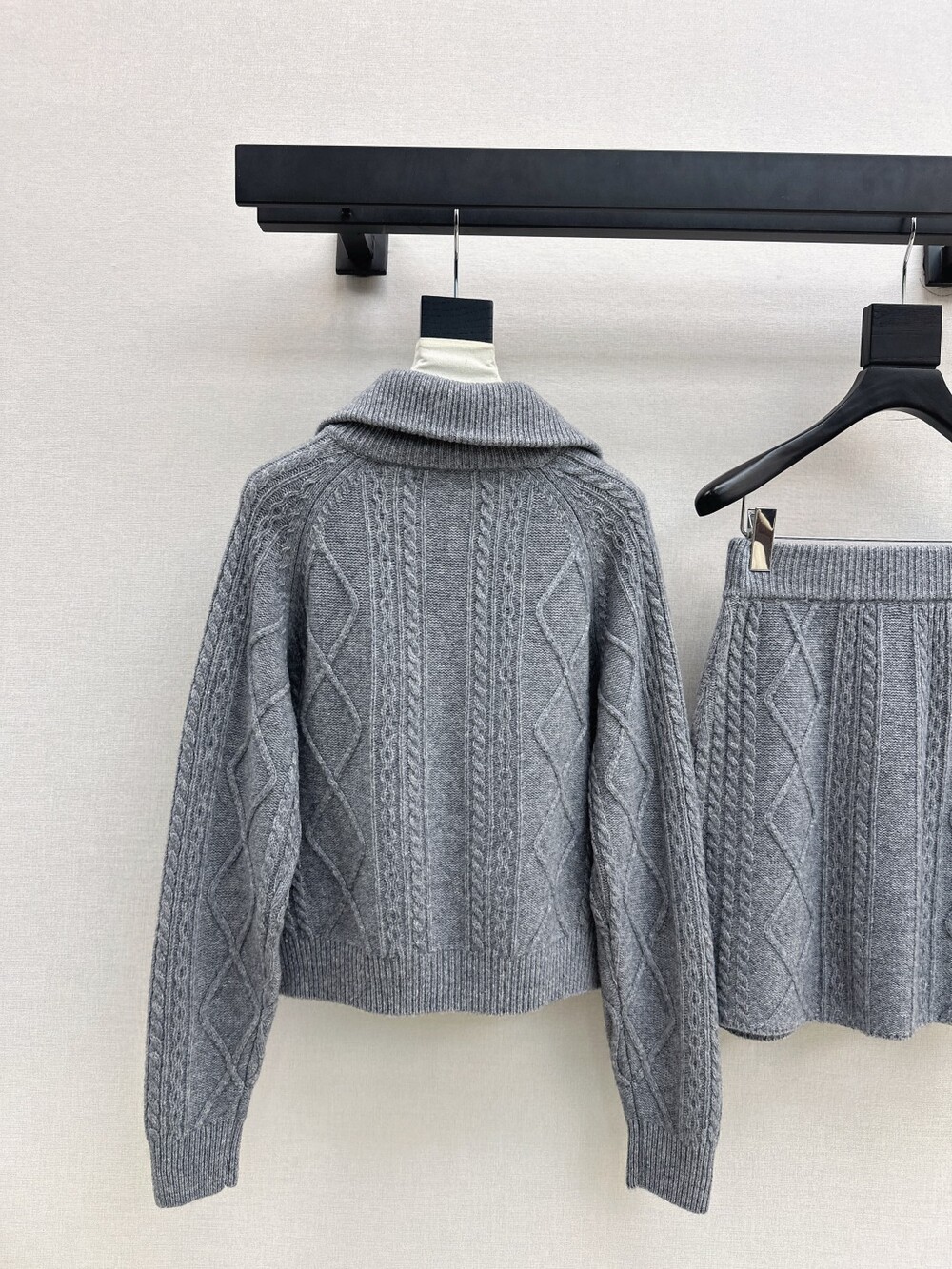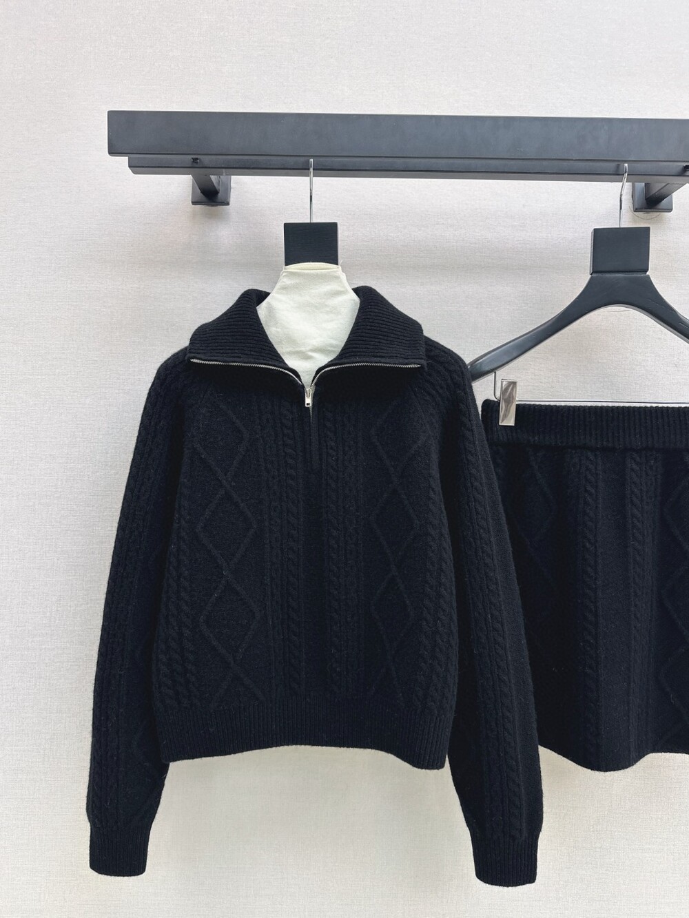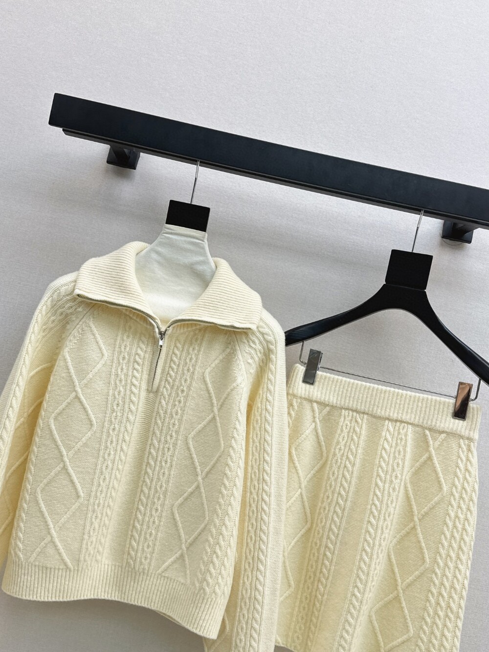 반오픈 지퍼 니트에 케이블짜임 A라인 스커트 구성이라