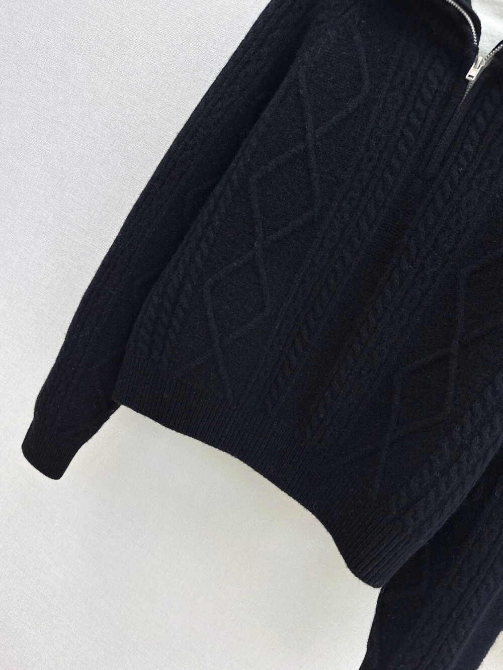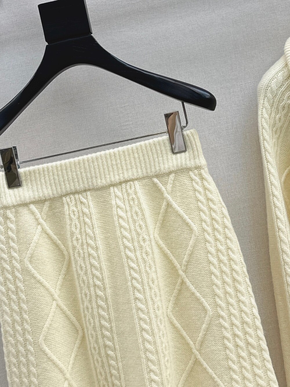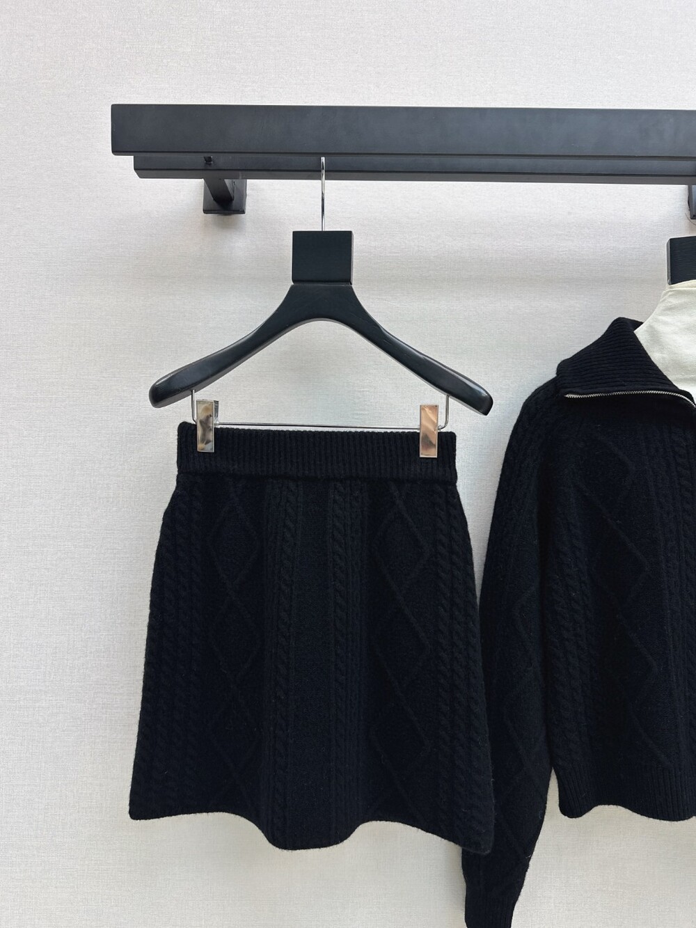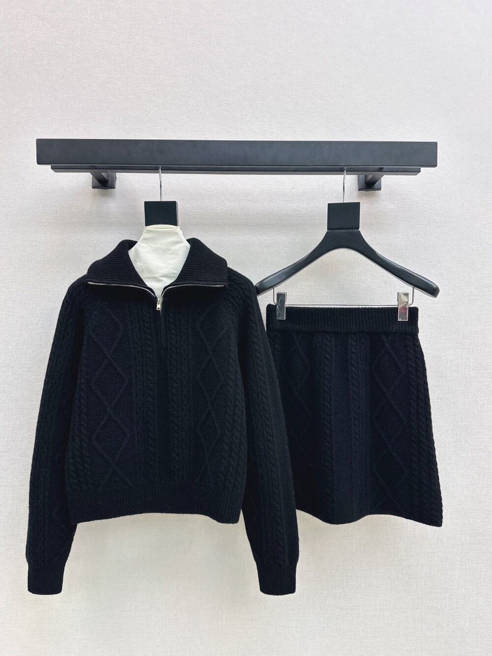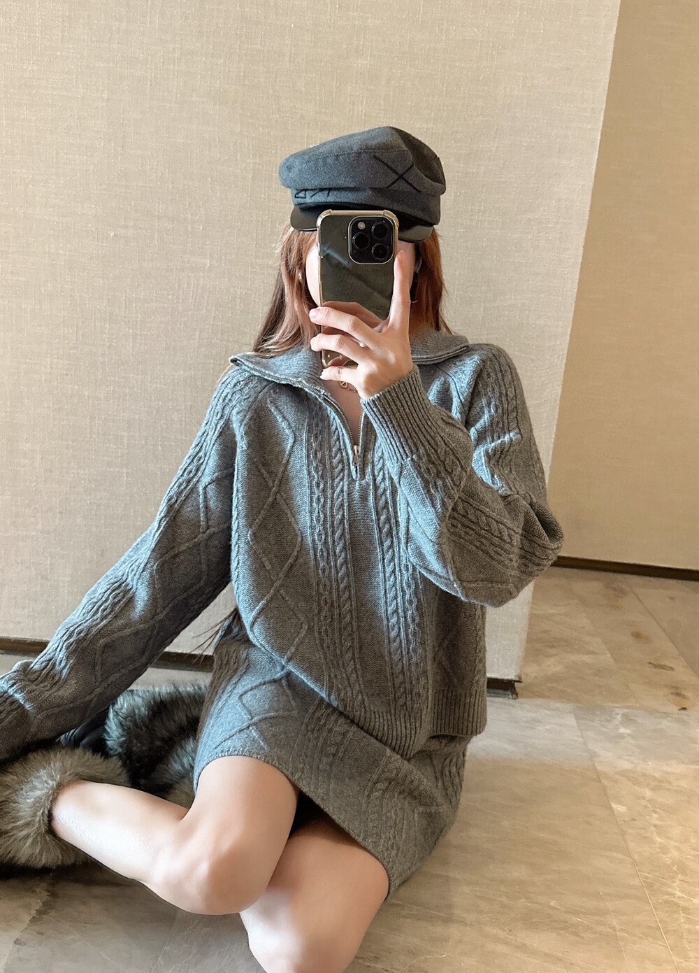 반오픈 지퍼 니트에 케이블짜임 A라인 스커트 구성이라