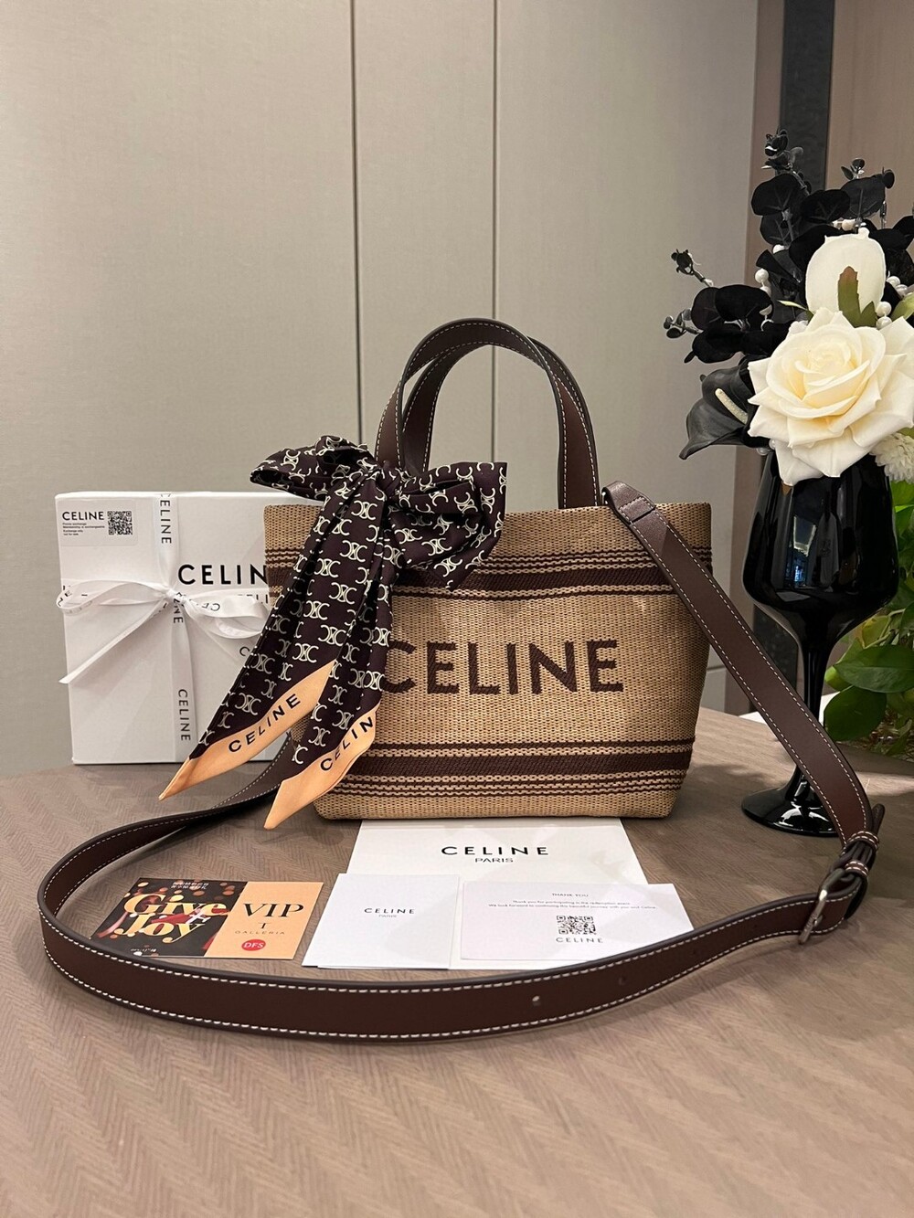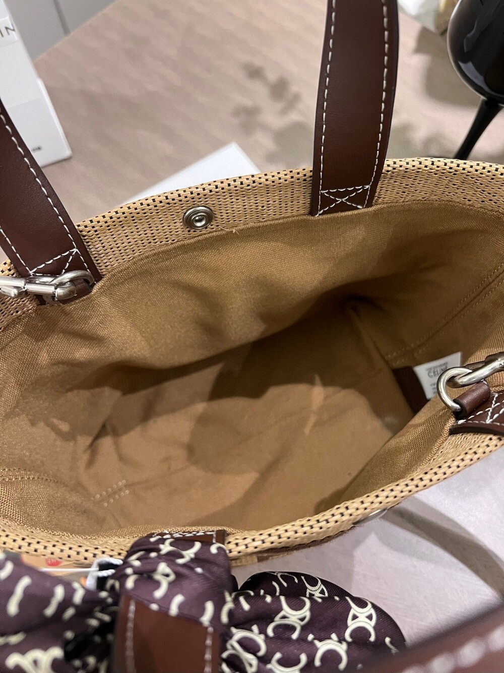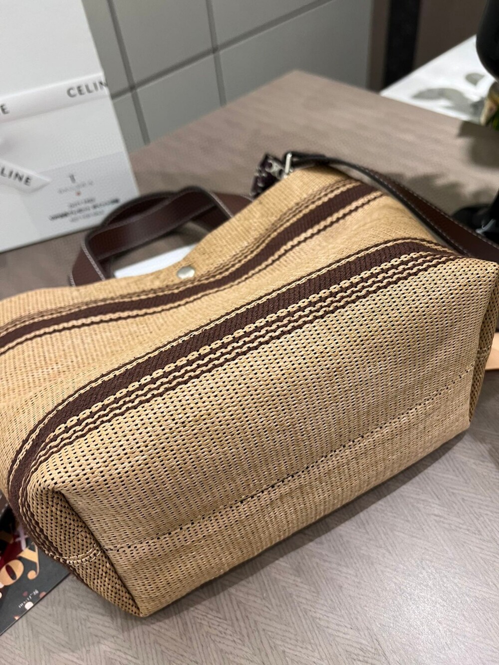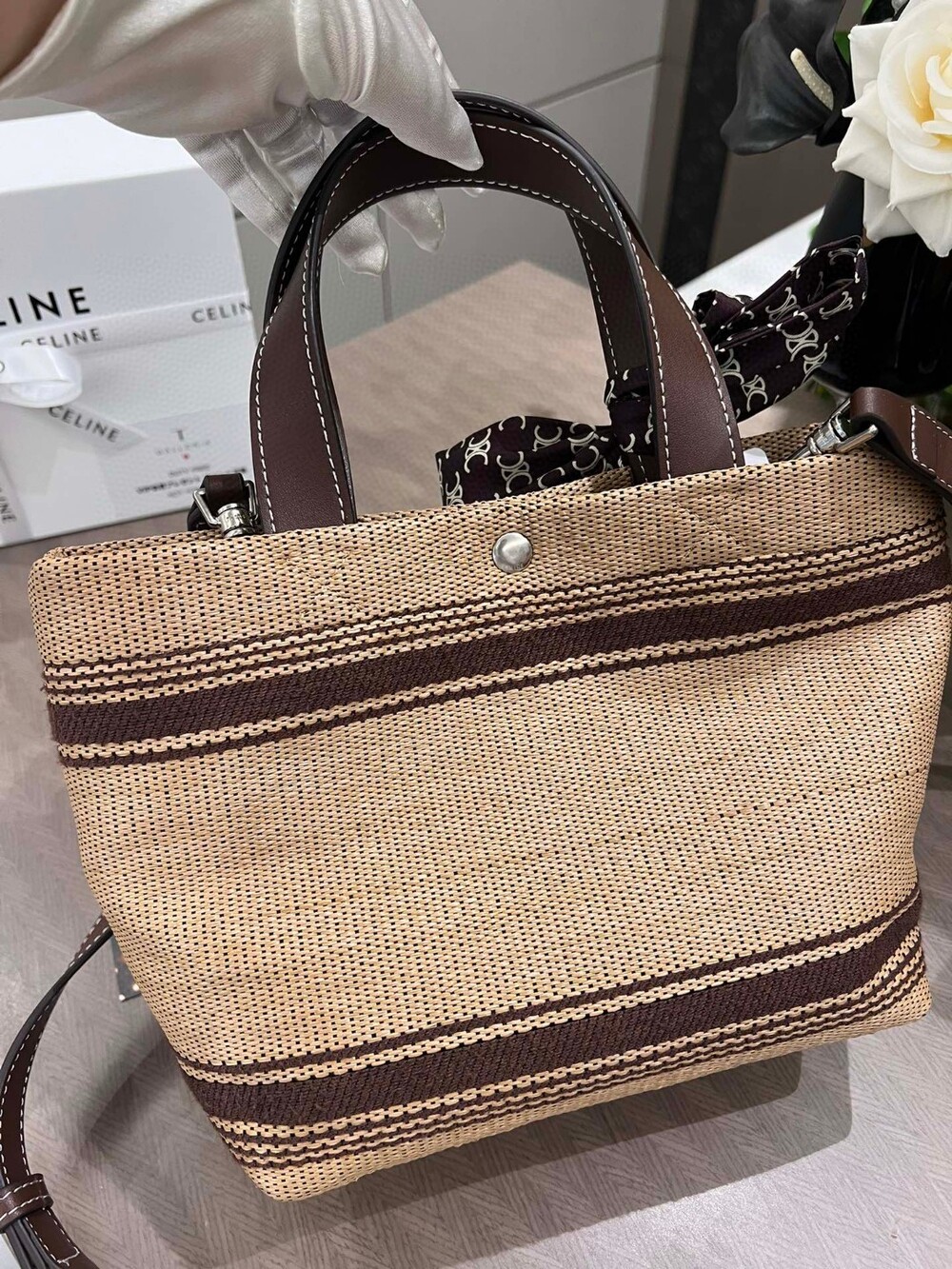 style mini tote from Celine, now released with exclusive internal labeling. Designed with both top handle and crossbody strap options, offering the perfect length for everyday use. Despite its compact size, it’s highly practical and always popular thanks to its effortless styling. Crafted from luxurious woven raffia, this mini tote bag is lightweight yet sturdy, making it ideal for warm-weather looks or casual outings. Size: Bottom length 22cm × Bottom width 12cm × Height 17cm