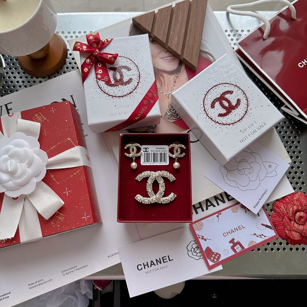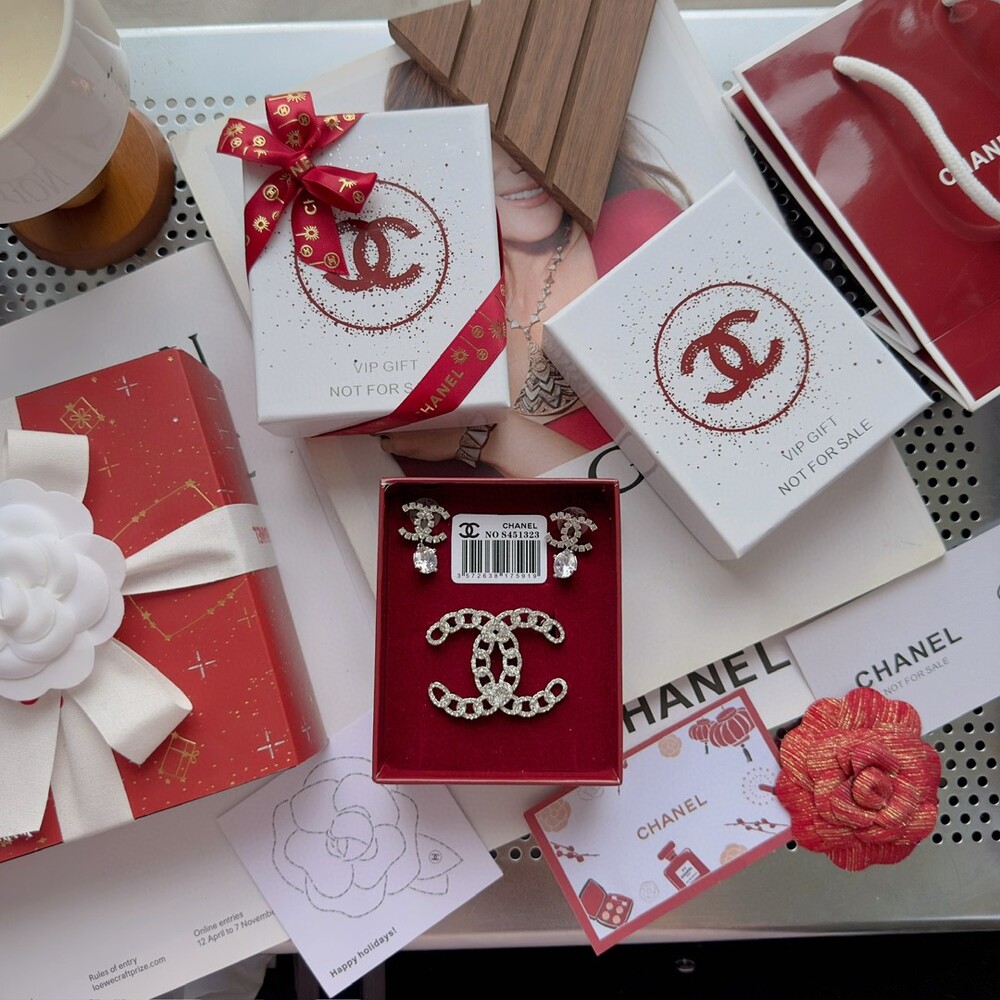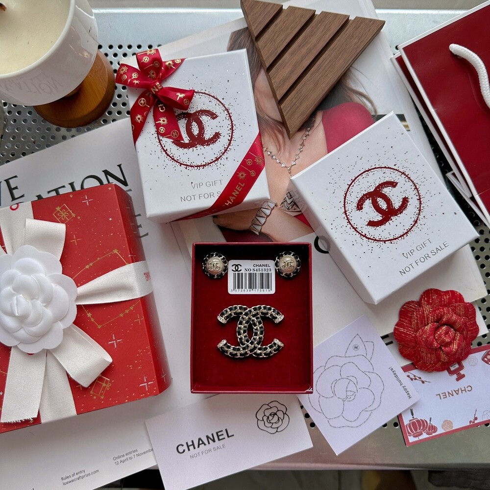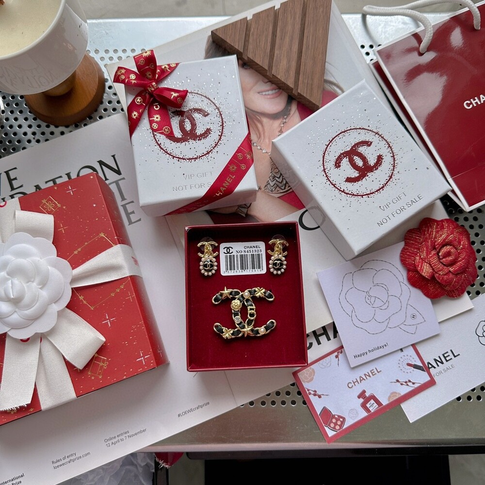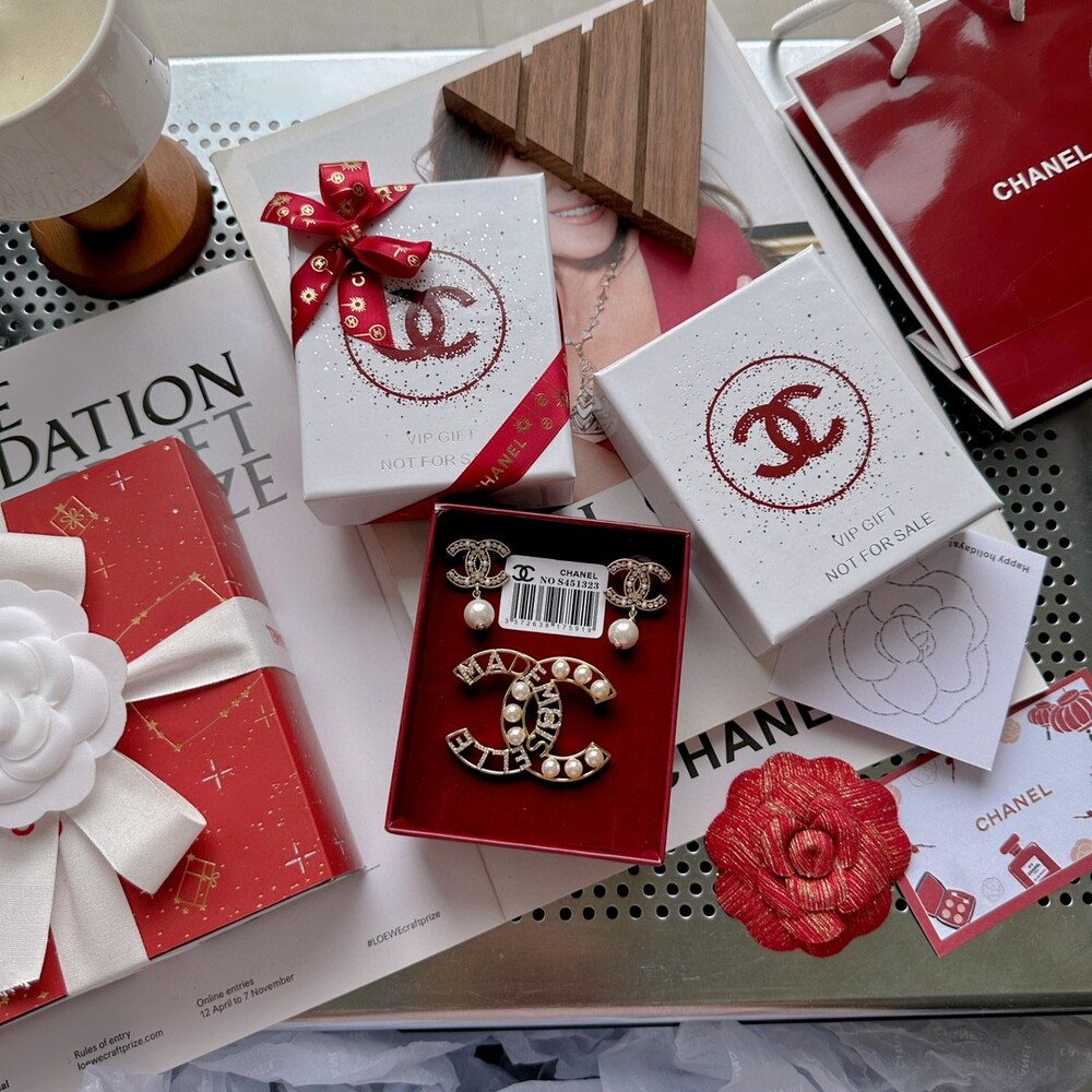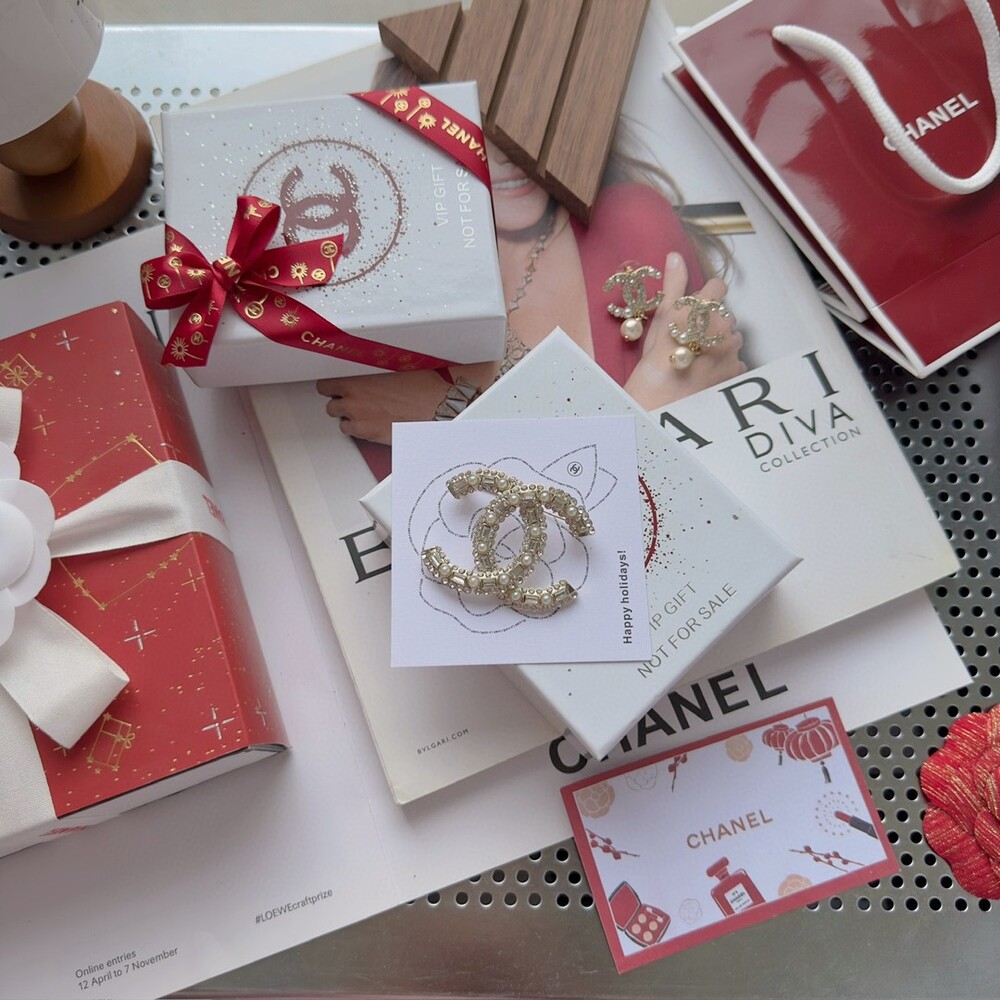 Chanel Overseas vvip Member birthday Gift Limited Red Gift Box Brooch Earrings Two Piece Set Genuine brass material + gold plating Not for sale gift box Festive gifts for the body