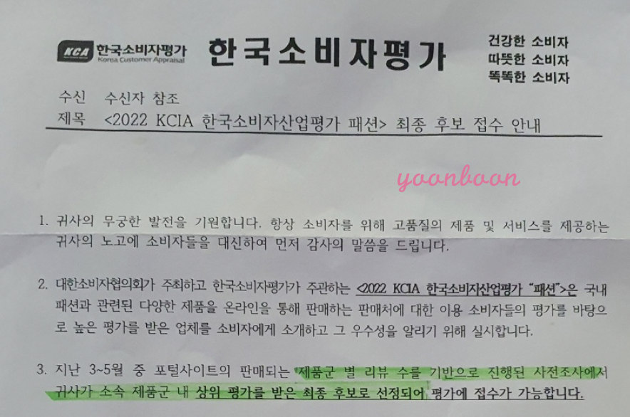 2022 KCA 한국소비자평가 "패션부분" 최종 후보로 선정되었더라구요 ㅎㅎ