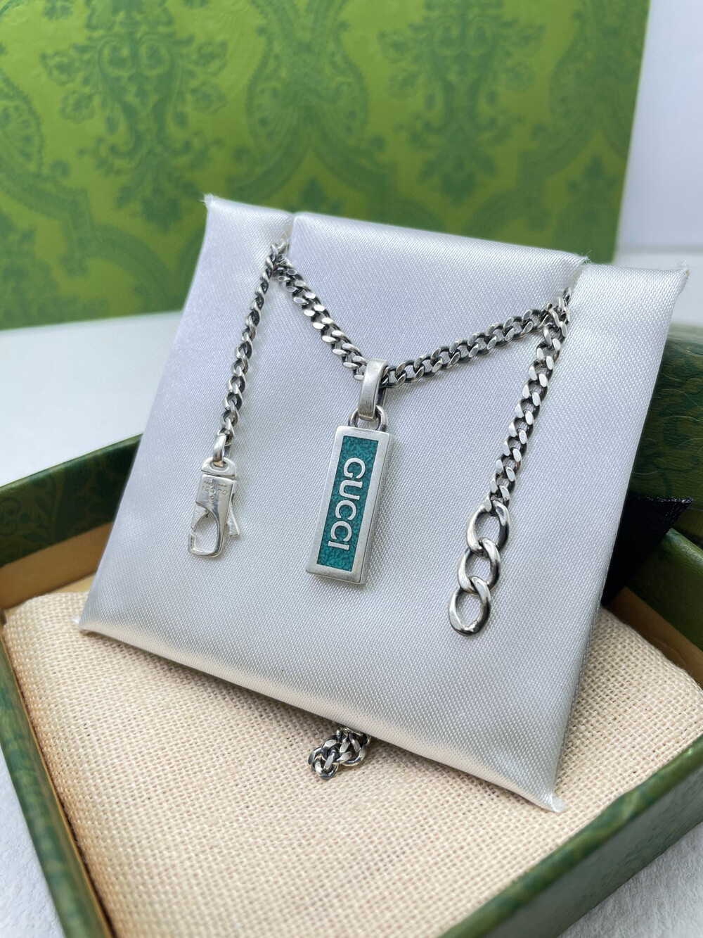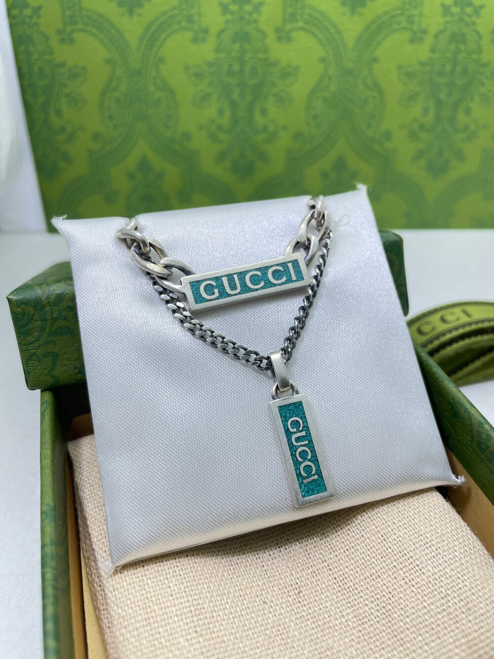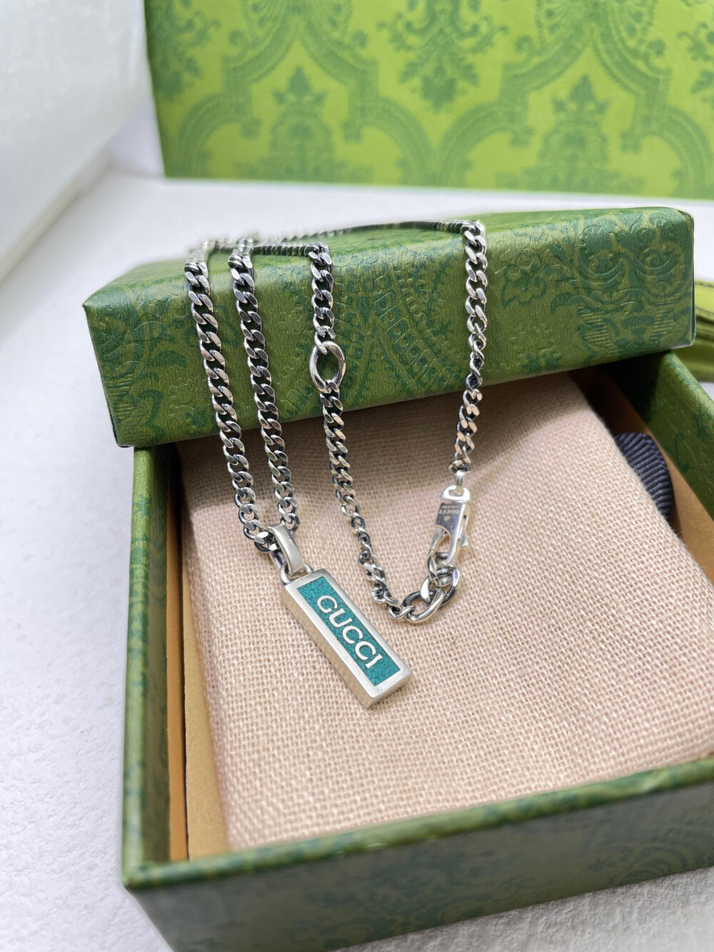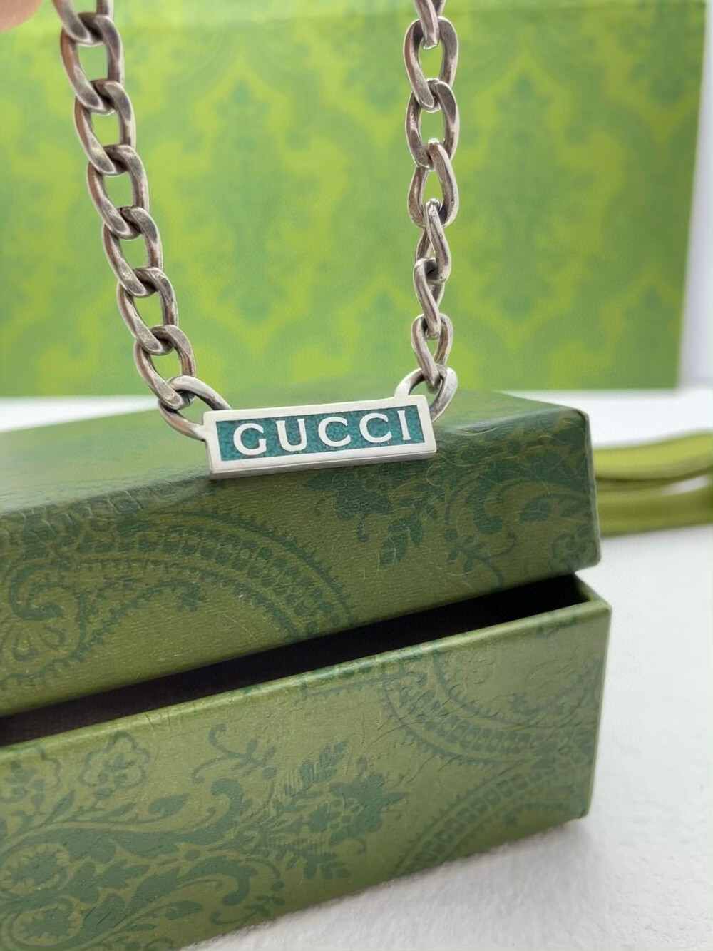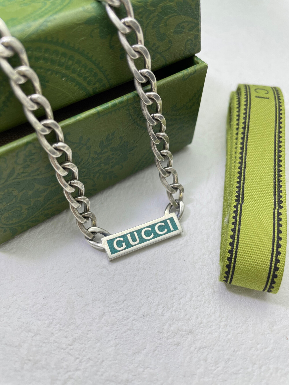 [Overseas vip member gift] Gucci Patch Green Jewel Enamel Craft|| Gucci 2021 Green Jewel Enamel, followed by a new accessory, a ring necklace will be introduced.The initials of founder Gucci Gucci were expressed on the bracelet in the form of Double G.It is made of pure silver and decorated with vivid jewelry green enamel.The silver part is vintage overall with a relief method, making it a very special style for daily look.Recommended for 2 items with thickness like vintage Cuban chain [Like R] Size: 45 cm