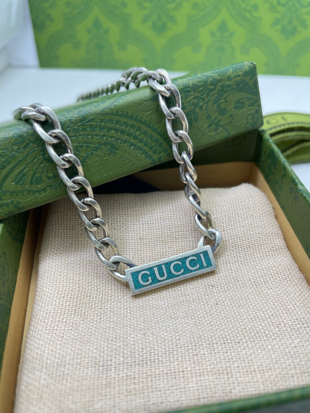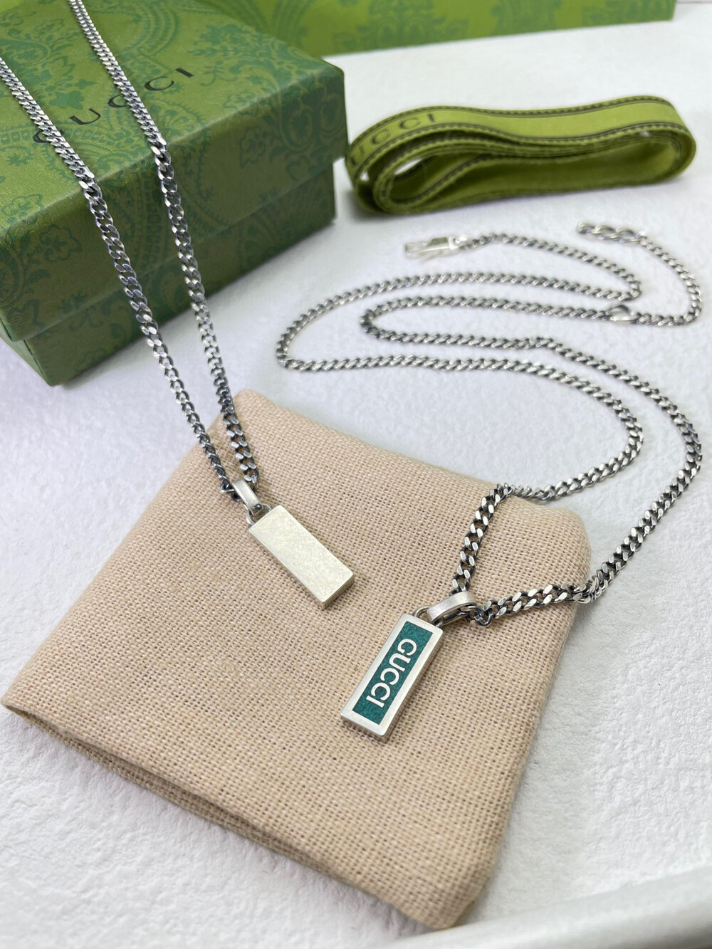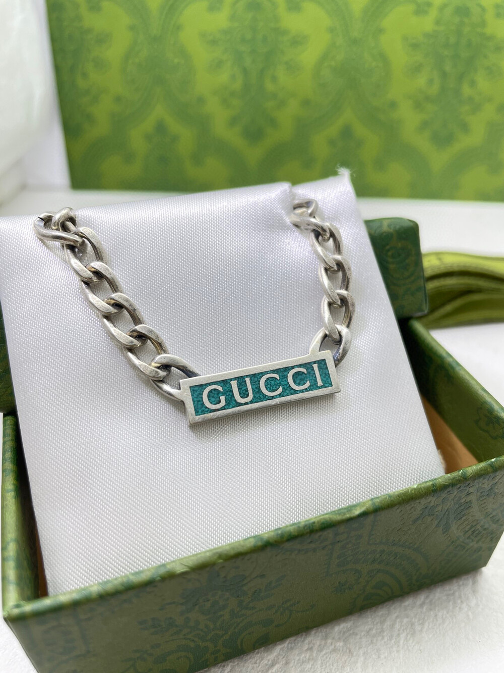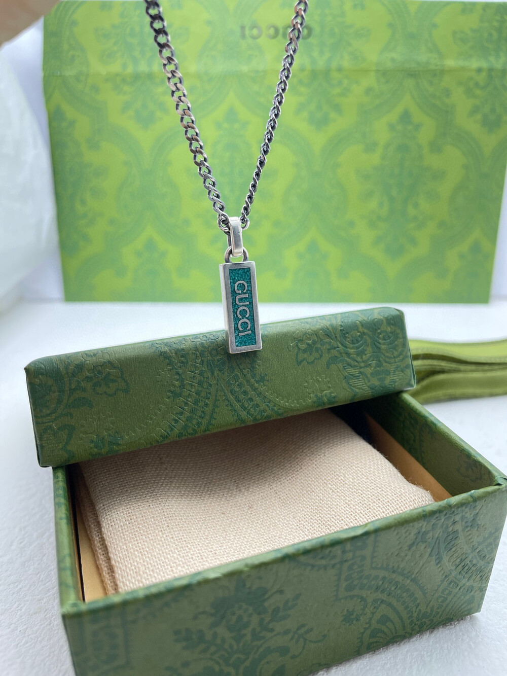 [Overseas vip member gift] Gucci Patch Green Jewel Enamel Craft|| Gucci 2021 Green Jewel Enamel, followed by a new accessory, a ring necklace will be introduced.The initials of founder Gucci Gucci were expressed on the bracelet in the form of Double G.It is made of pure silver and decorated with vivid jewelry green enamel.The silver part is vintage overall with a relief method, making it a very special style for daily look.Recommended for 2 items with thickness like vintage Cuban chain [Like R] Size: 45 cm