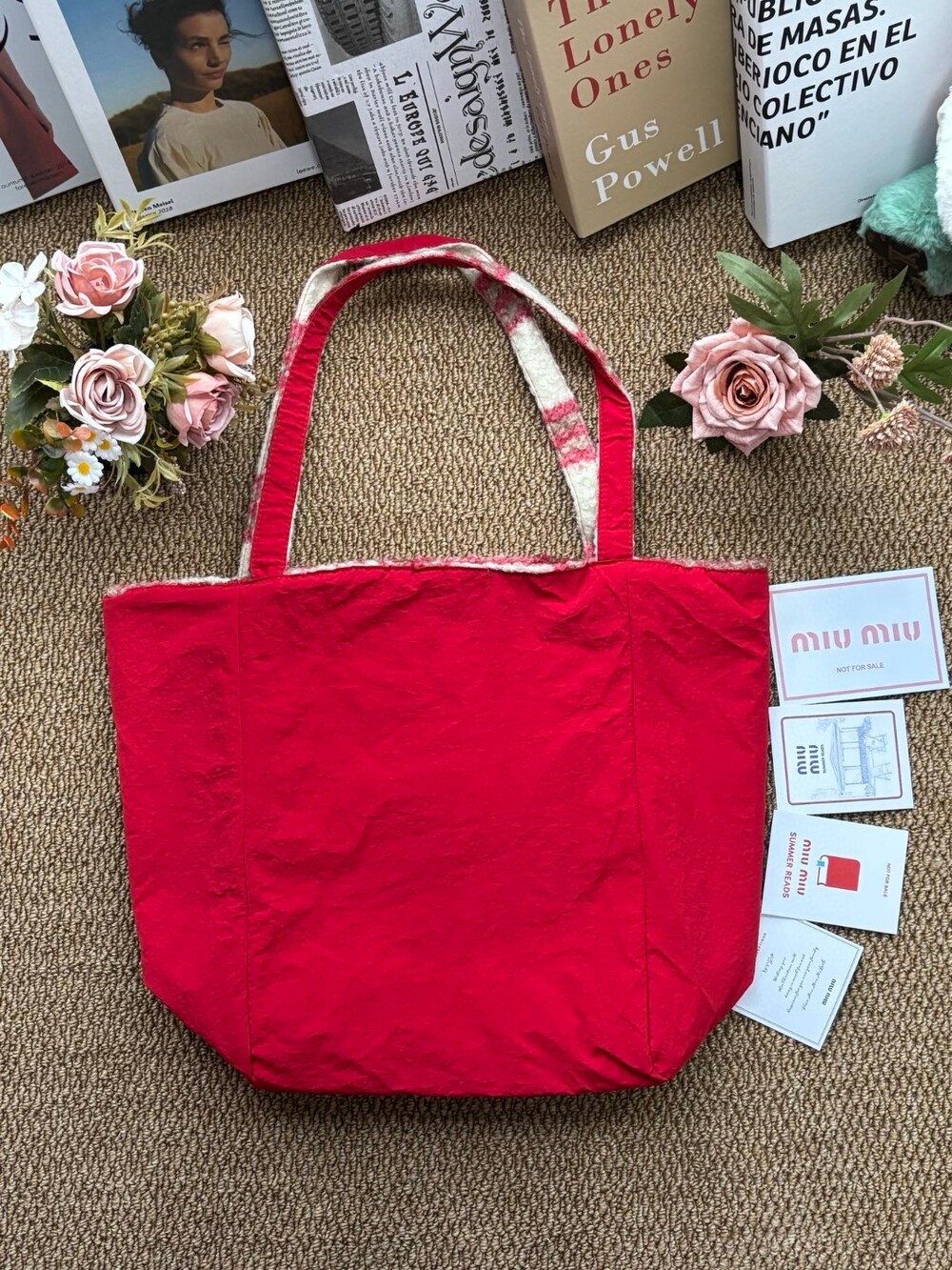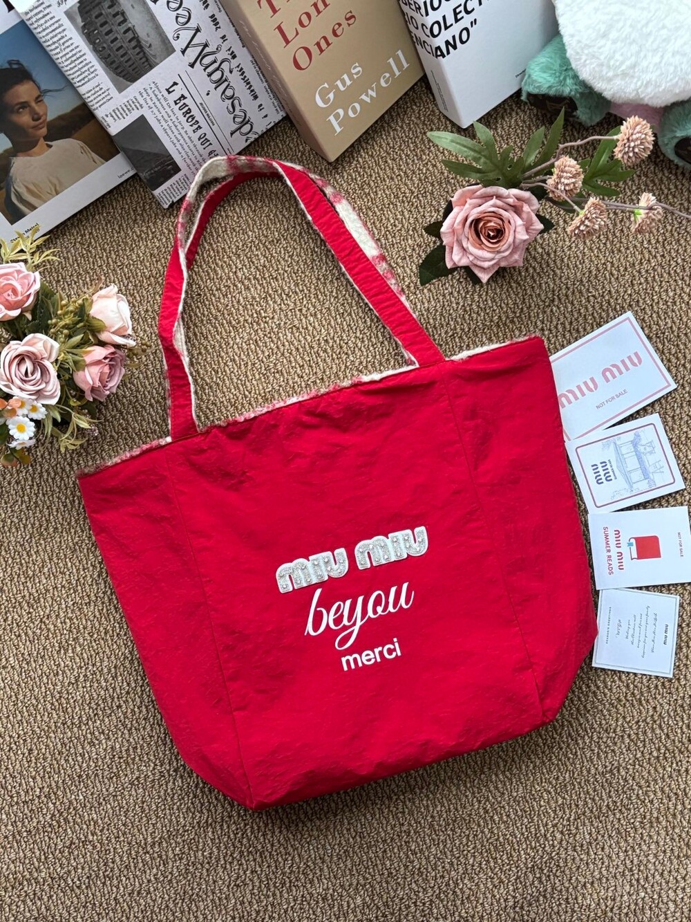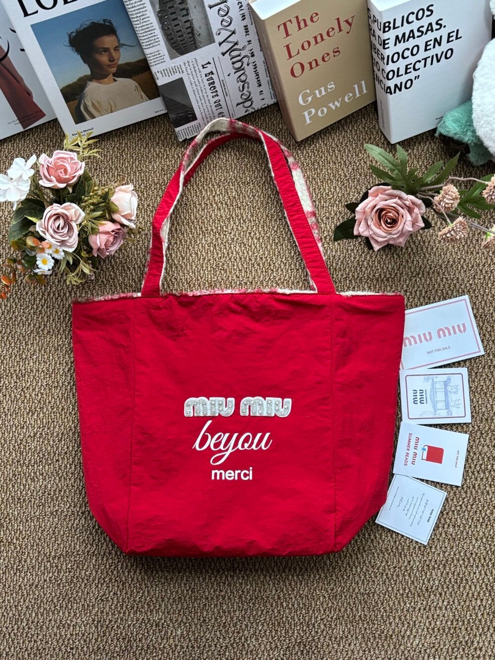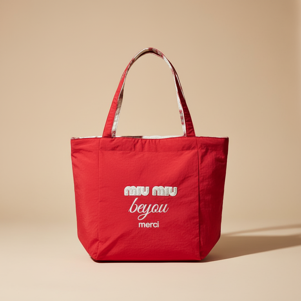 A reversible Miu Miu canvas tote bag featuring two versatile designs