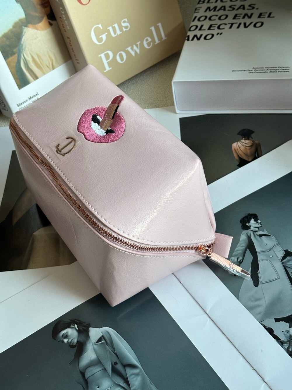 Designed with a soft blush pink velvet-like finish and finished with a rose-gold zipper,