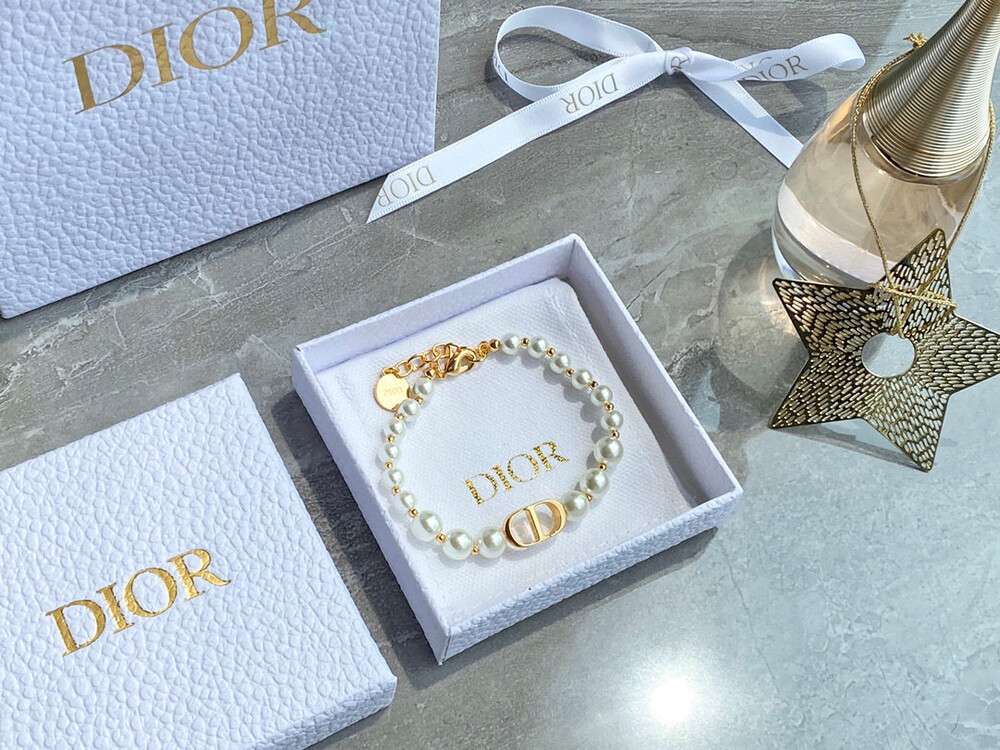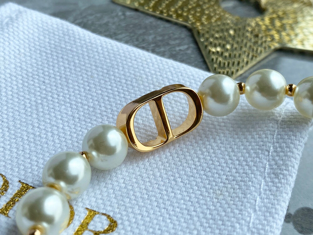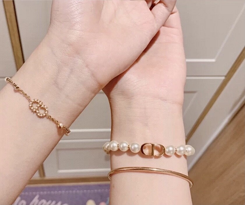 This bracelet is so beautiful. It has a gradual design with a string of pearls and spaced gold beads. It is fashionable and beautiful! The pearls with full color and luster, advanced and gentle, match the skin color, and matched with very textured CD letters, wearing them, elegant and noble, full of temperament. The details are very well done. Each pearl varies in size. There is a small flat gold bead in the middle, and a metal tag suffixed. It is very nice. The length can be adjusted at will, and it is suitable for any size. Equipped with counter full package