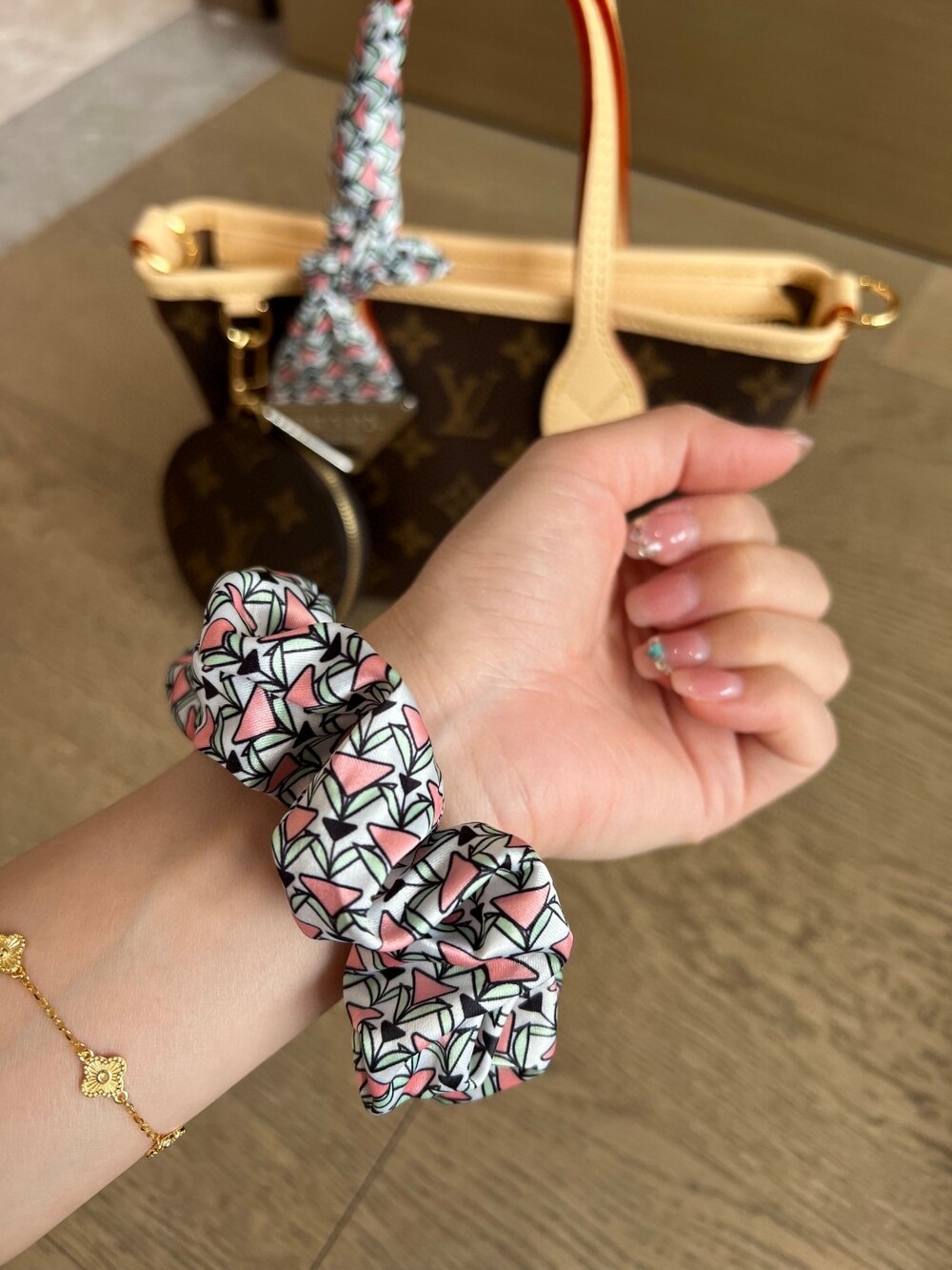 Colorectal circle adopts classic triangle flower print, can be combined with triangle standard silk scarf, for hair binding, a variety of matching methods. Every girl's wardrobe is missing a silk scarf, every day, light up a different style for you, and give the bag a different life, not only fashion, but also save the wardrobe magic.