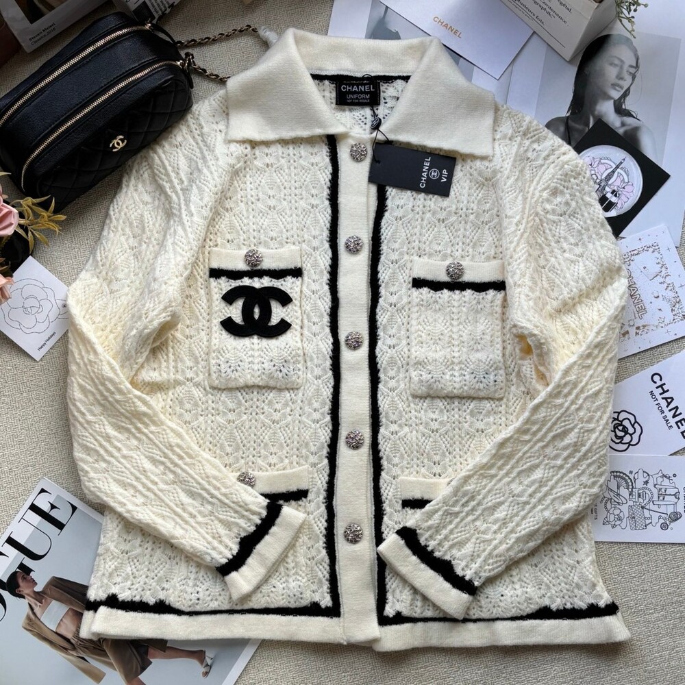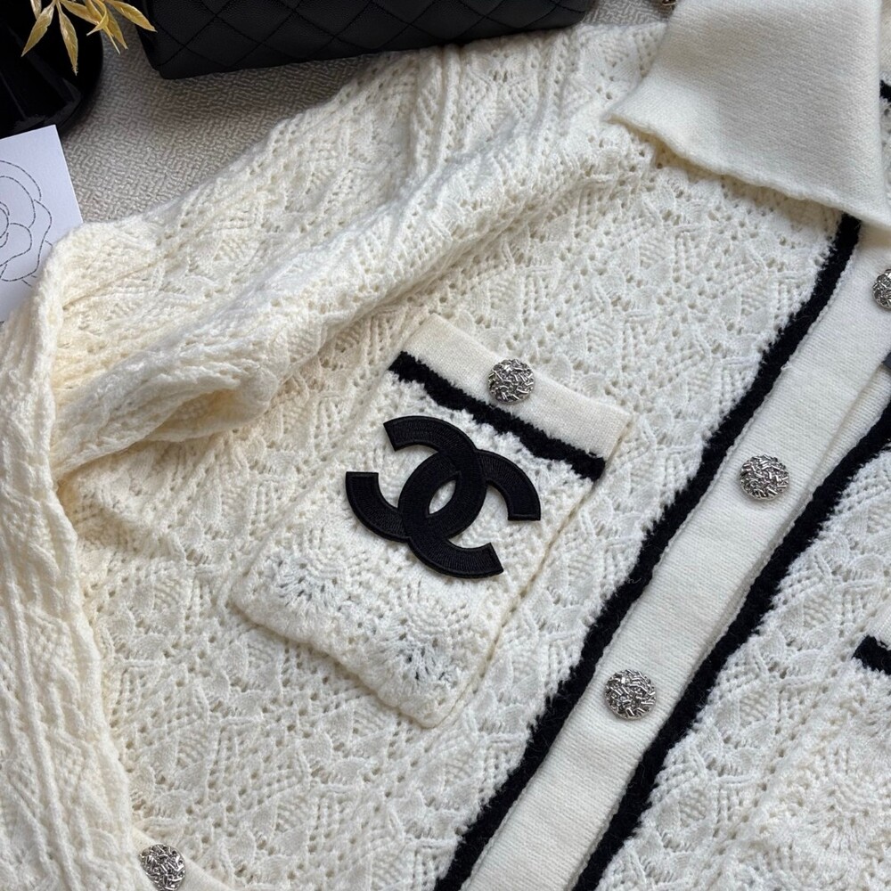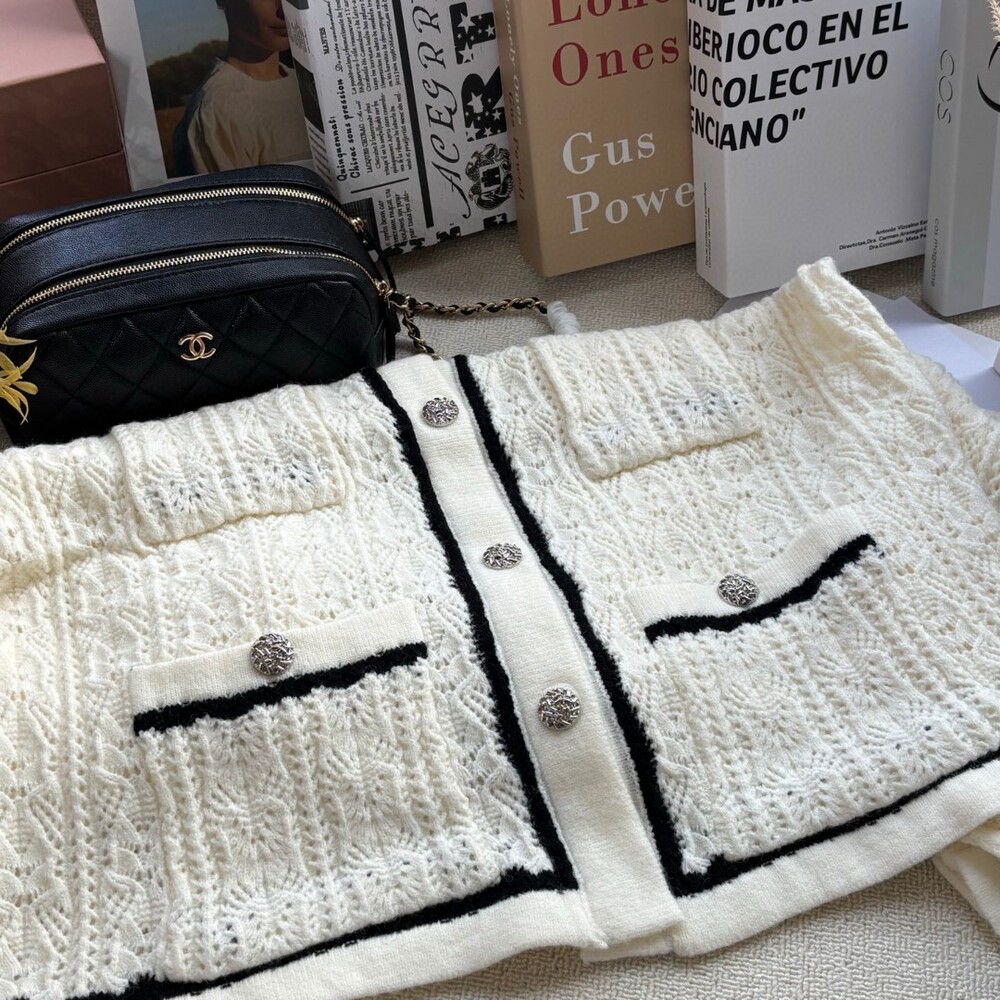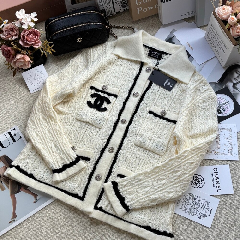 An elegant CHANEL lace knit cardigan featuring a timeless French vintage charm.