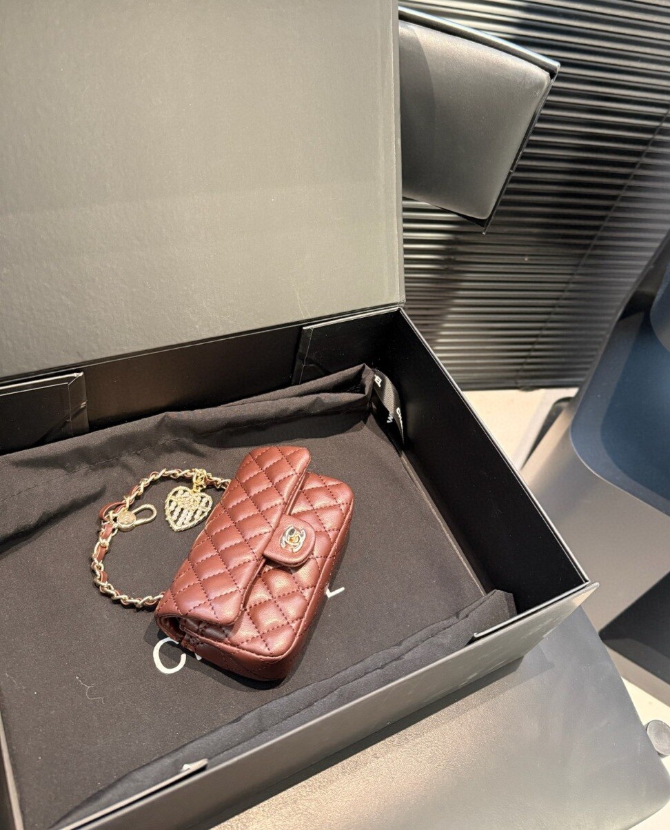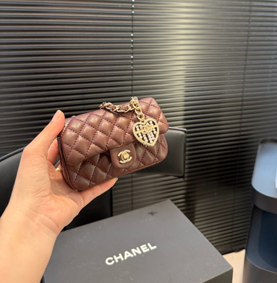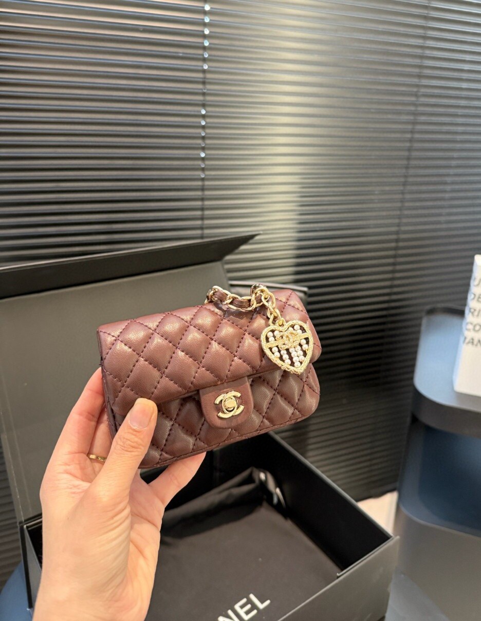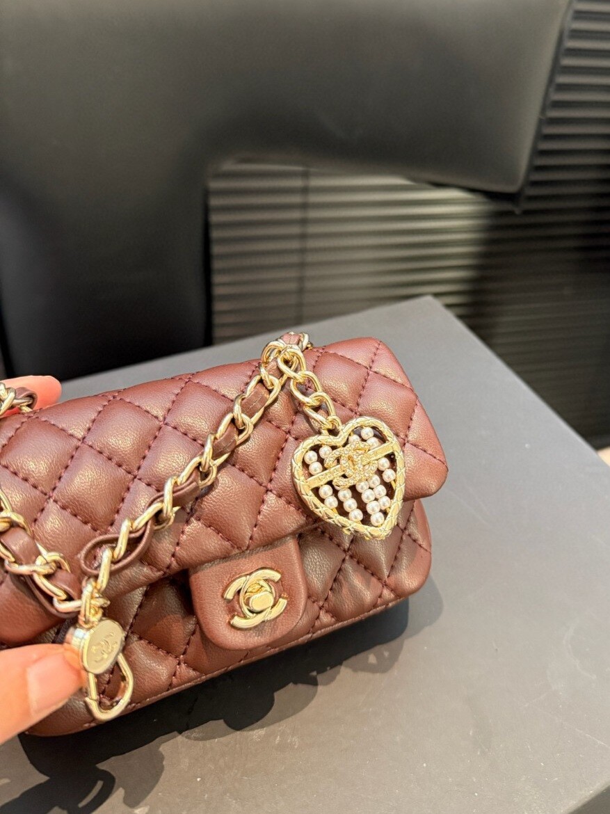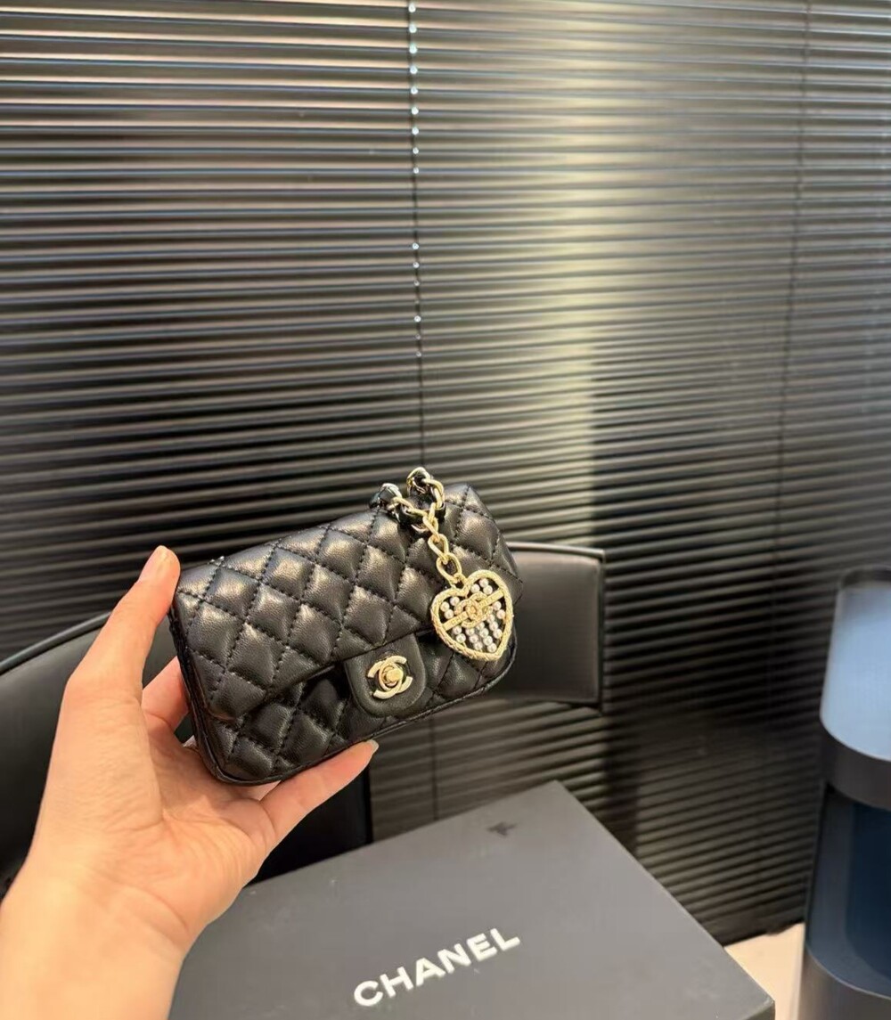 The classic black quilted texture pairs perfectly with the heart-shaped pearl charm,