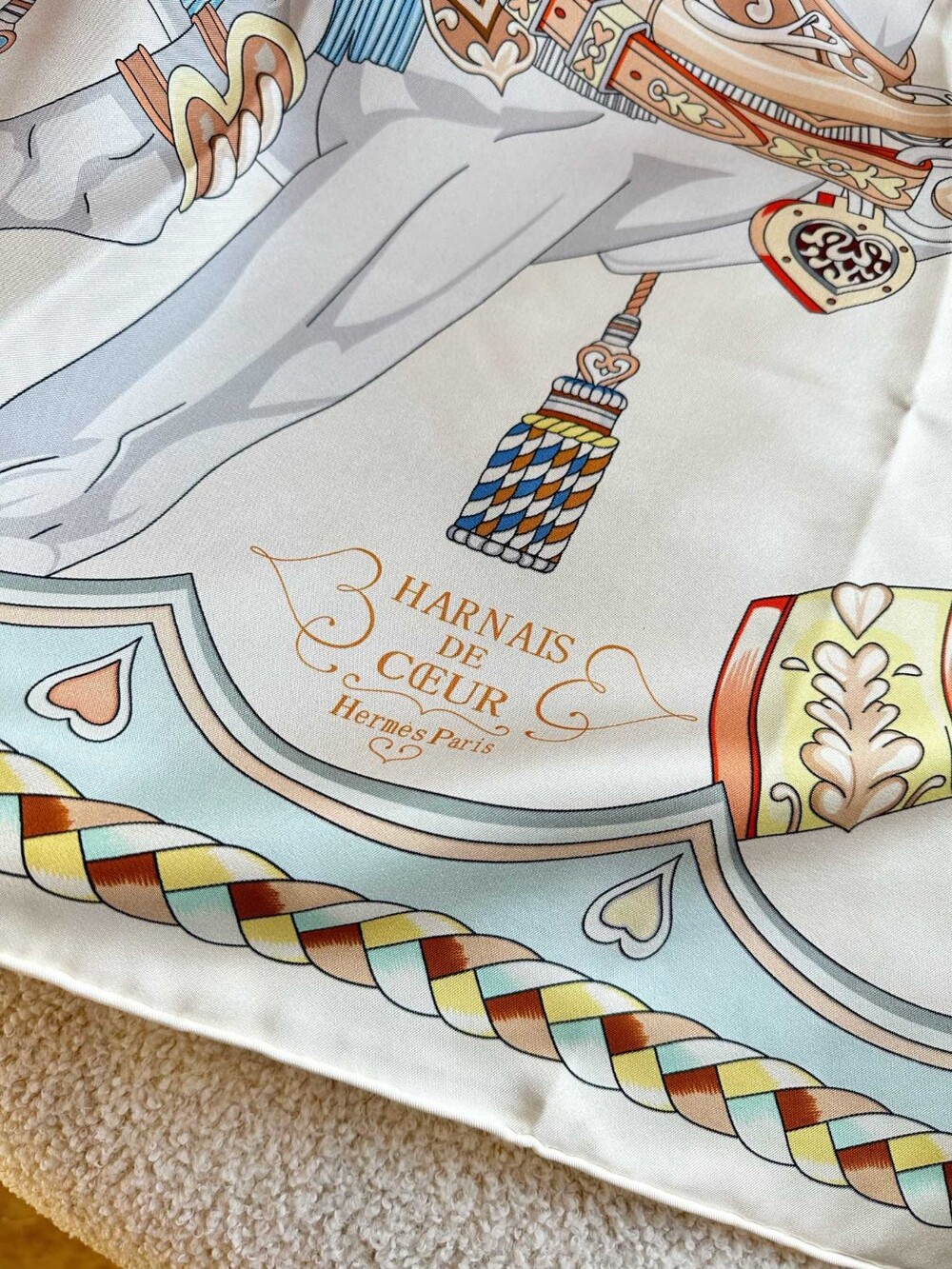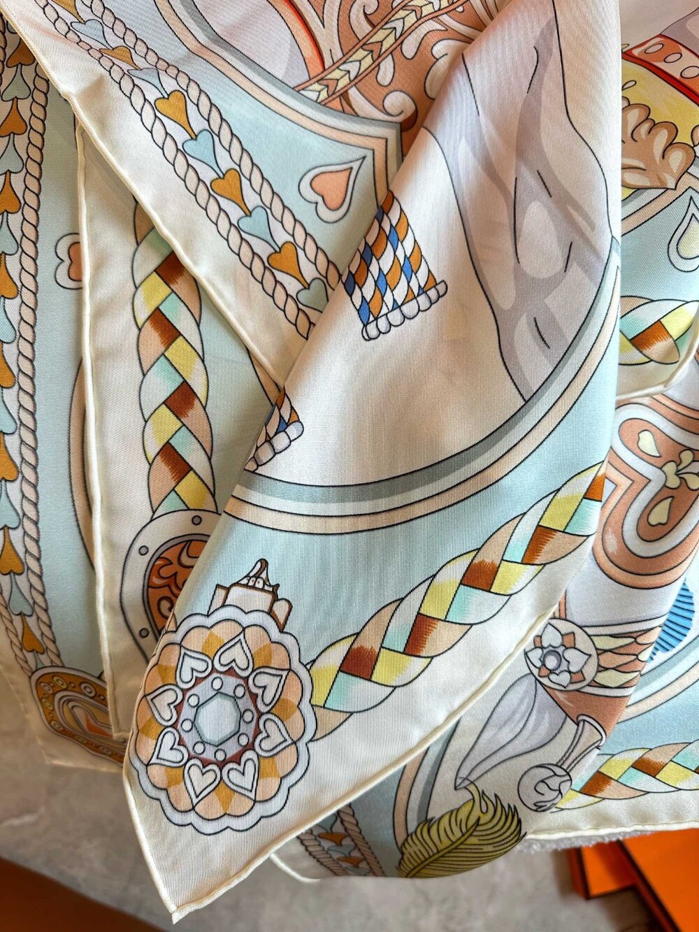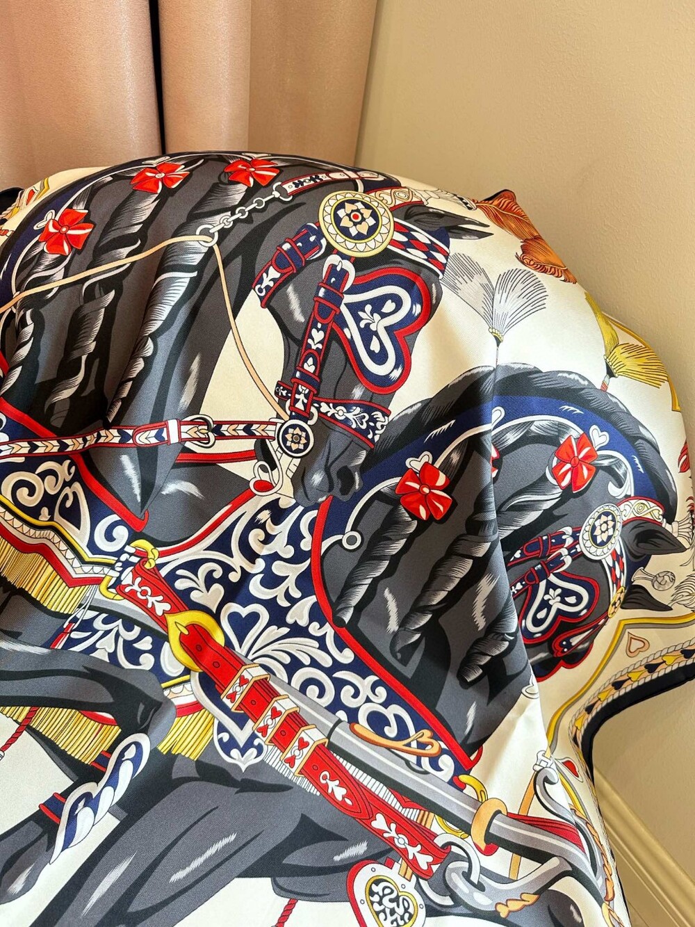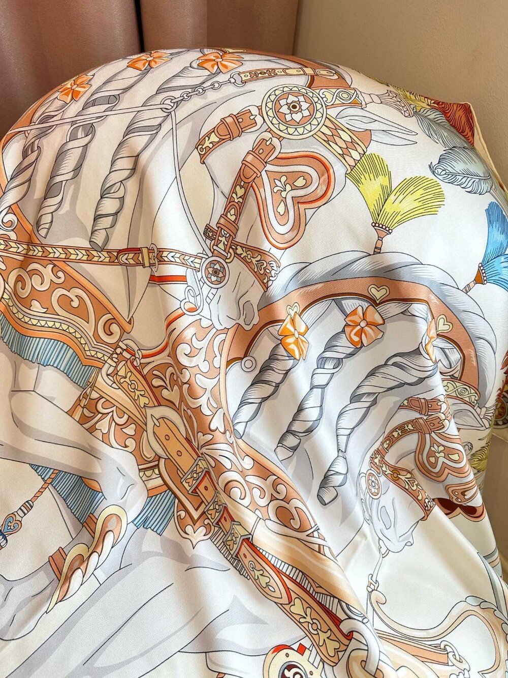 This design by Japanese artist Daiske Nomura adds a touch of romantic equestrian charm to a porcelain plate originally designed in 1804 by Fontaine & Percier, two celebrated French architects and decorators. This original plate, now part of Émile Hermès’ private collection, features a charming motif that, two centuries later, has been reimagined into a pair of lovers in love – playfully portrayed as romantic riders in the design.Fabric: 100% 18mm silk twill