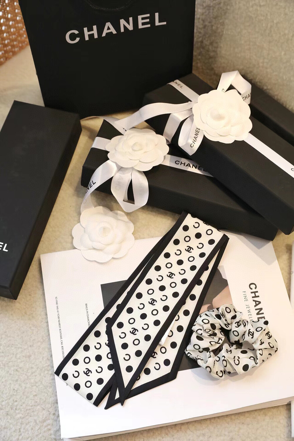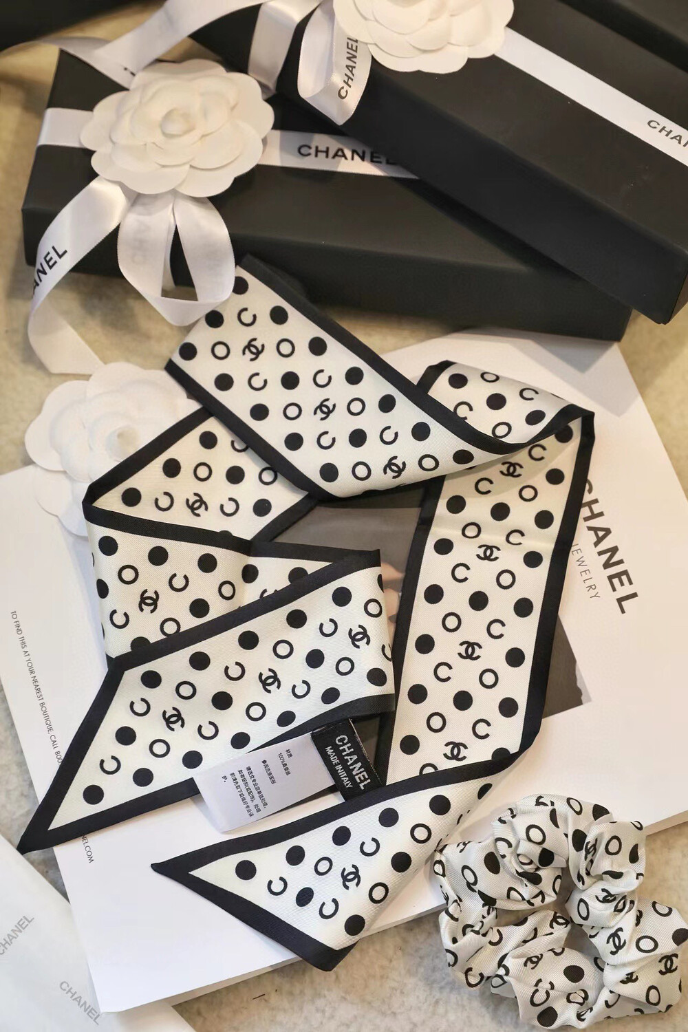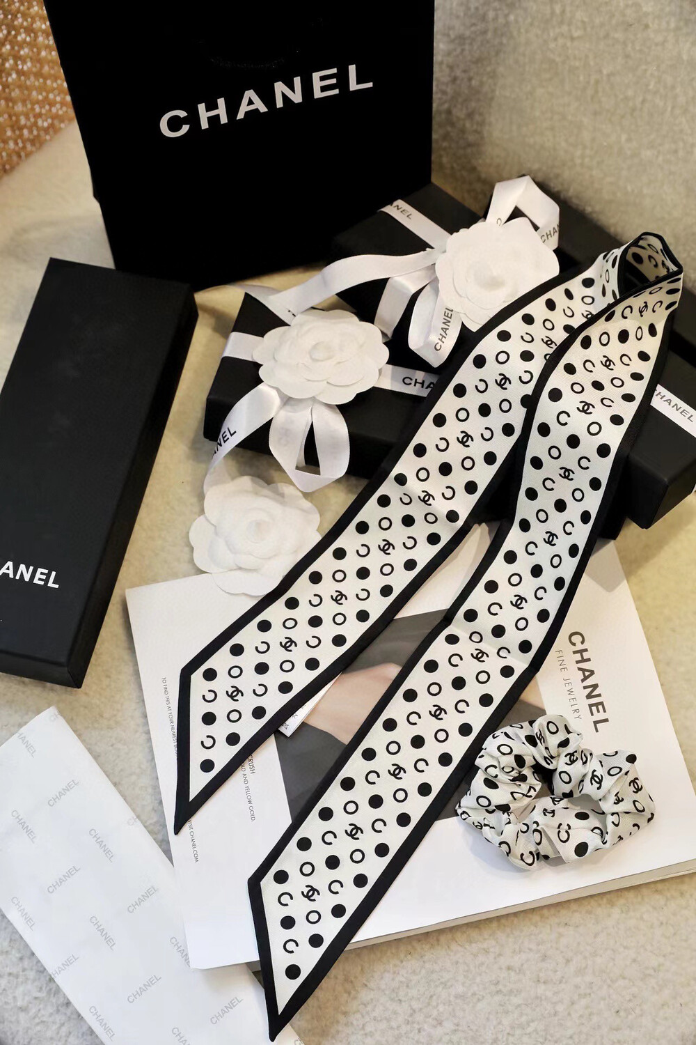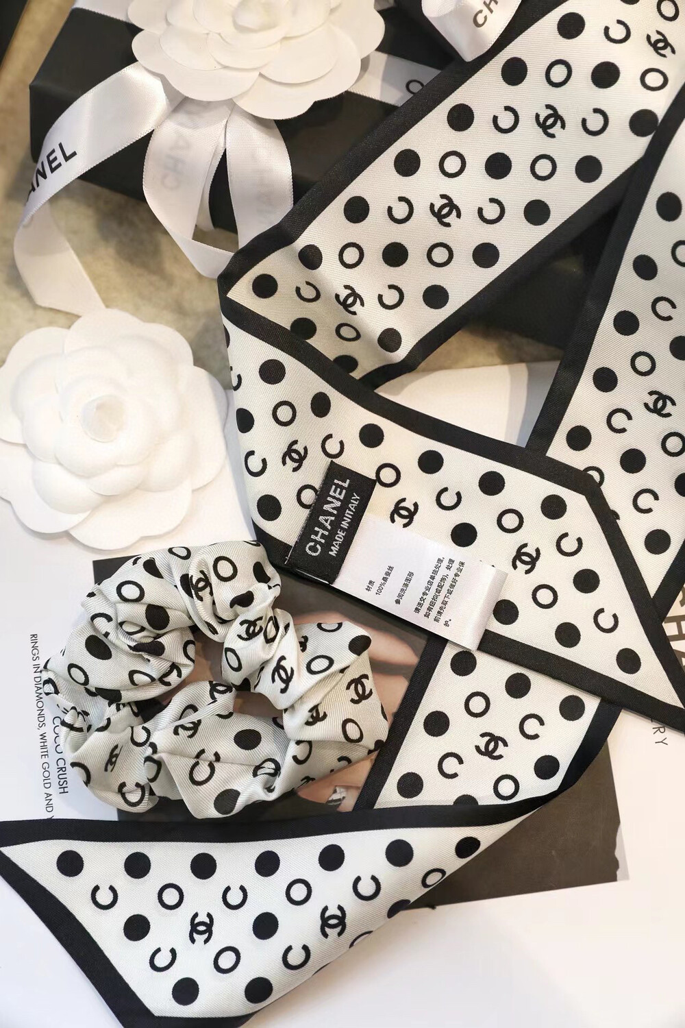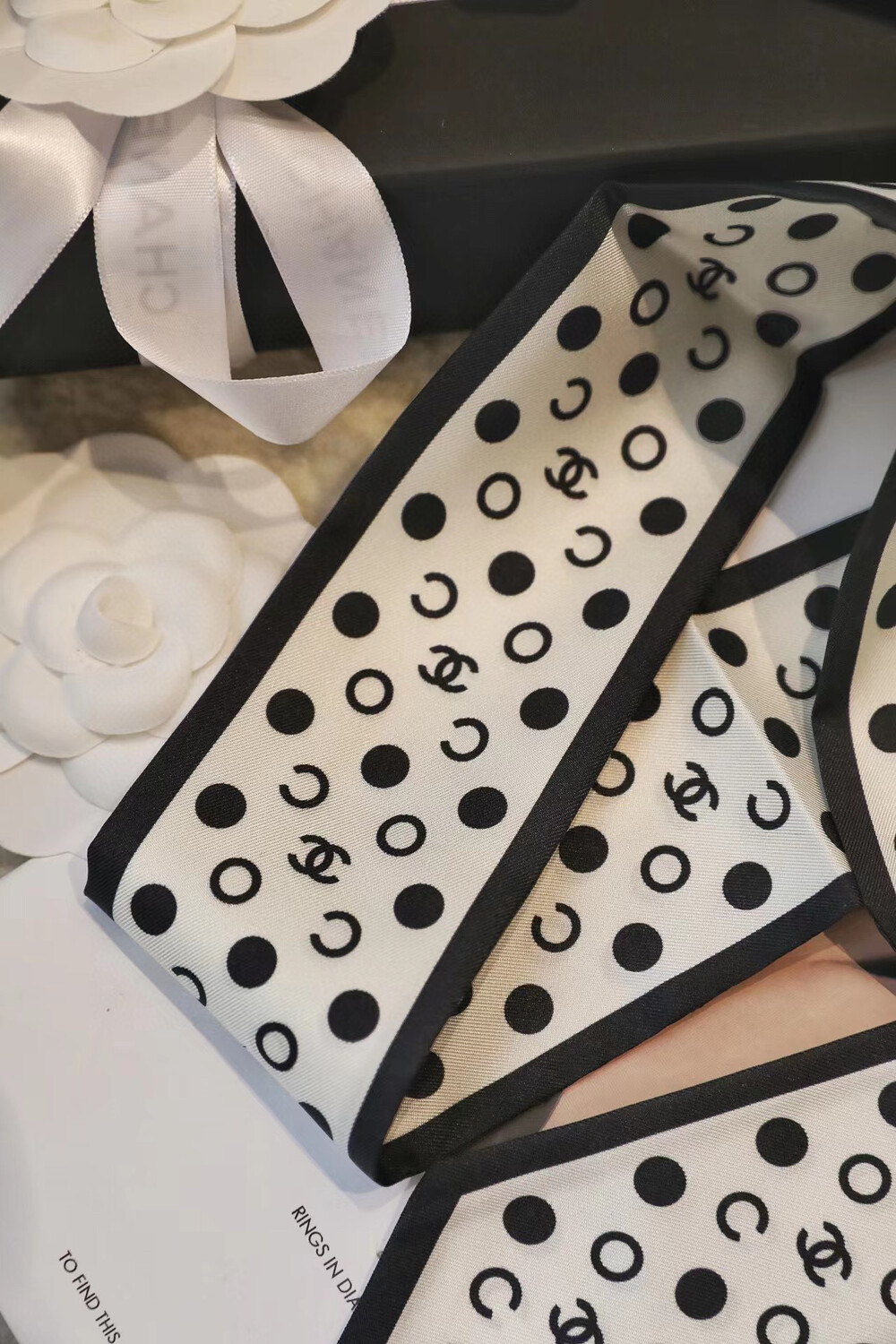 with gift box package, white wave dot camellia bow girl heart ring,Chanel really knows a lot about girls. The silk hair rings of dark-patterned jacquard are really cool.Very French temperament, heavy dark-patterned jacquard silk fabric, how to use are good-looking, black beige two colorsMaterial: 100% silk