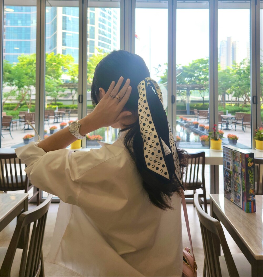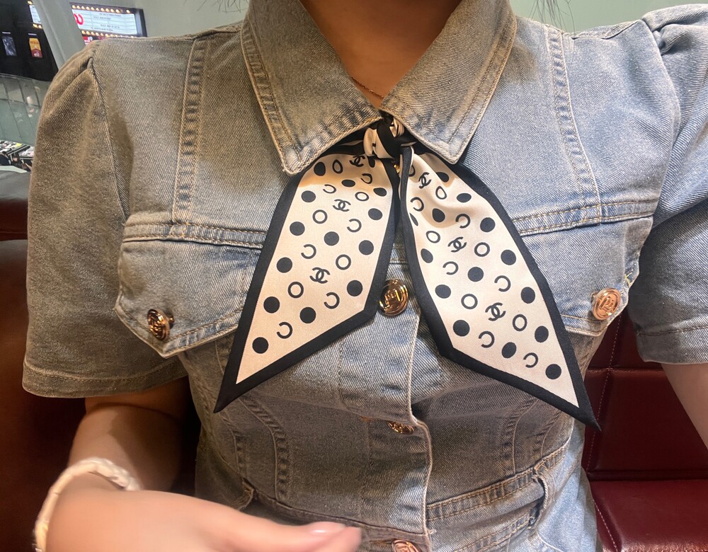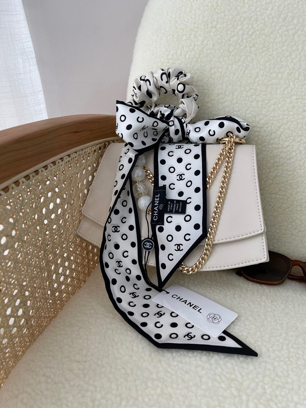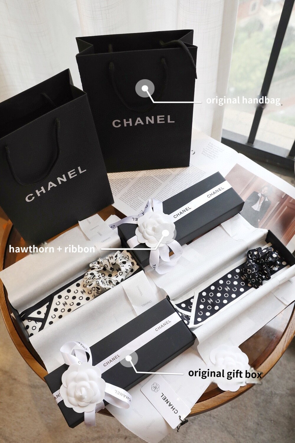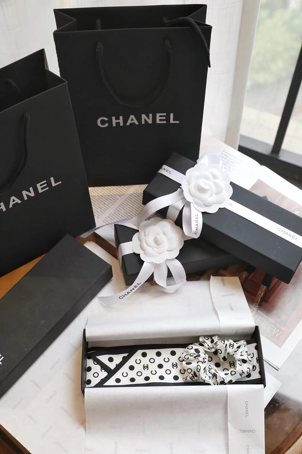 with gift box package, white wave dot camellia bow girl heart ring,Chanel really knows a lot about girls. The silk hair rings of dark-patterned jacquard are really cool.Very French temperament, heavy dark-patterned jacquard silk fabric, how to use are good-looking, black beige two colorsMaterial: 100% silk