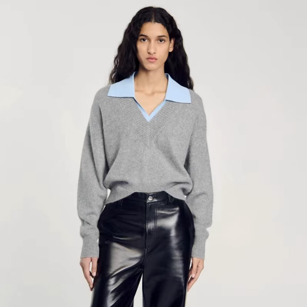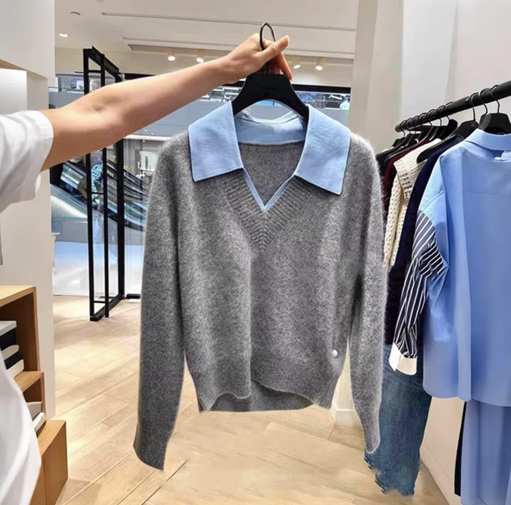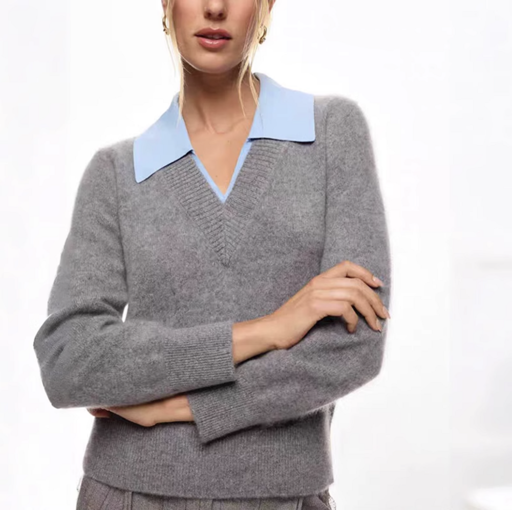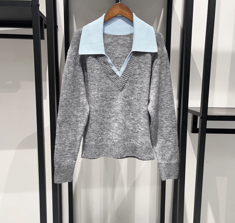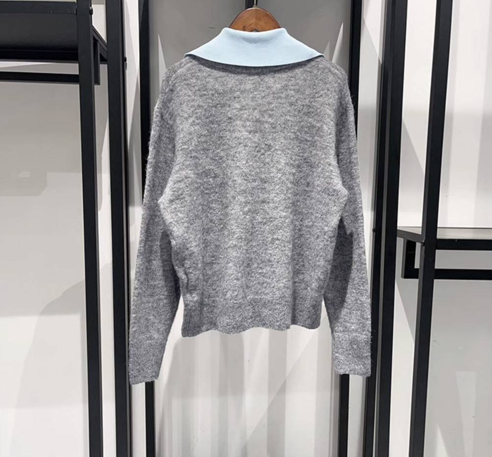 심플한 회색 브이넥 니트에 블루 카라로 포인트를 준 디자인이에요