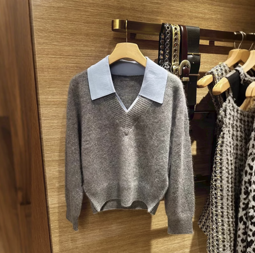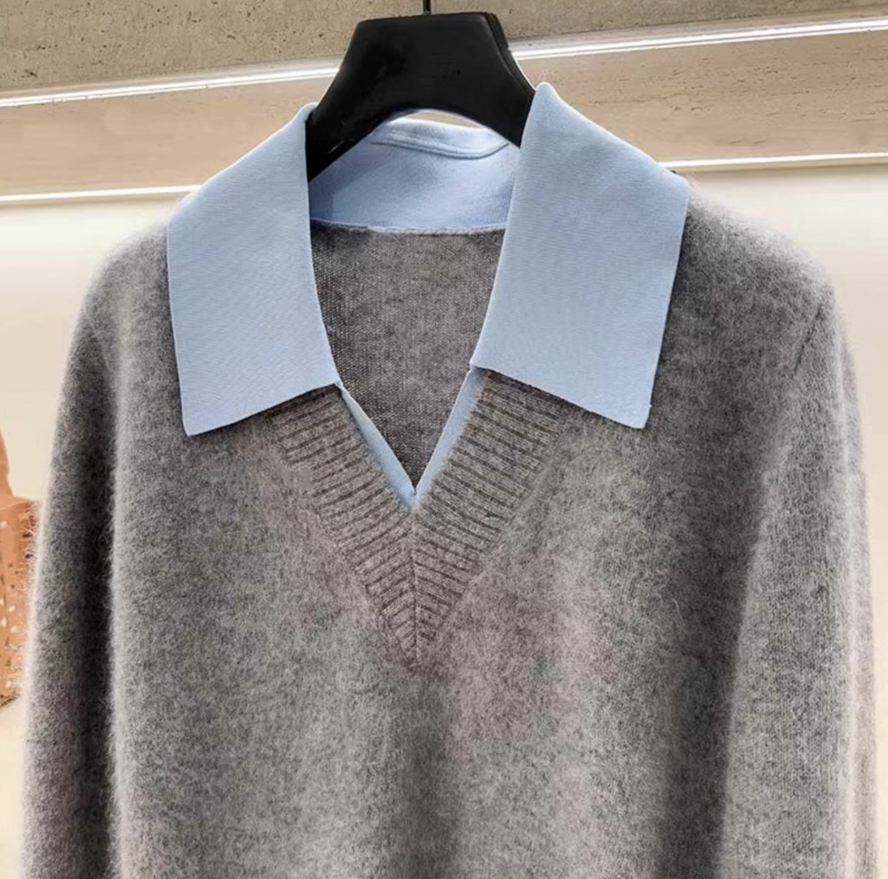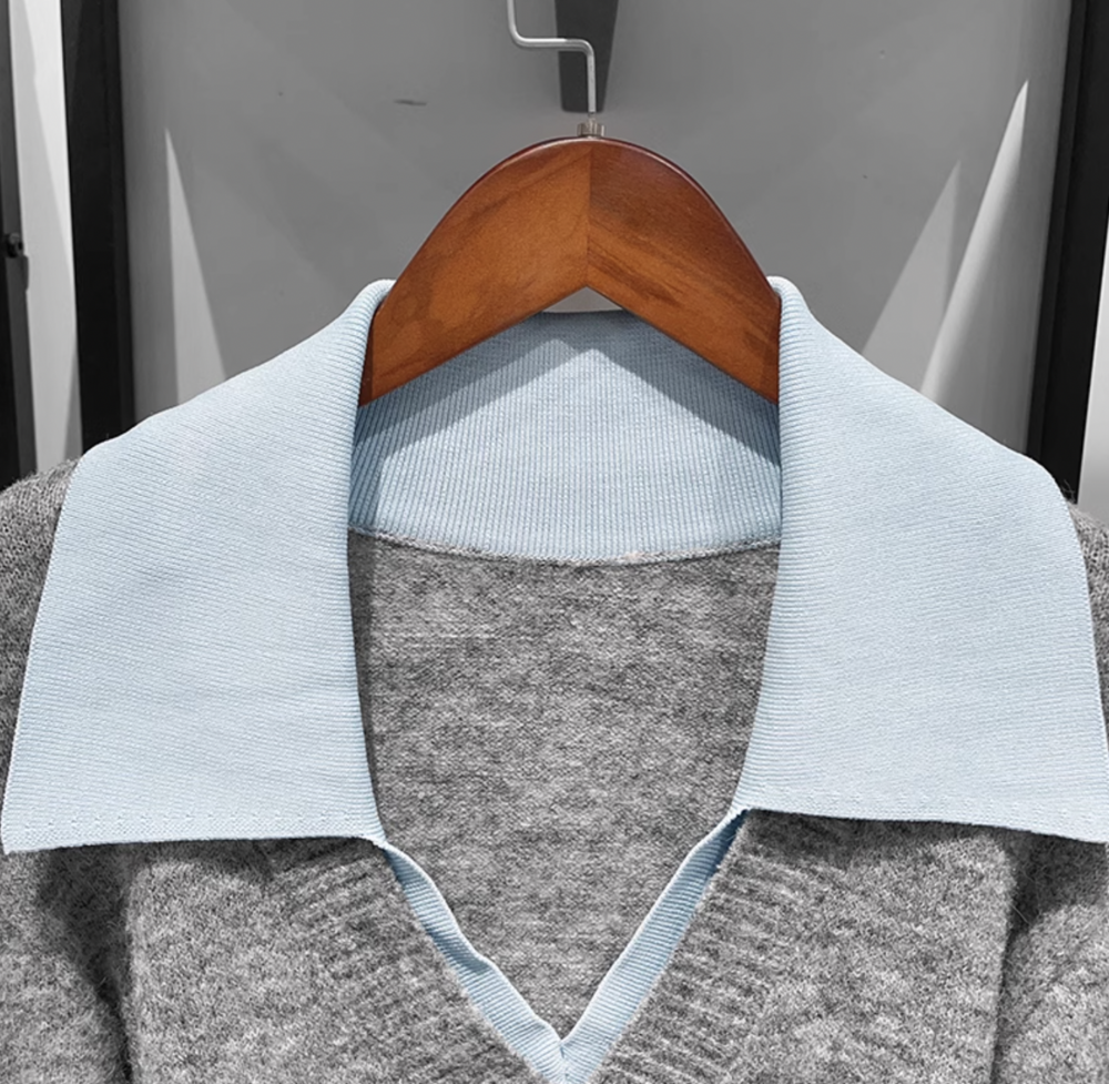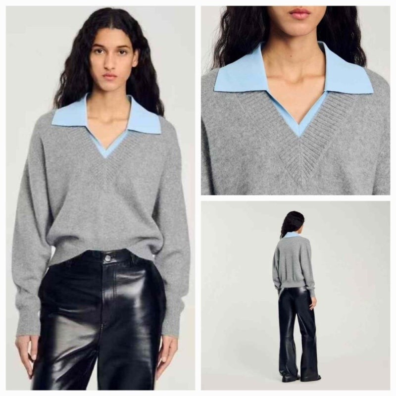 심플한 회색 브이넥 니트에 블루 카라로 포인트를 준 디자인이에요