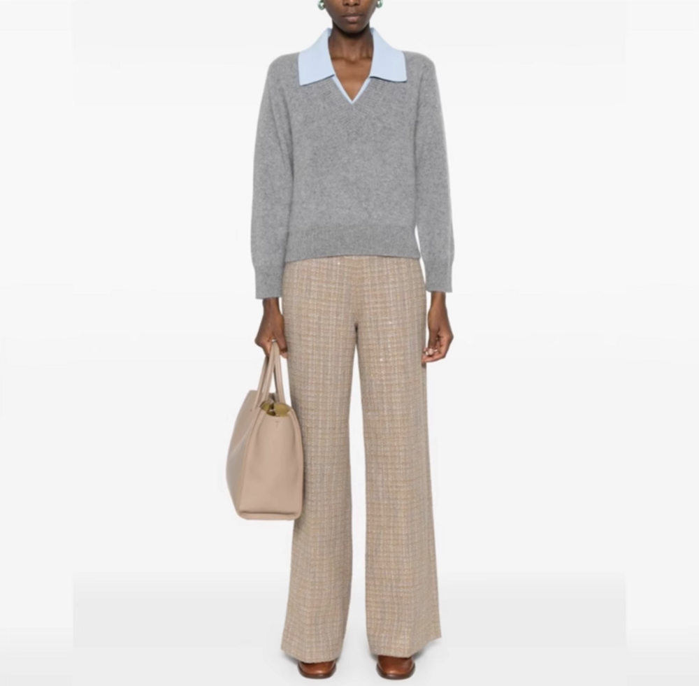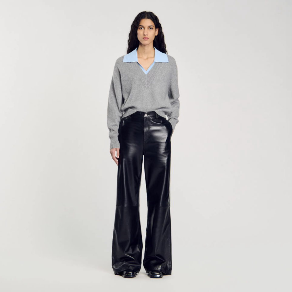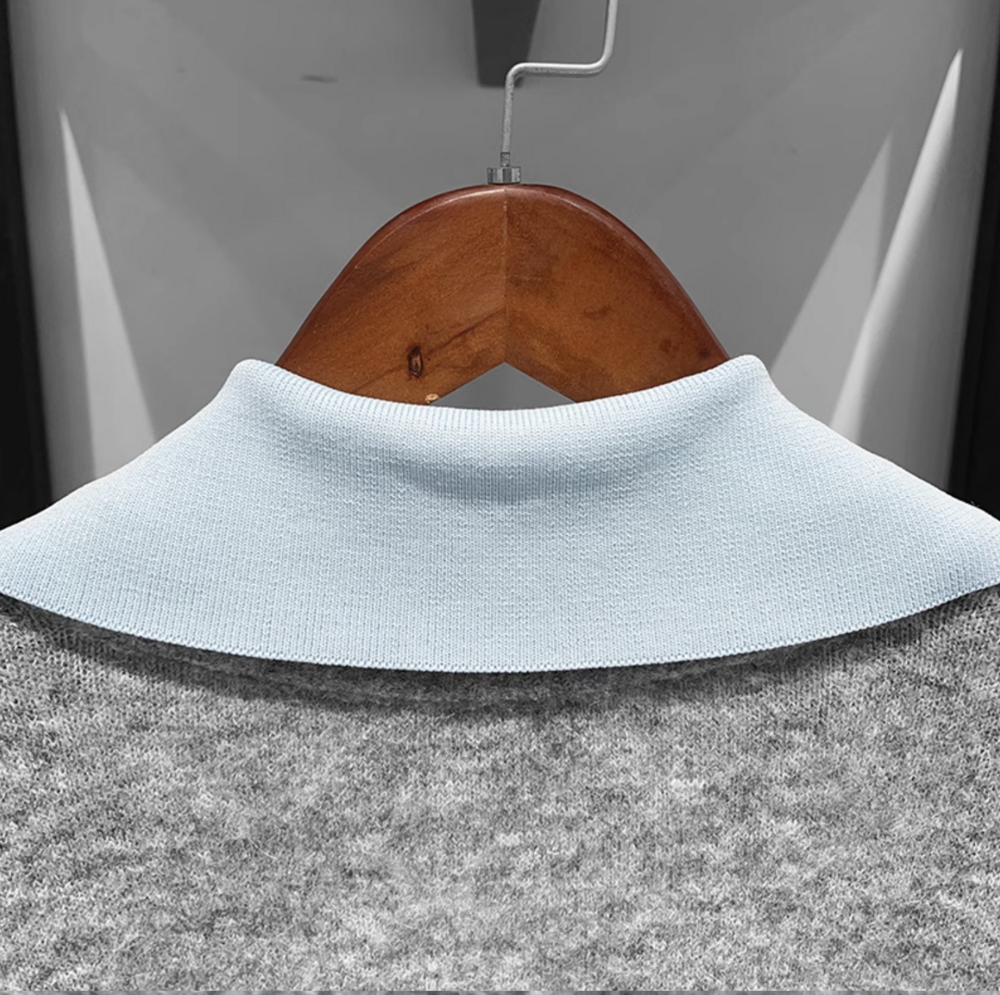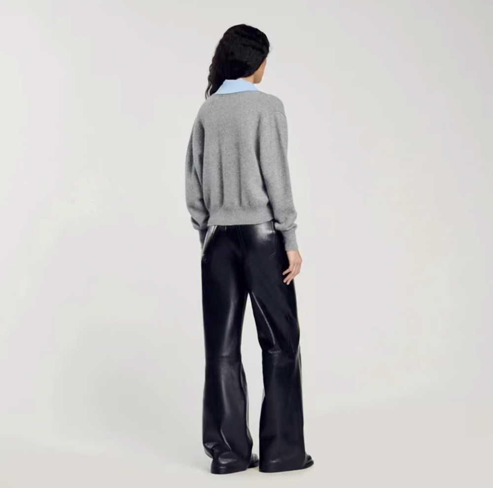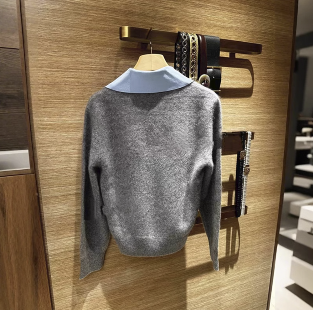 심플한 회색 브이넥 니트에 블루 카라로 포인트를 준 디자인이에요