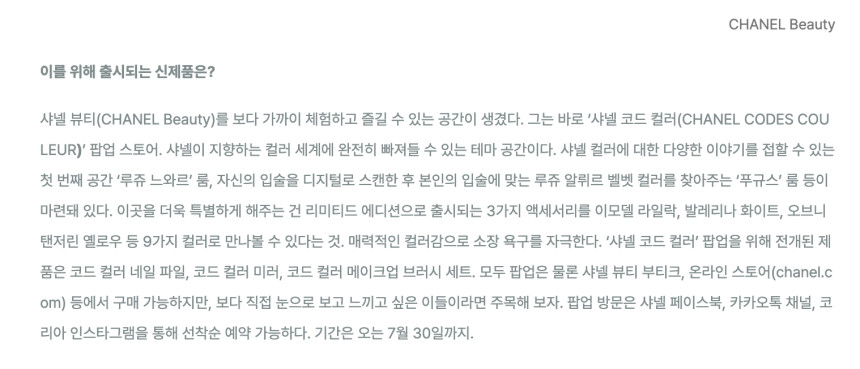아래부터는 샤넬이 지향하는 컬러 세계를 보여주는