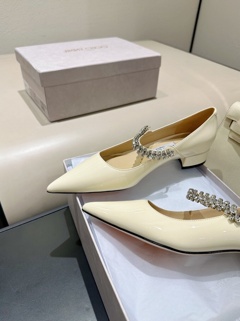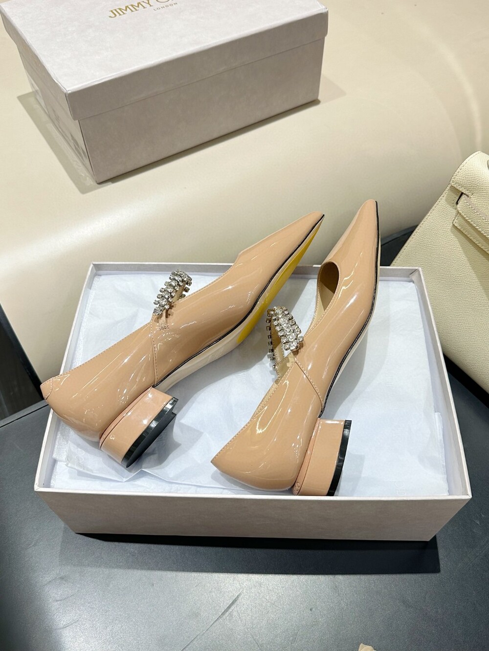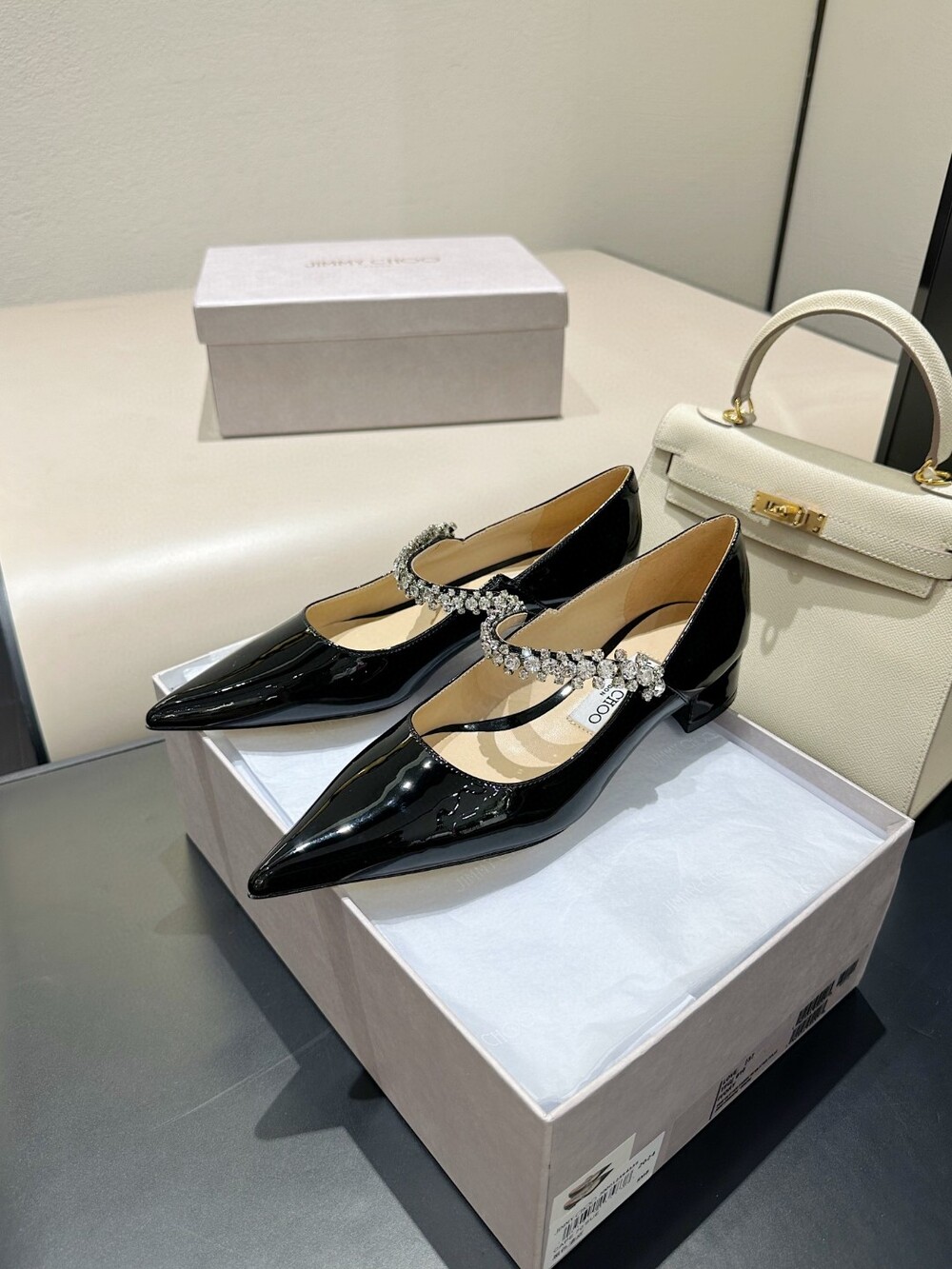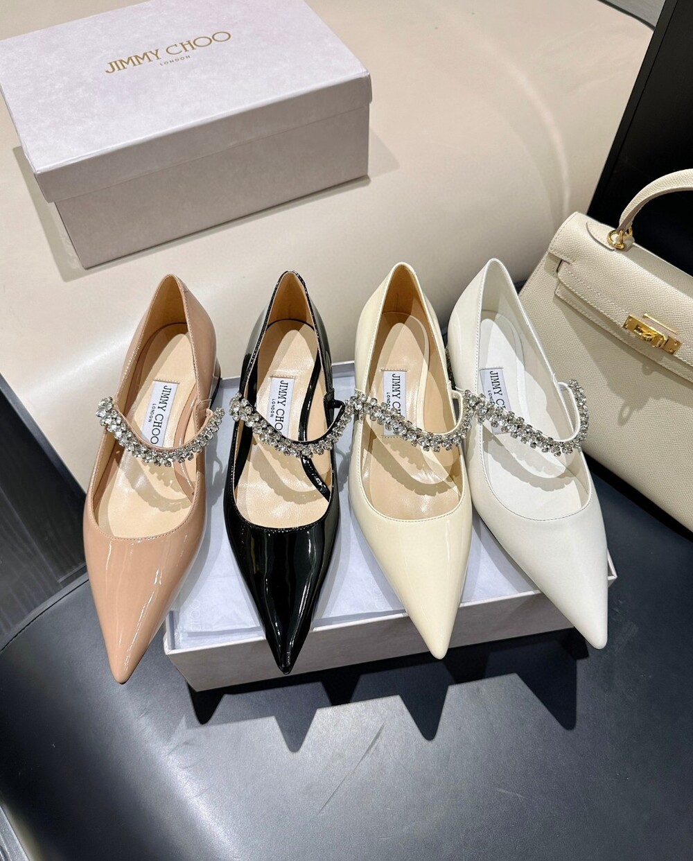 지미 특유의 빙 스톤 장식이 발을 화사하게 만들어주면서
