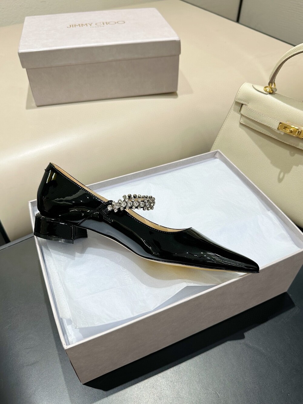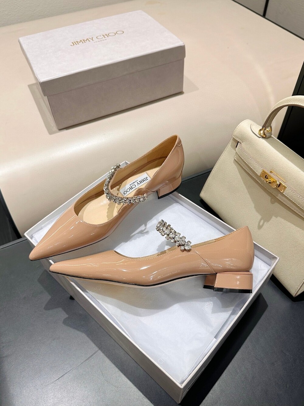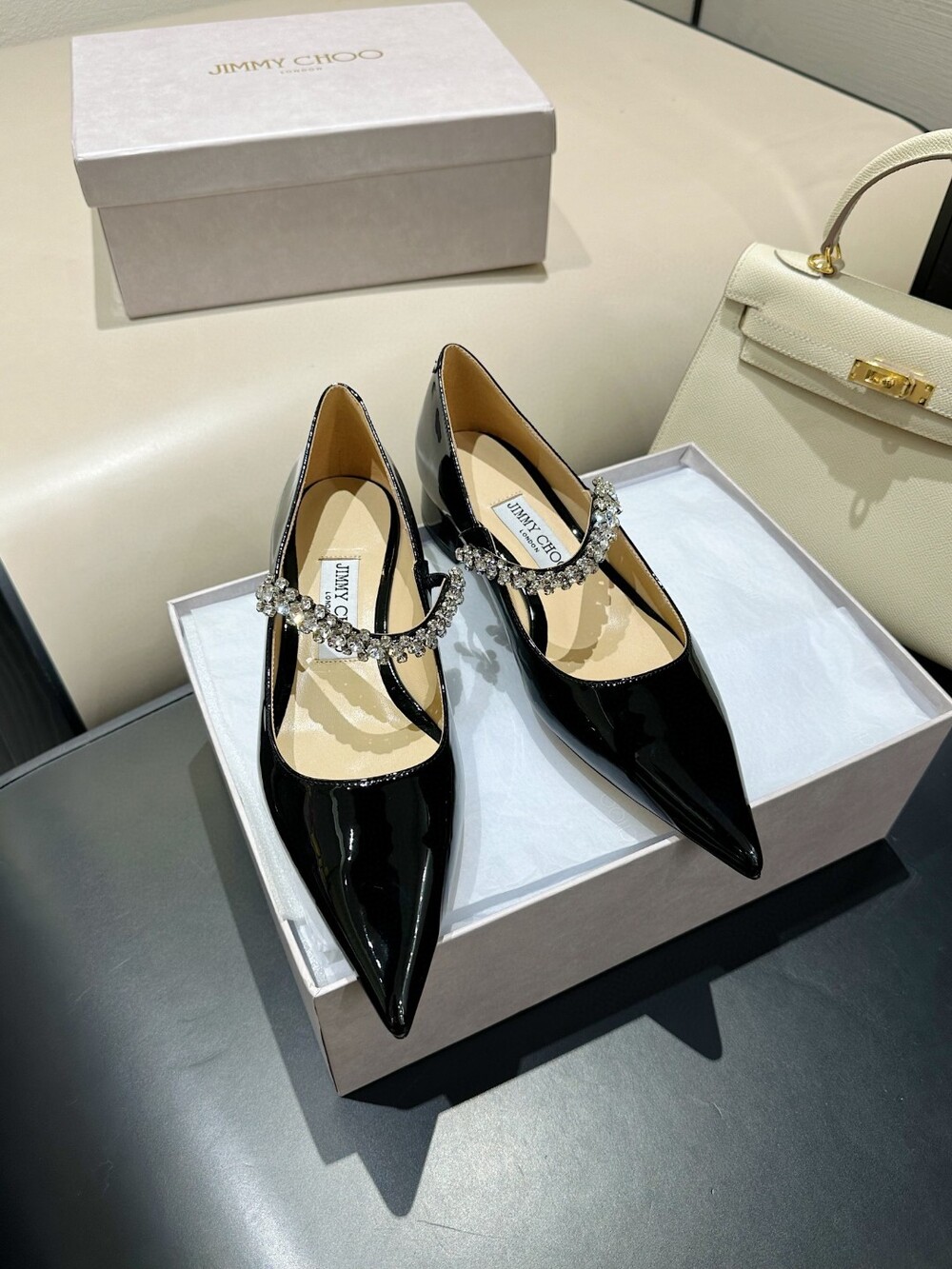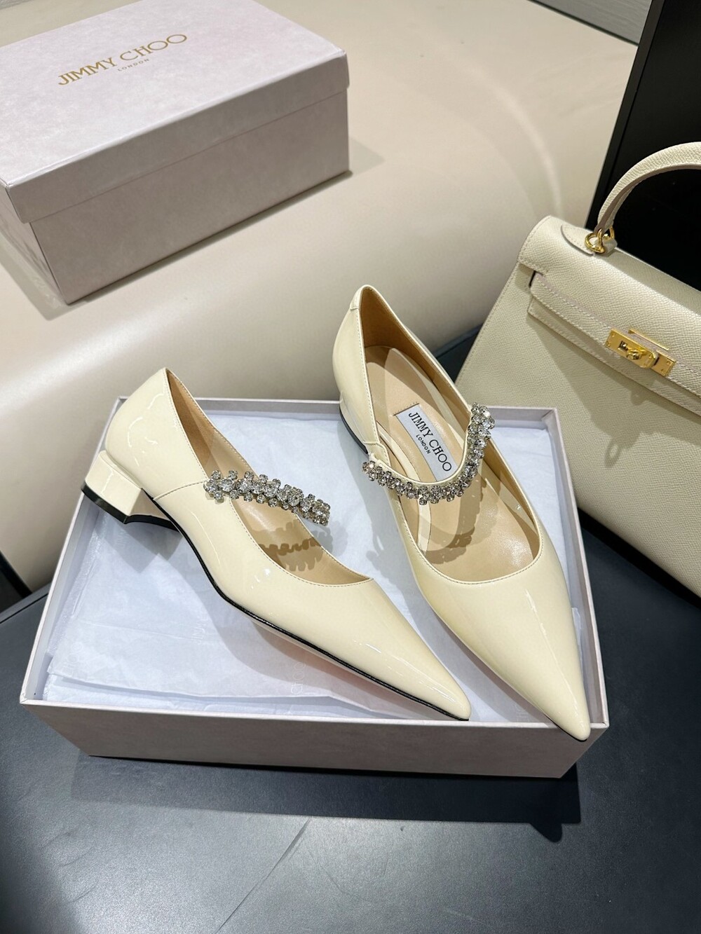 지미 특유의 빙 스톤 장식이 발을 화사하게 만들어주면서