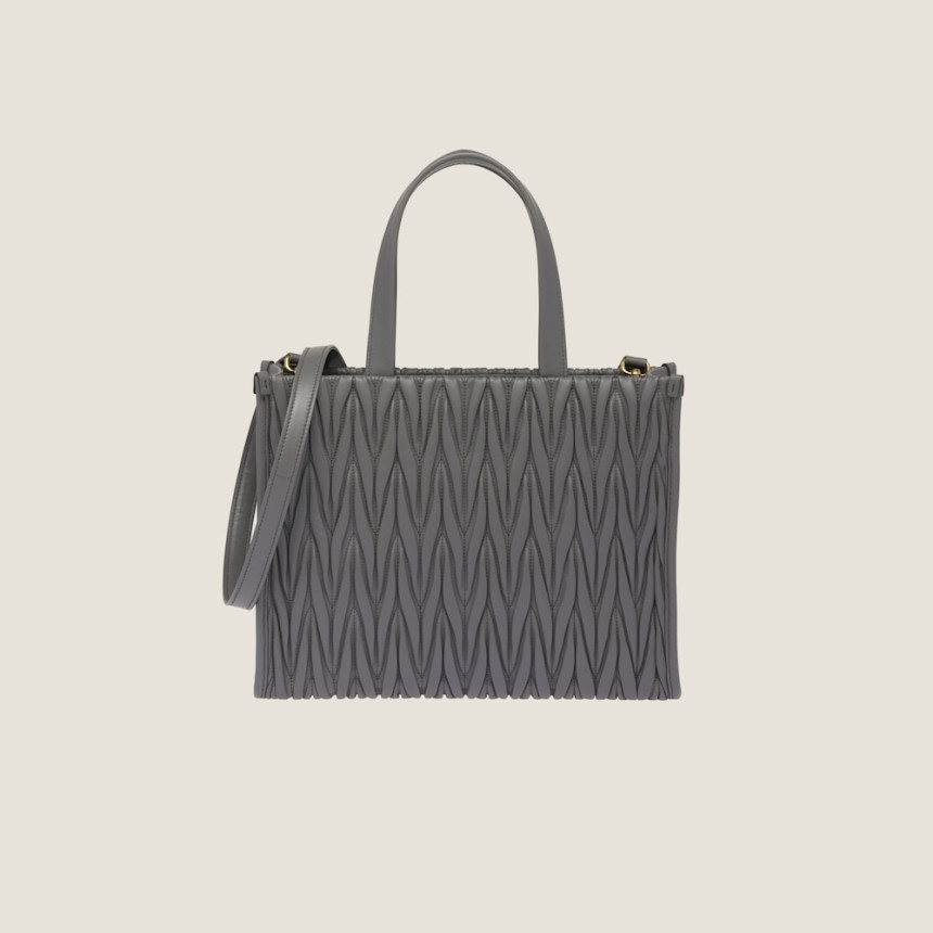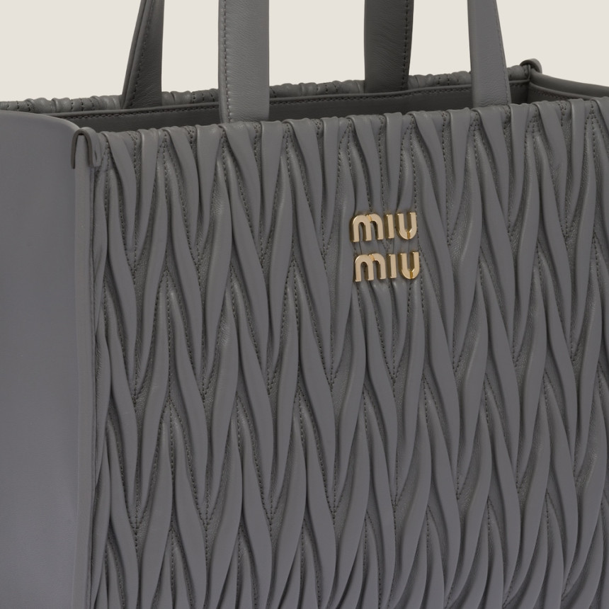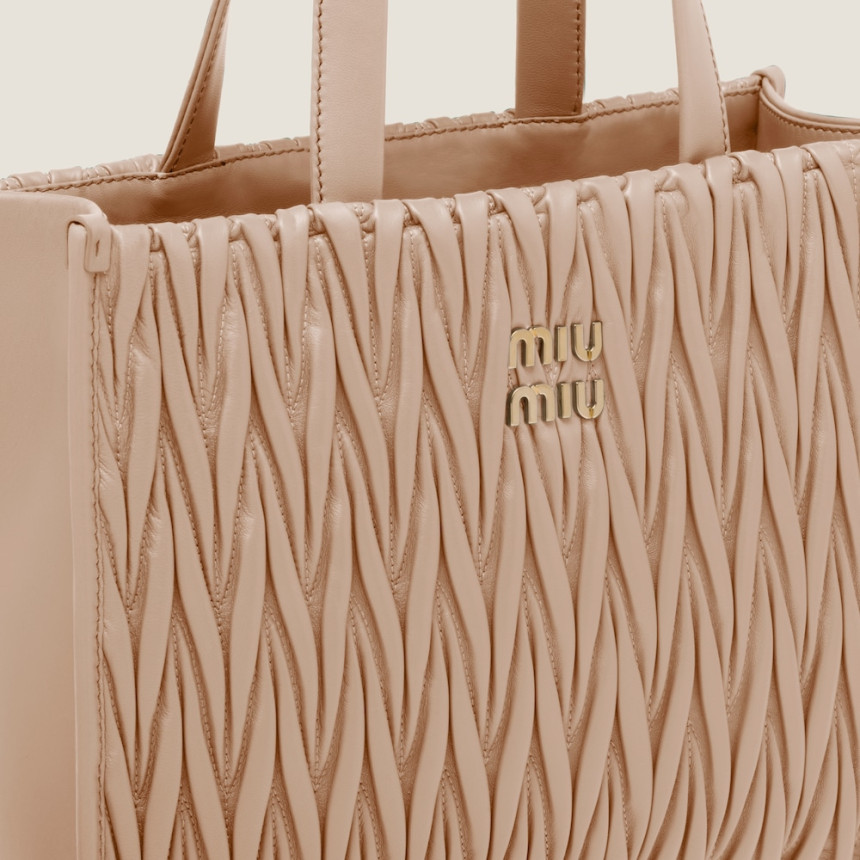 Fine matelasse workmanship updates the dynamic, versatile, and cosmopolitan silhouette of the nappa leather tote through its extremely sophisticated, textured, and three-dimensional effect. The lettering logo on the front, which echoes the different metallic finishes of the hardware, stands out against the refined artisan workmanship with an iconic and immediately recognizable feel. Leather handles, the removable shoulder strap and internal pockets contribute to the functional and modern design of the bag.
