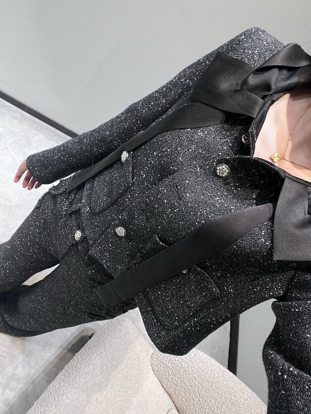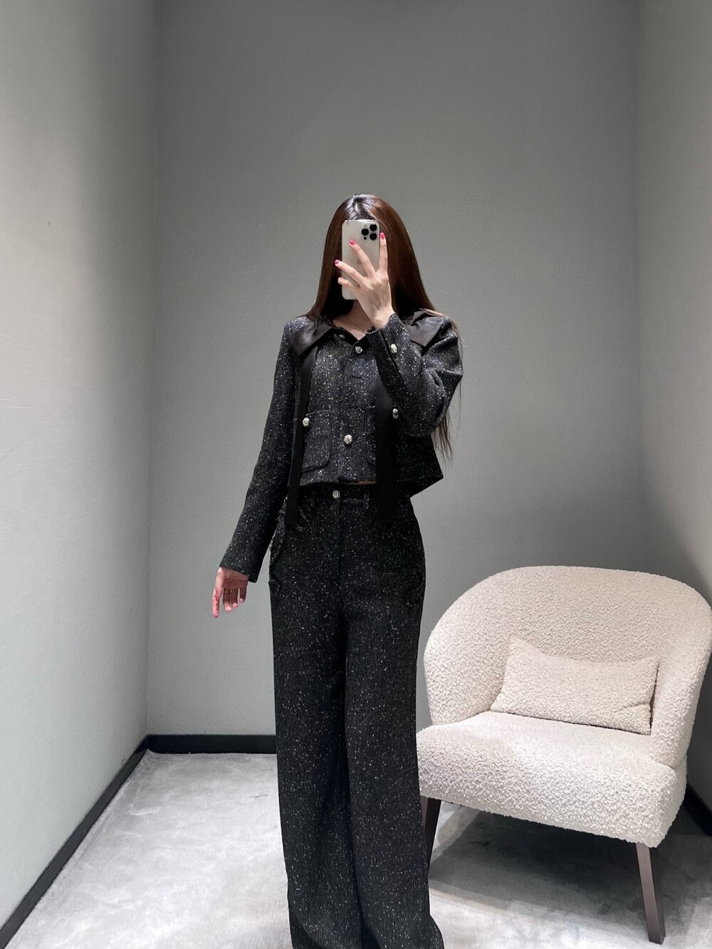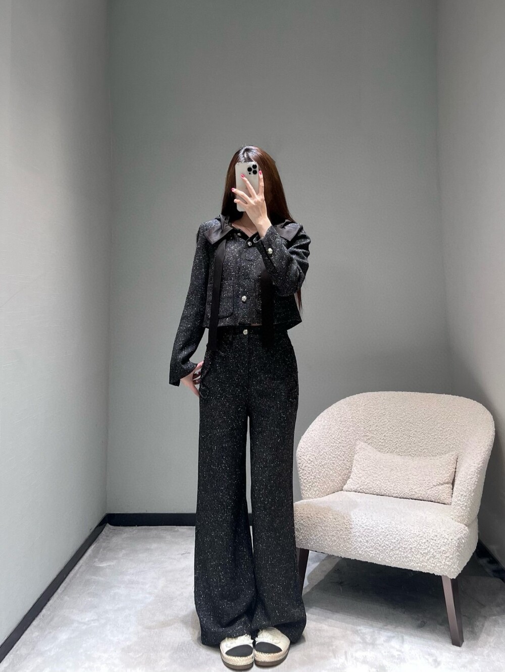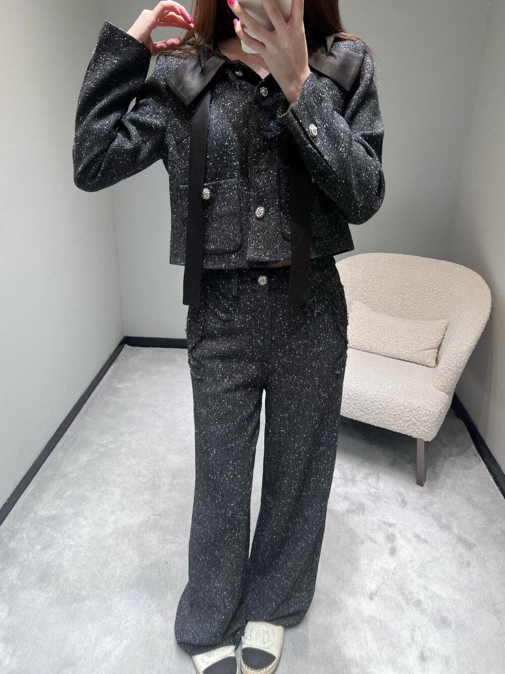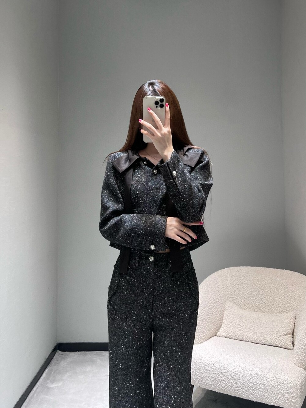 블랙 트위드 베이스에 실버 반짝임이 은은하게 섞인 고급스러운 셋업이에요
