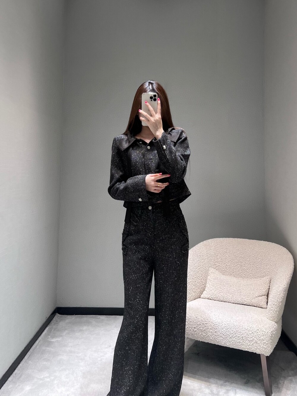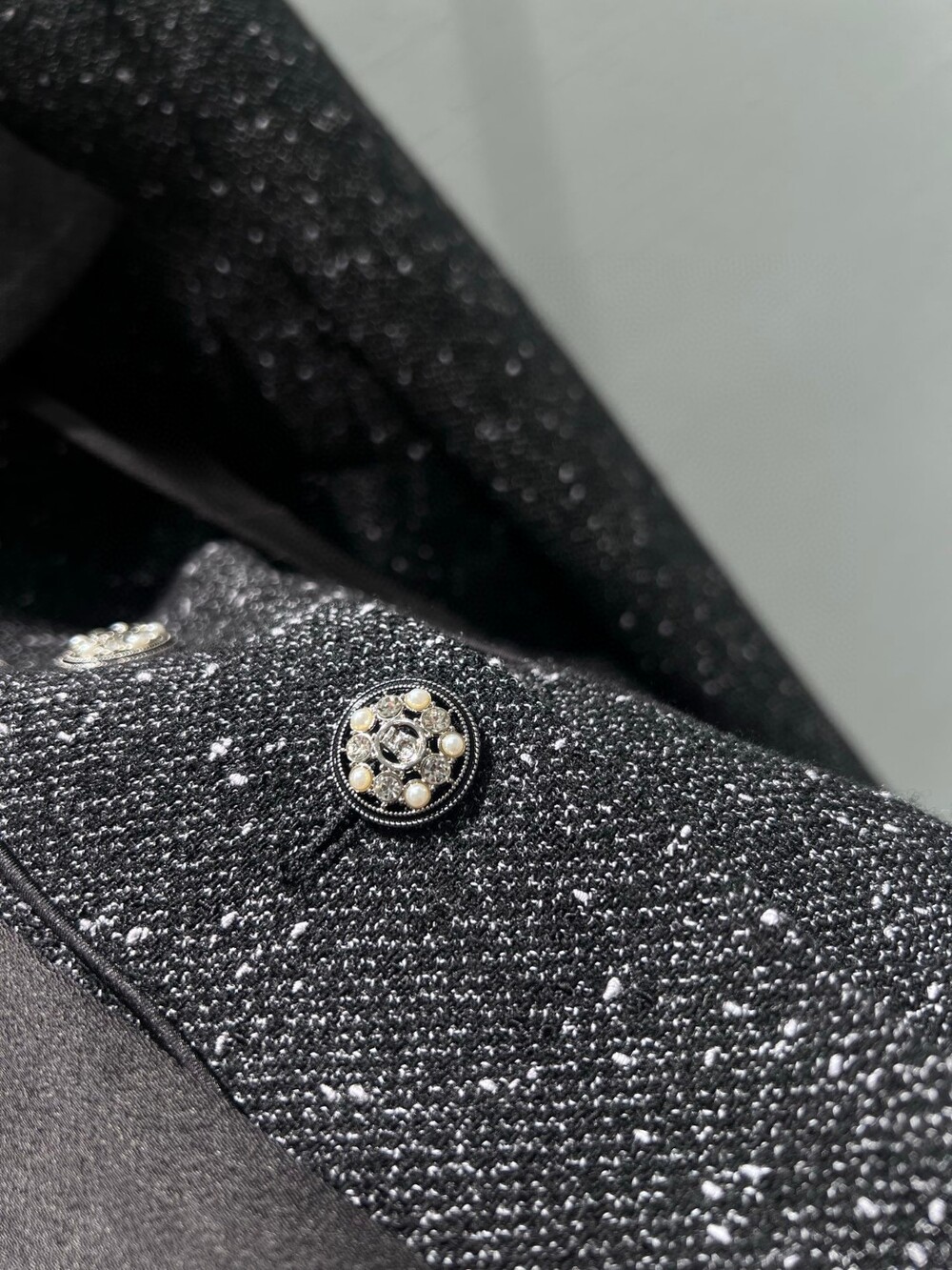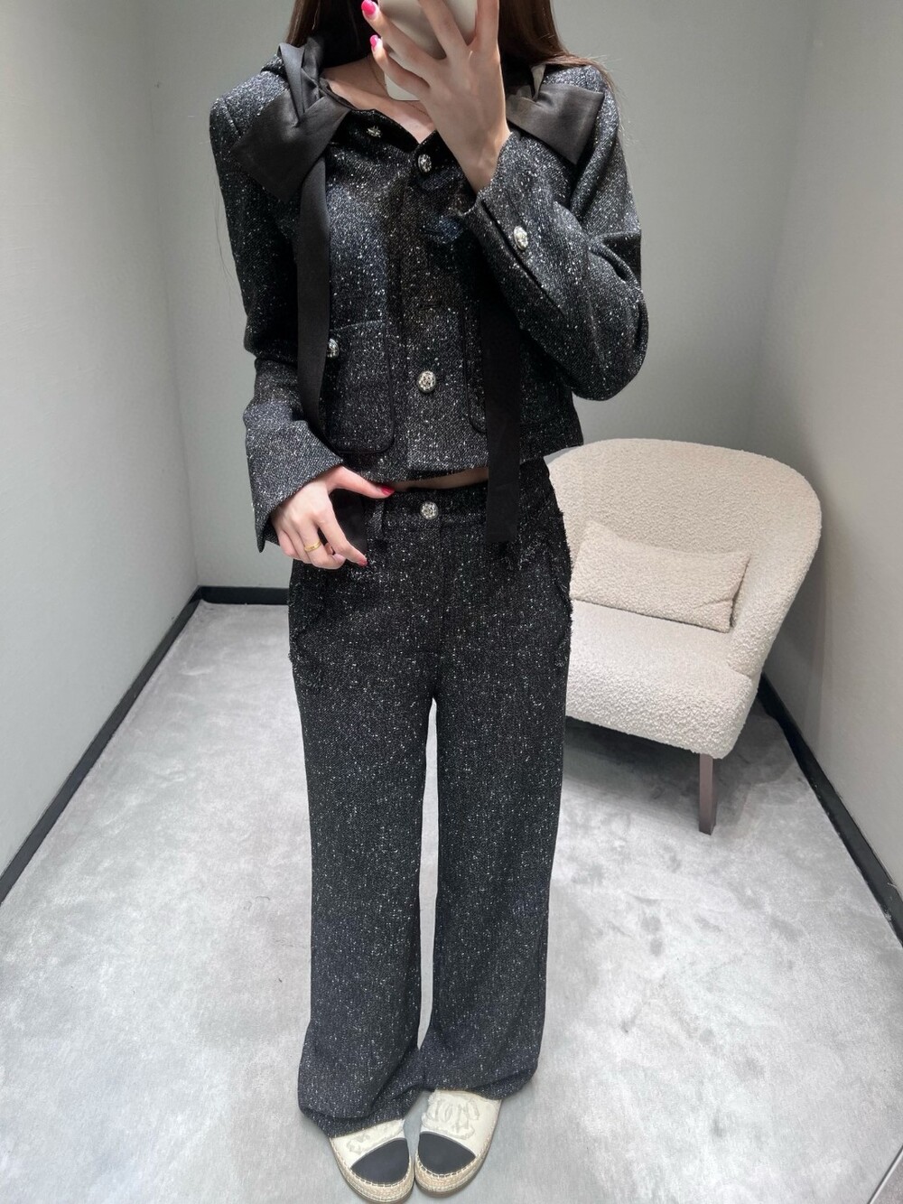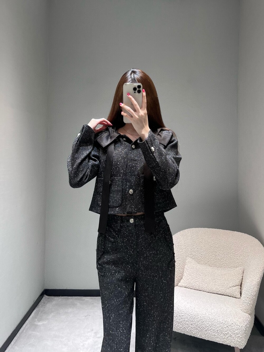 블랙 트위드 베이스에 실버 반짝임이 은은하게 섞인 고급스러운 셋업이에요