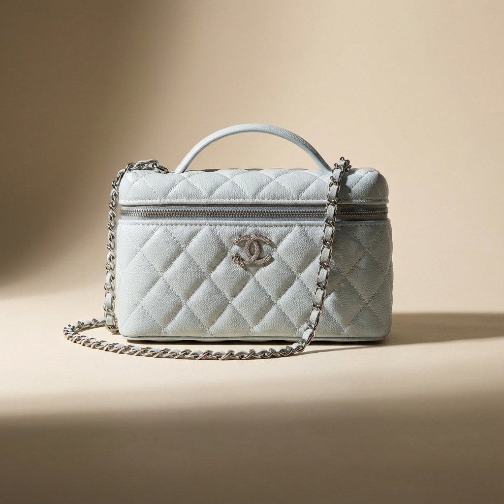 퀼팅 텍스처와 은은한 펄감, 실버 체인 스트랩이 어우러져