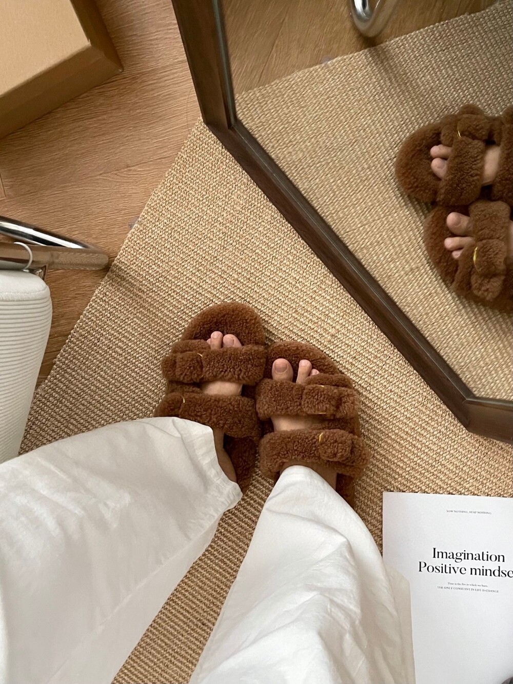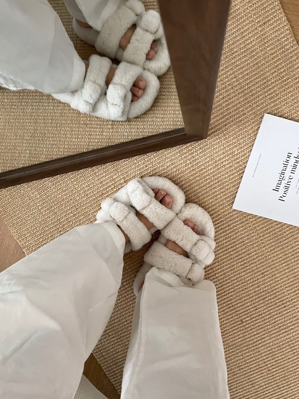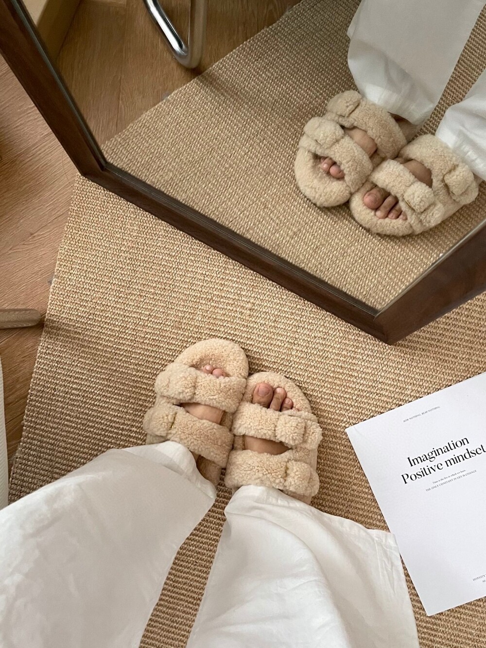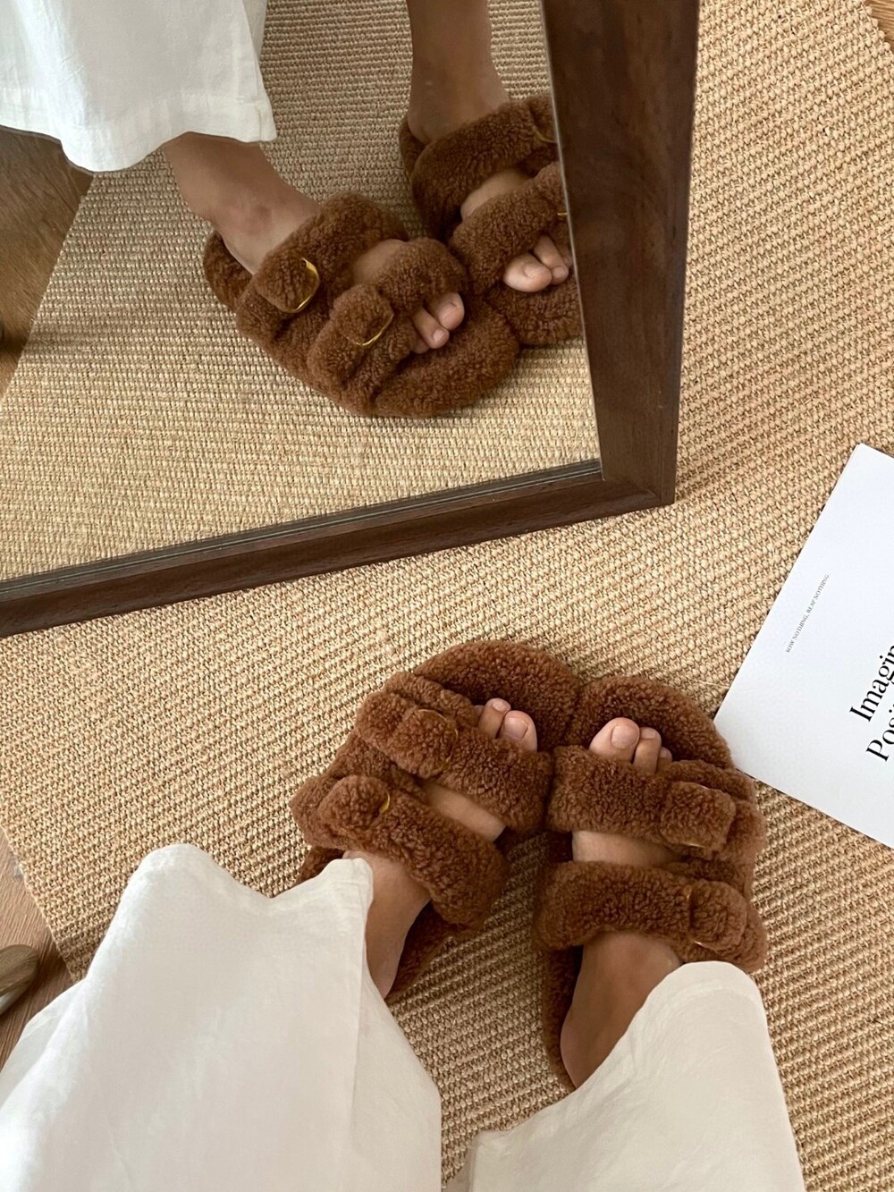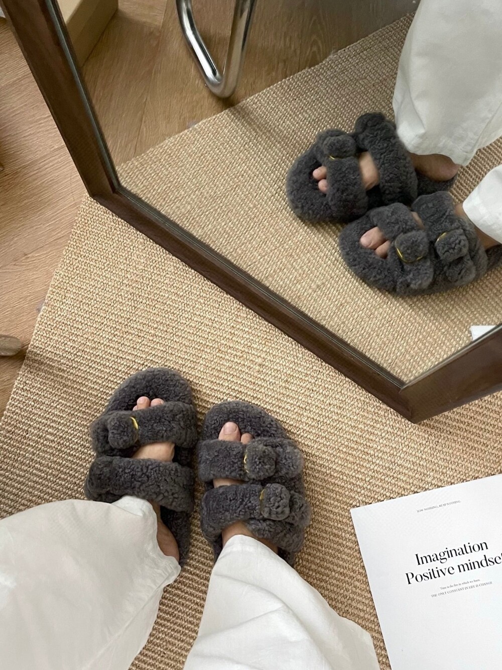 폭신폭신한 텍스처와 골드 버클 포인트가 돋보이는 양털 슬리퍼예요