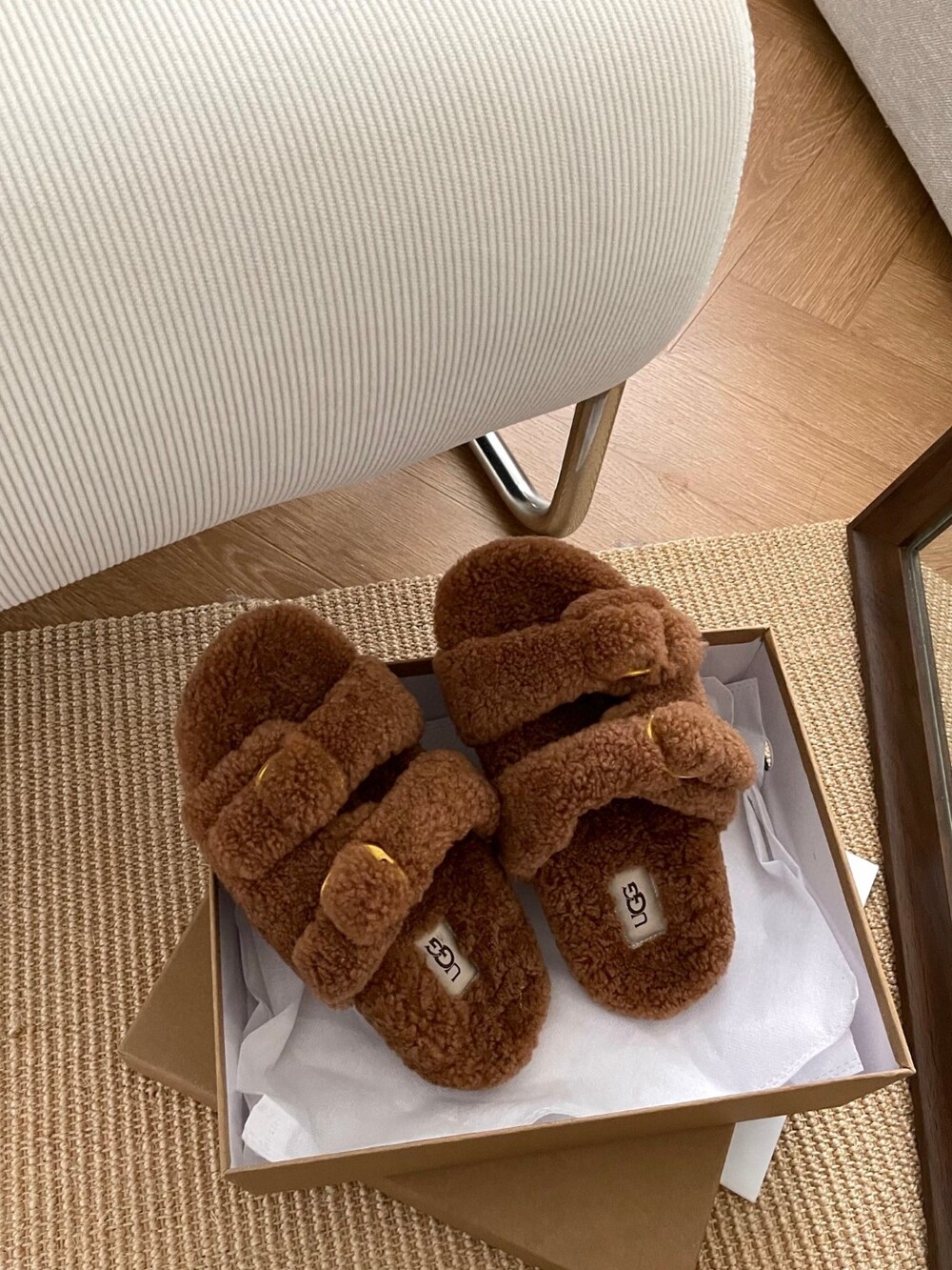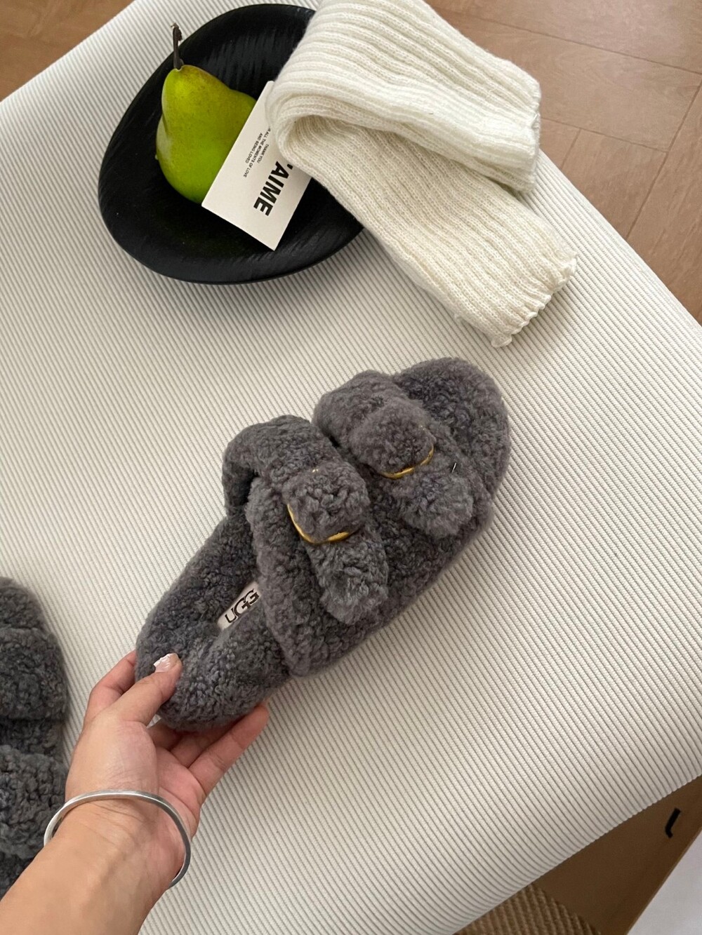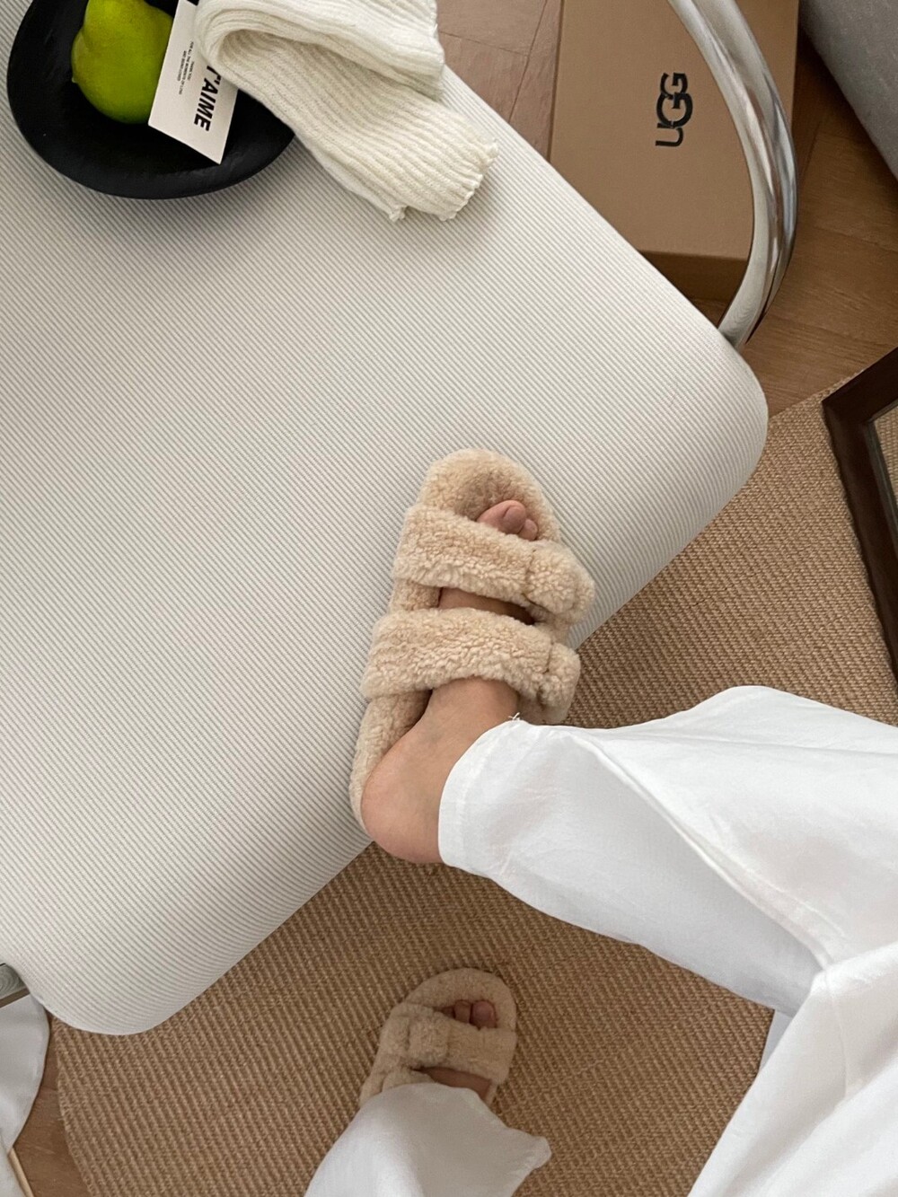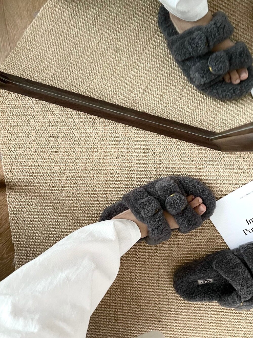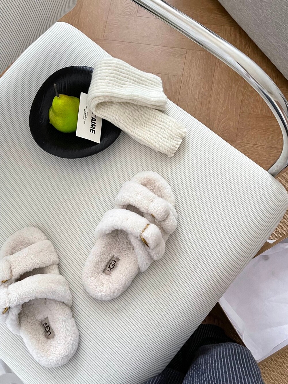 폭신폭신한 텍스처와 골드 버클 포인트가 돋보이는 양털 슬리퍼예요