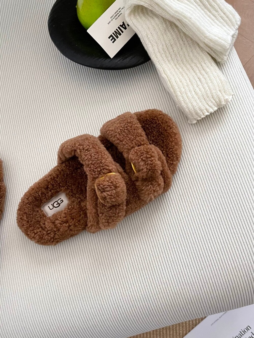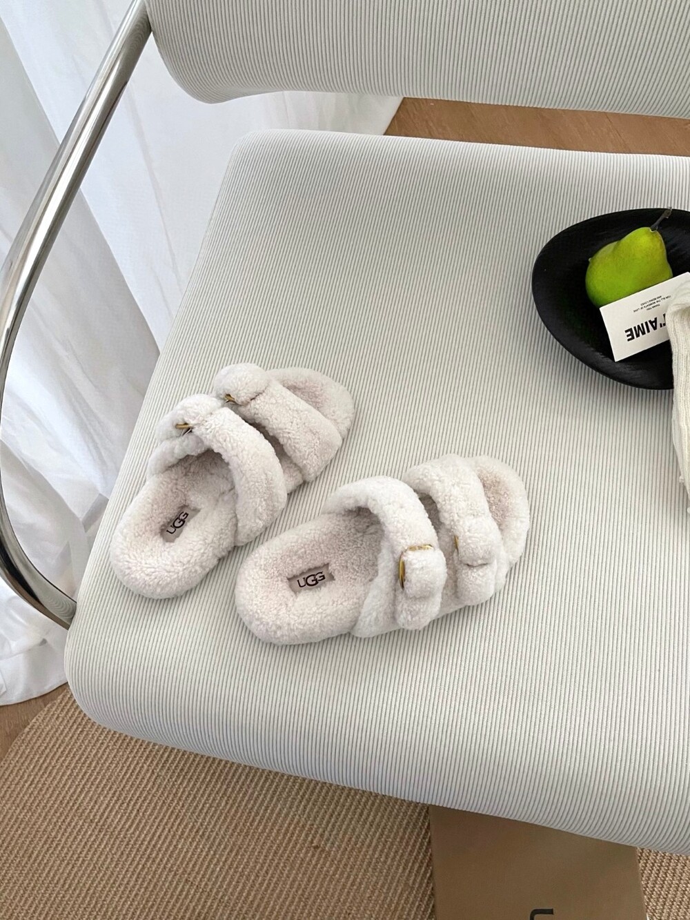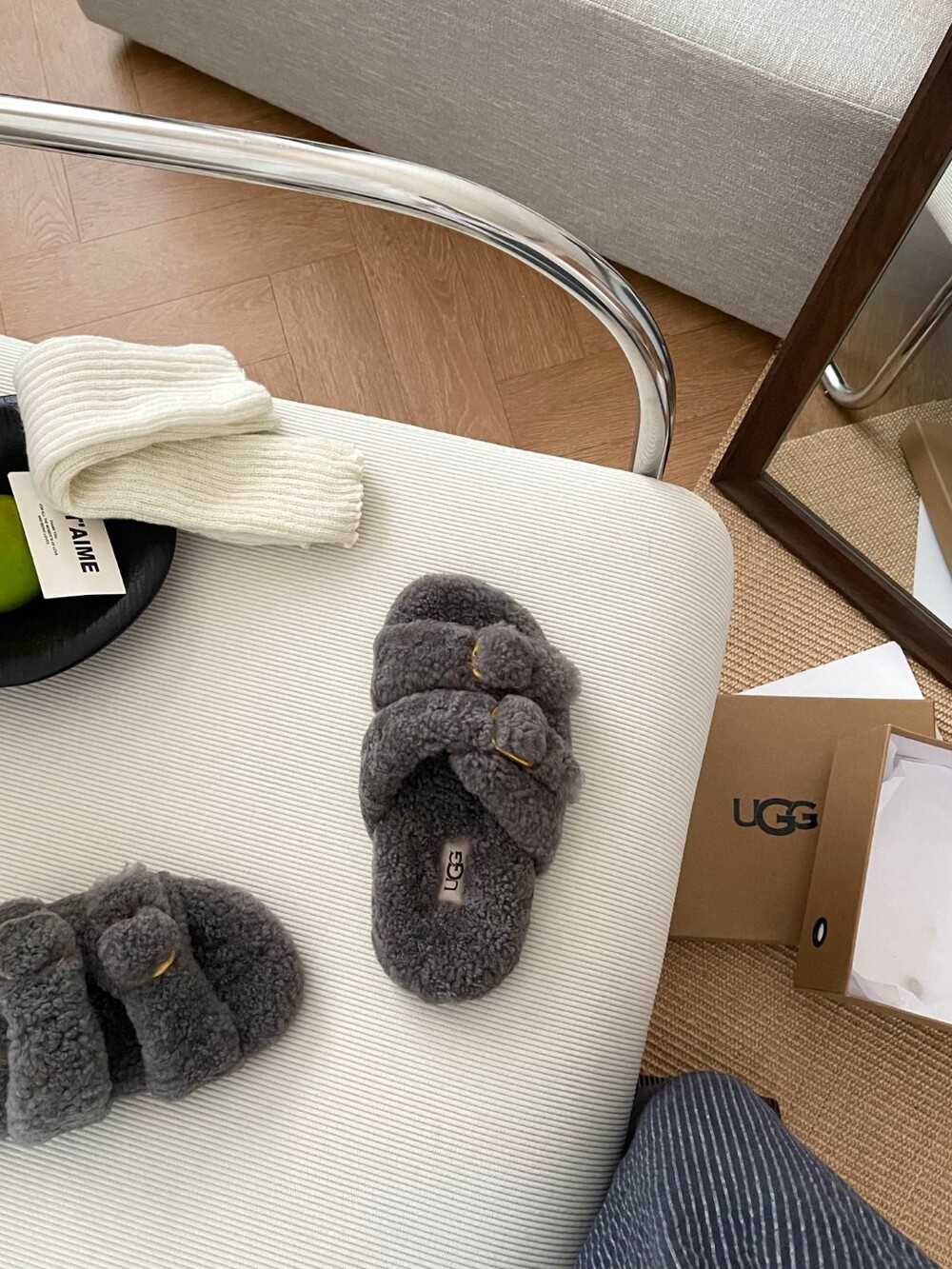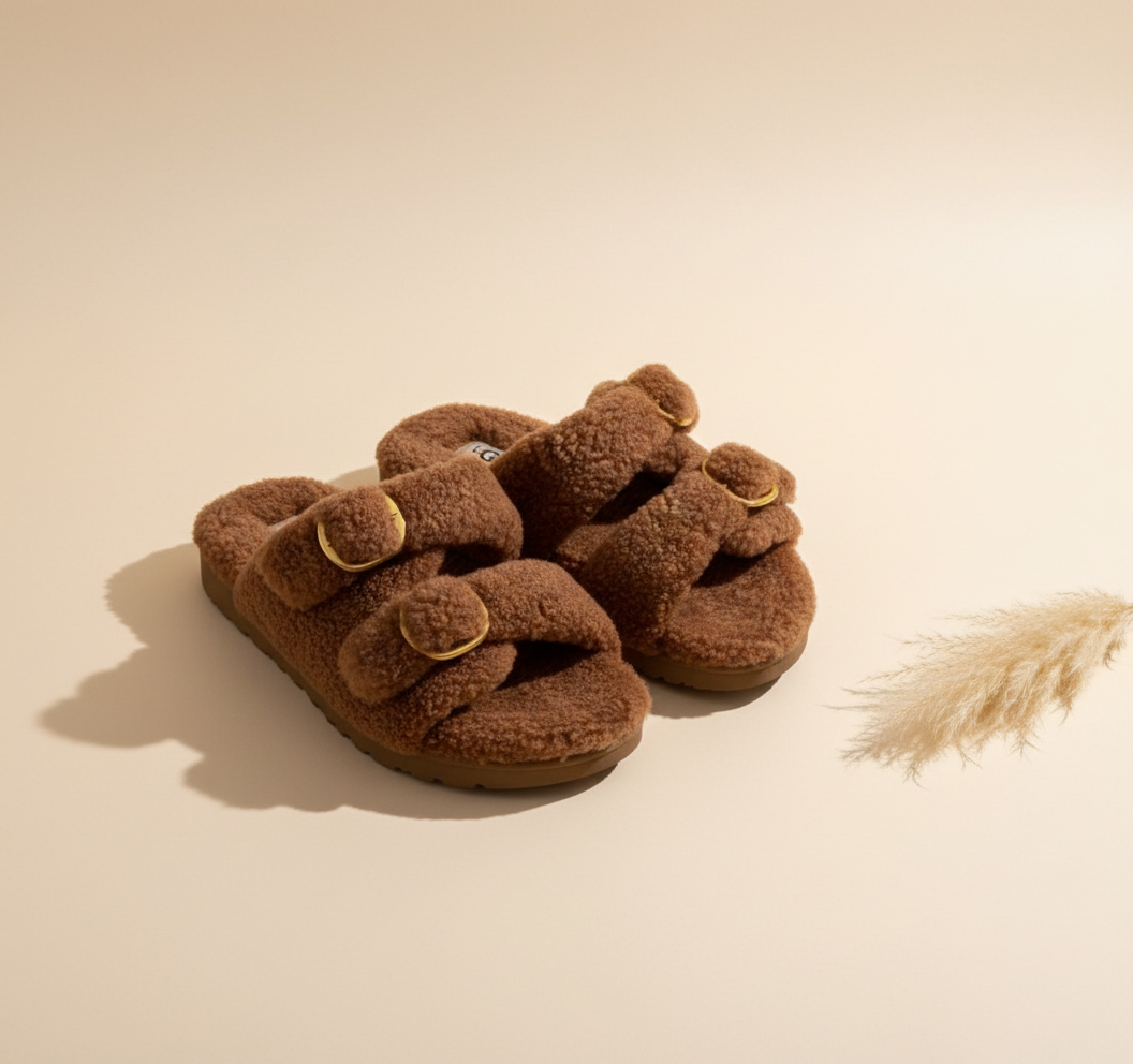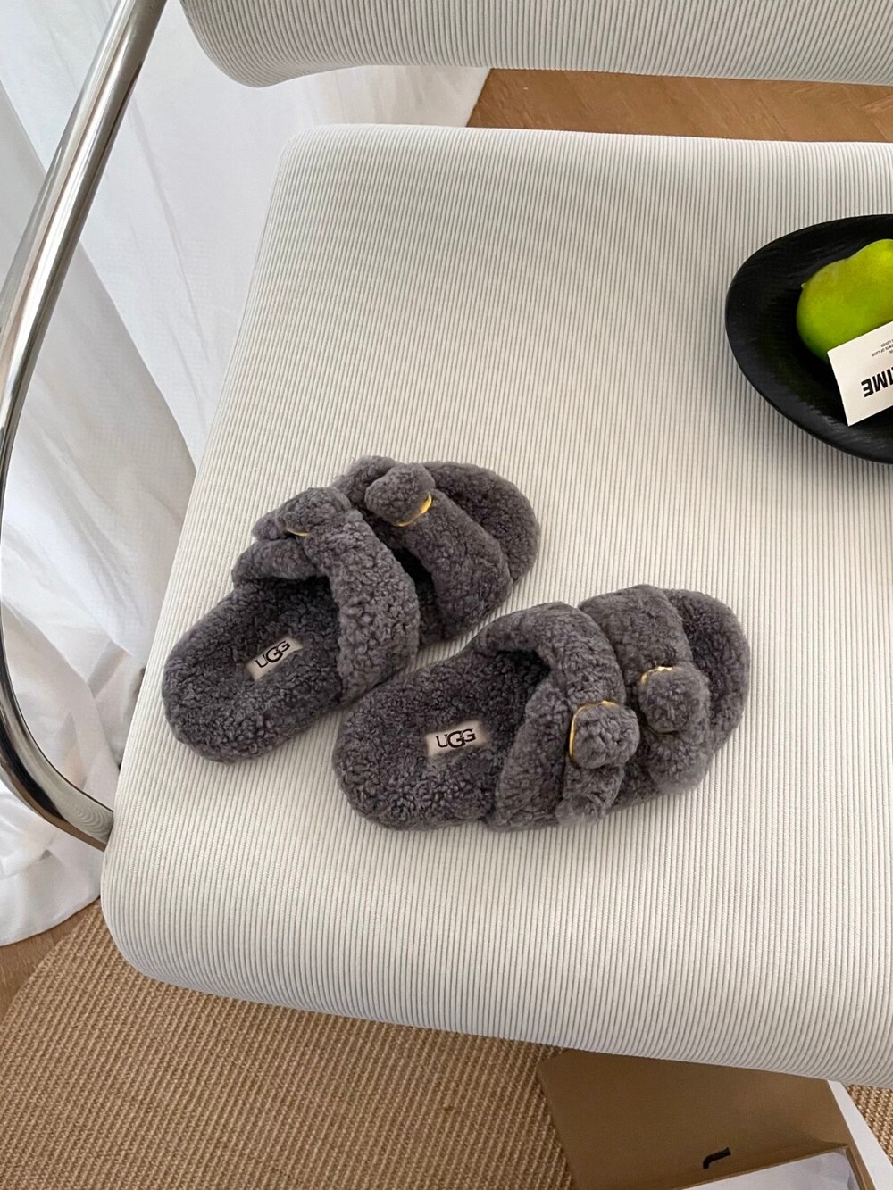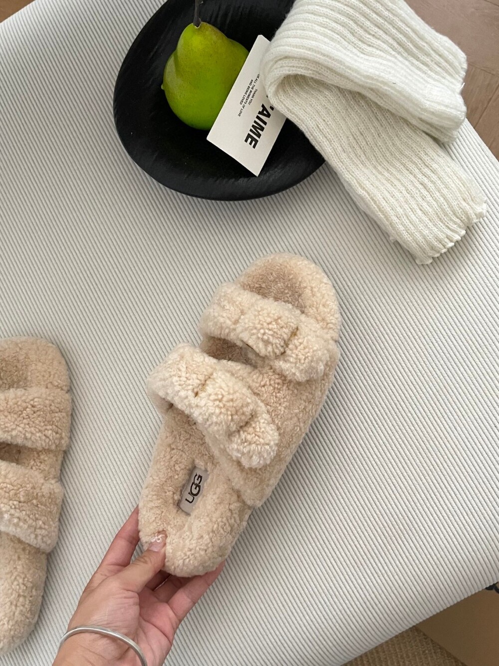 폭신폭신한 텍스처와 골드 버클 포인트가 돋보이는 양털 슬리퍼예요