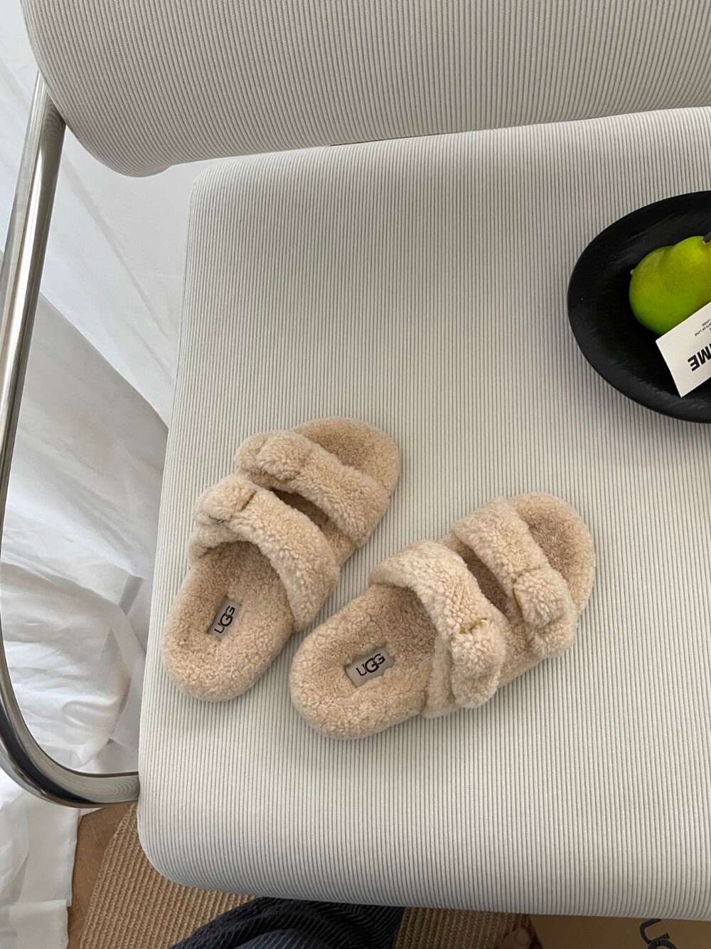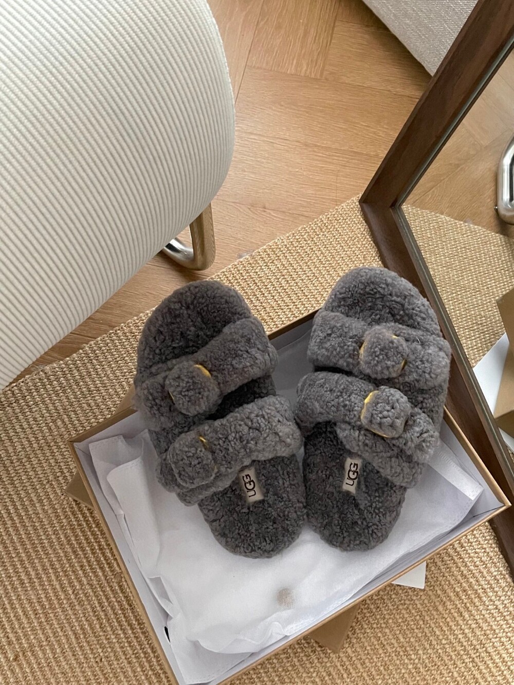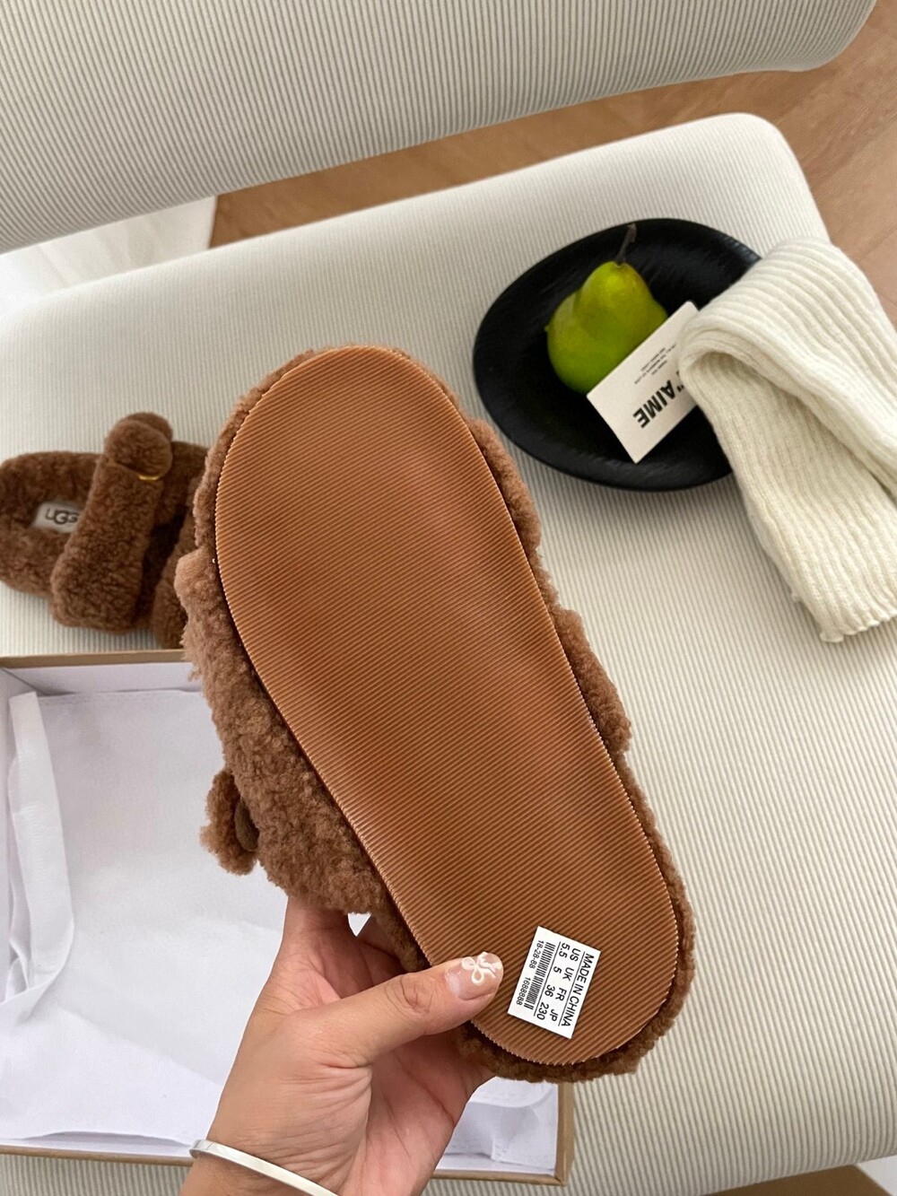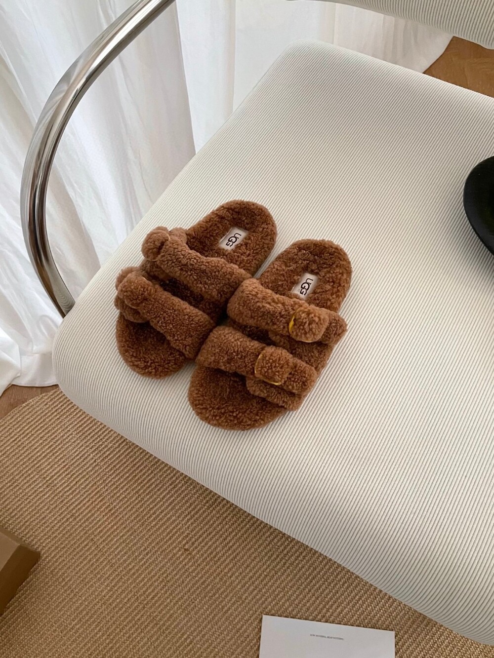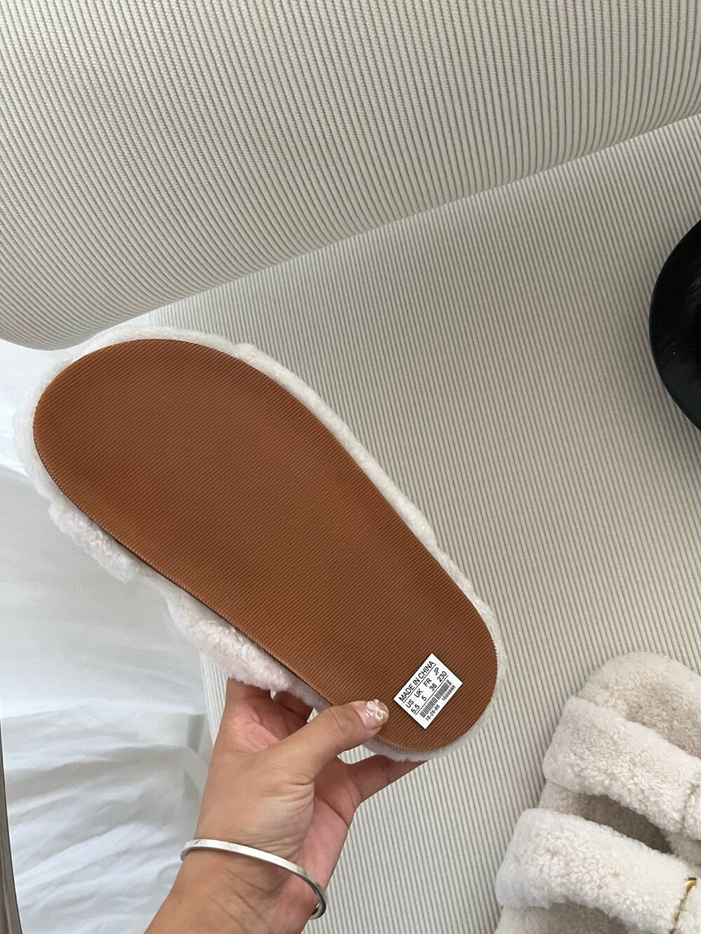 폭신폭신한 텍스처와 골드 버클 포인트가 돋보이는 양털 슬리퍼예요