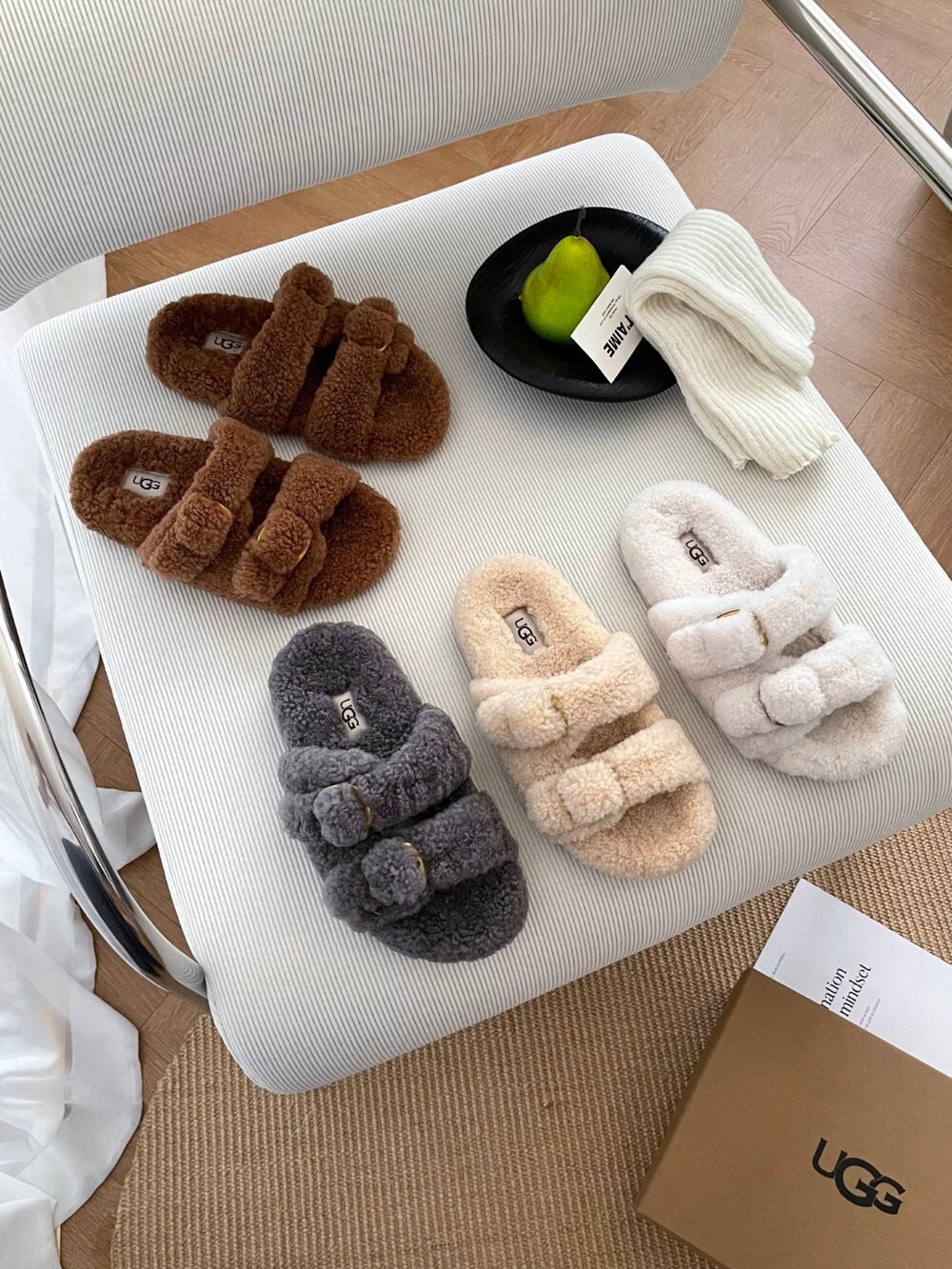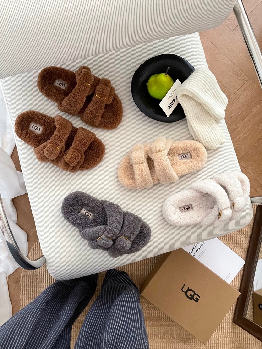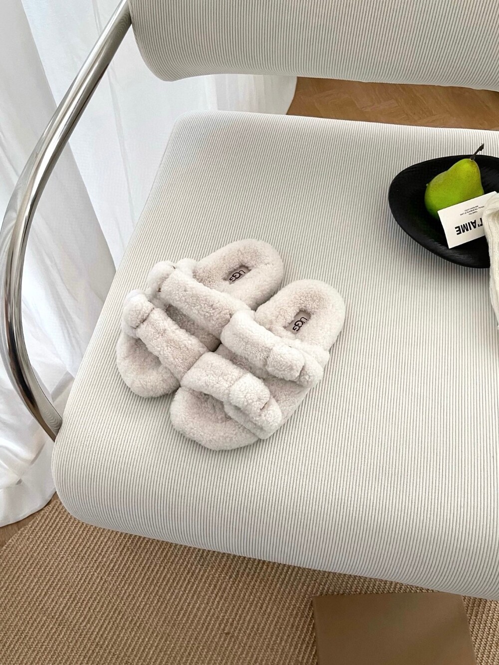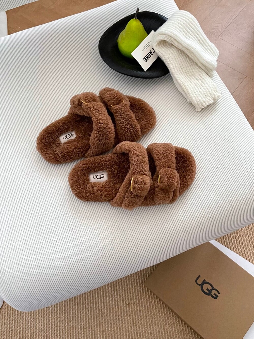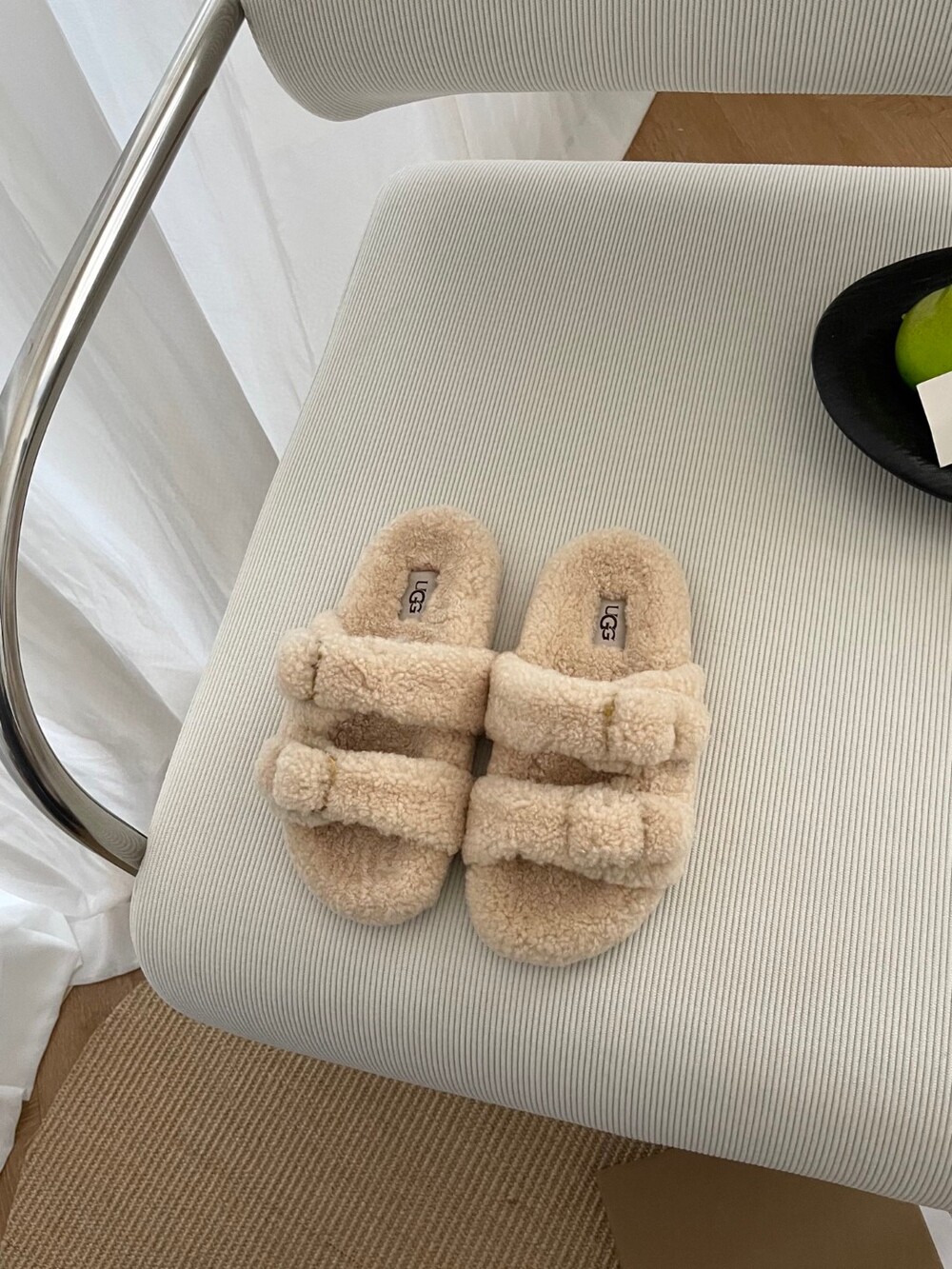 폭신폭신한 텍스처와 골드 버클 포인트가 돋보이는 양털 슬리퍼예요