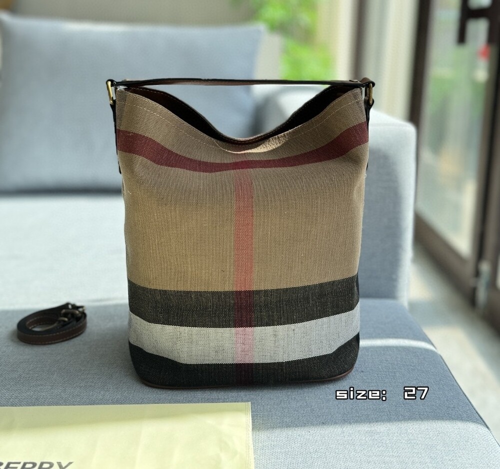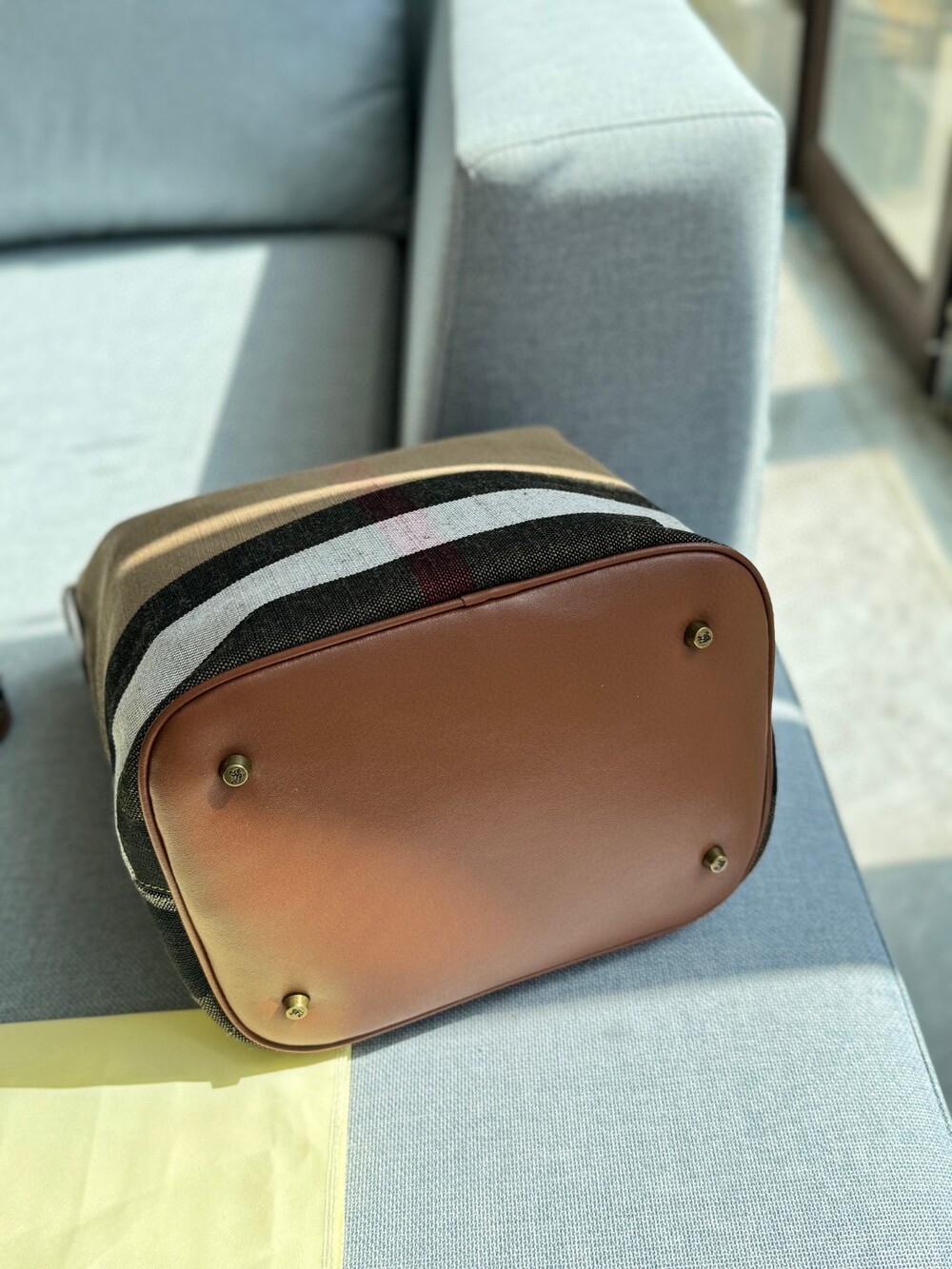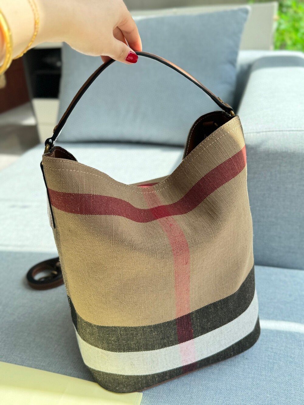 Burberry Classic Check Canvas Bucket Bag (with inner pouch) Iconic Burberry check pattern, made with sturdy, non-deforming canvas. Minimalist and effortlessly stylish—perfect for any outfit Still trending and versatile all year round A daily bag that combines charm and practicality