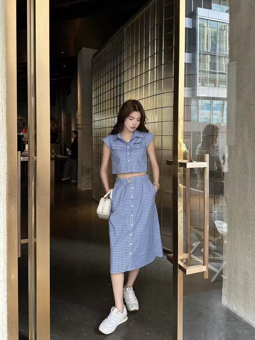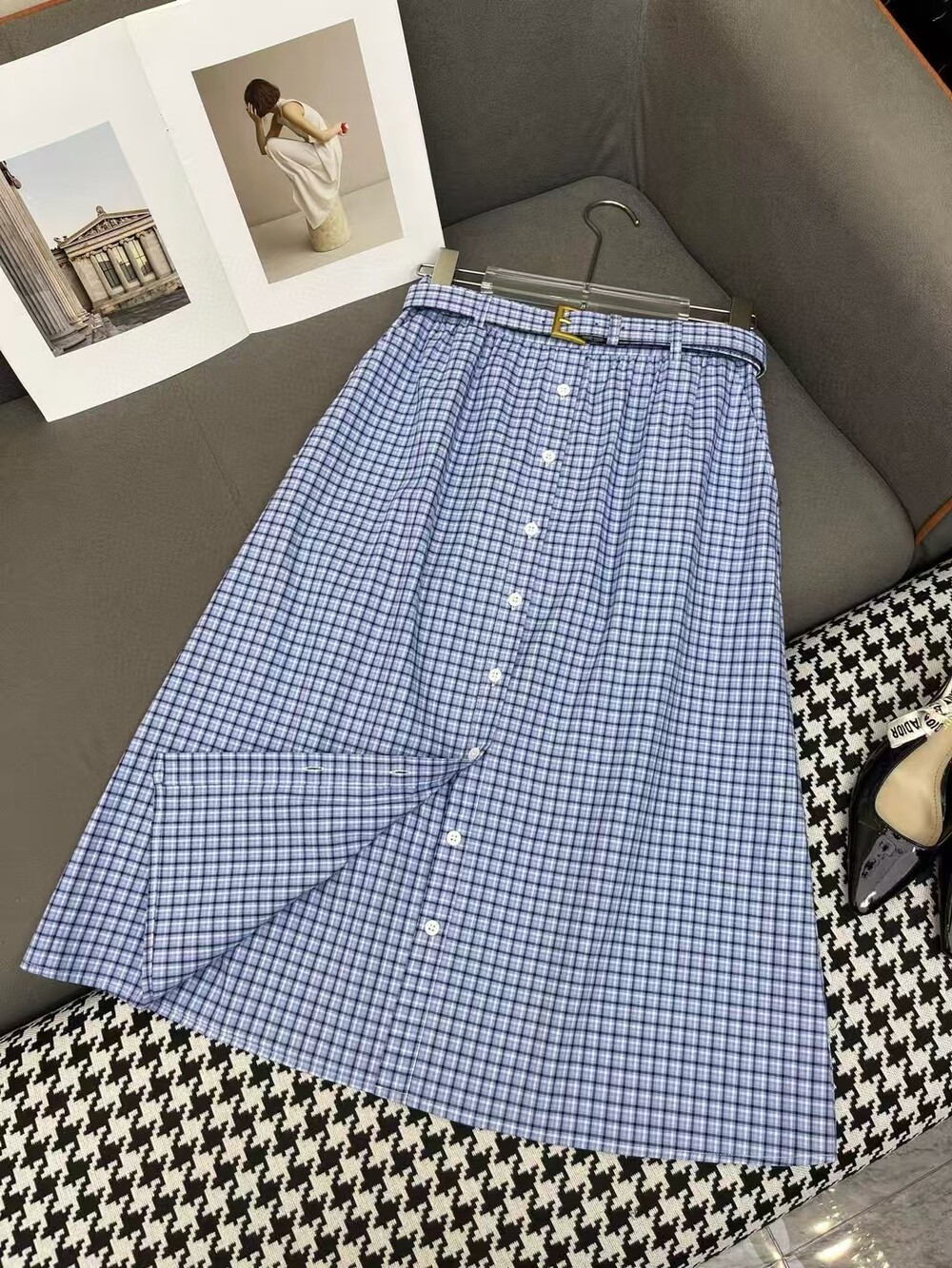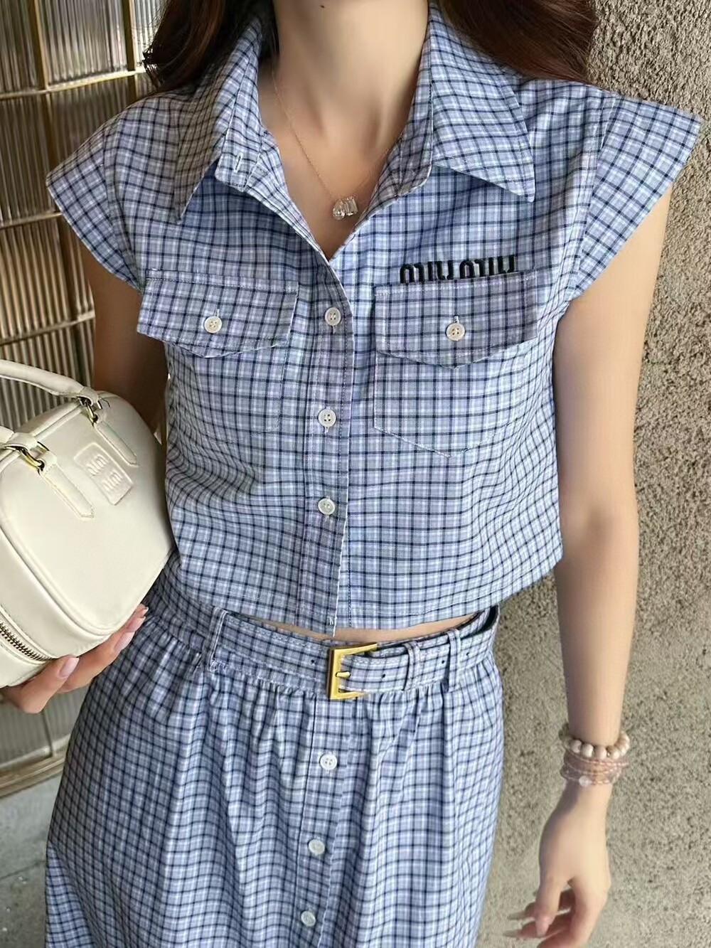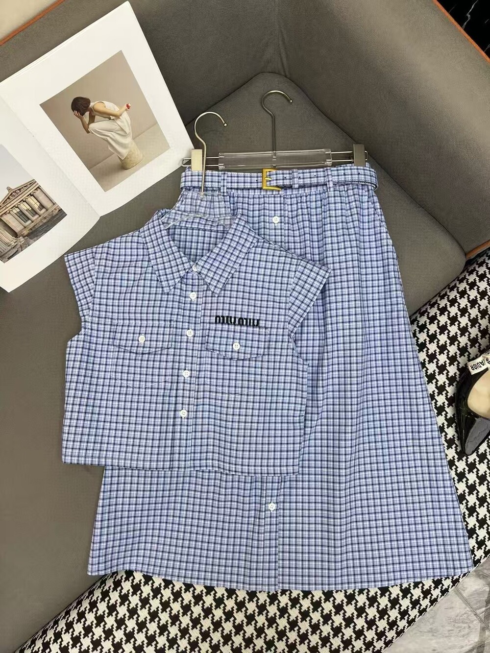 J. 뮤뮤 켑소매 체크 벨트 투피스