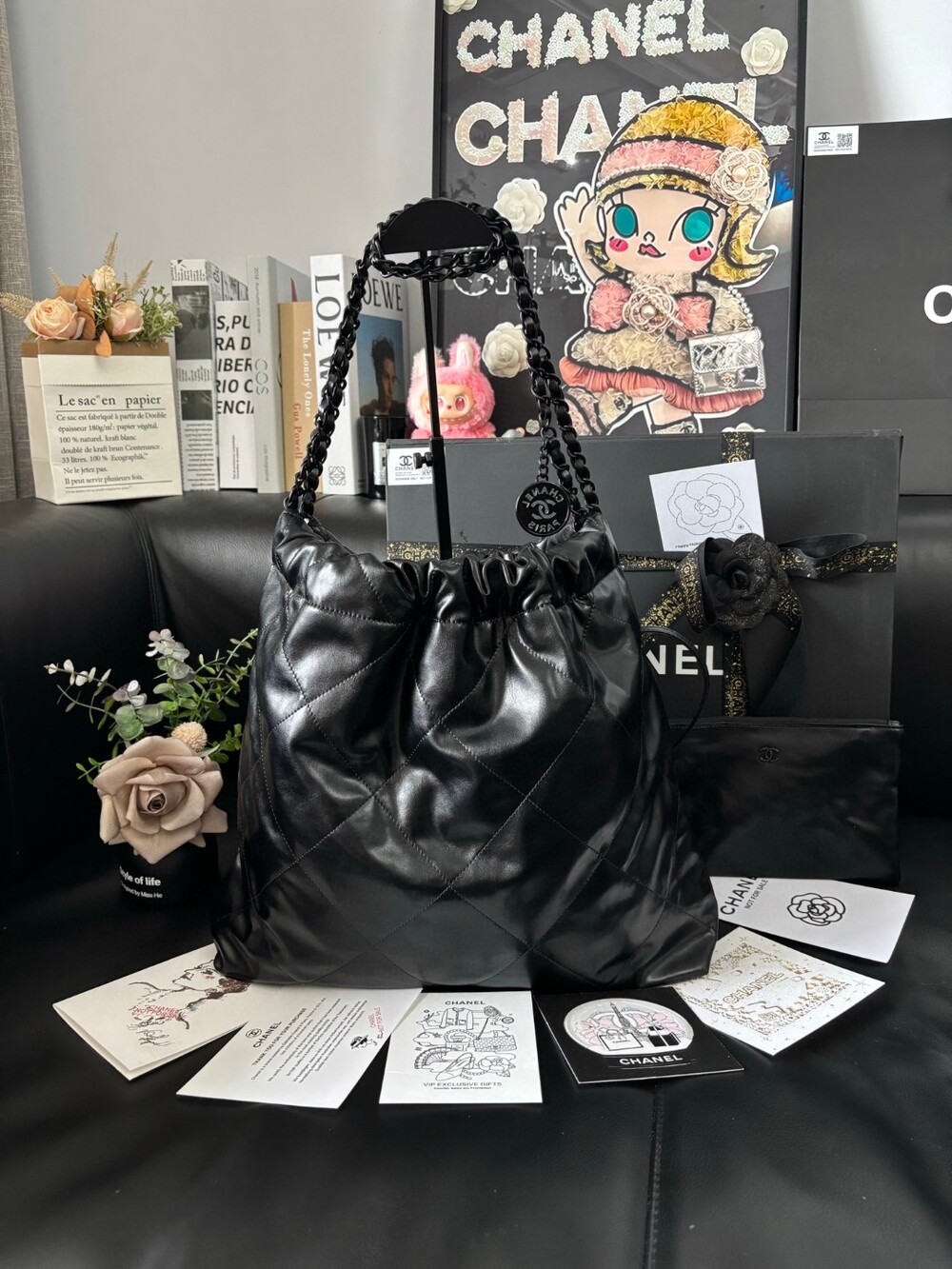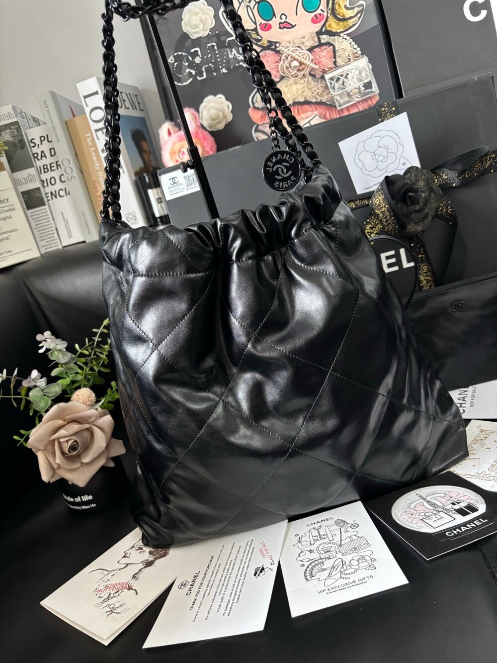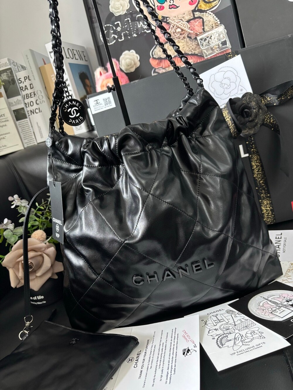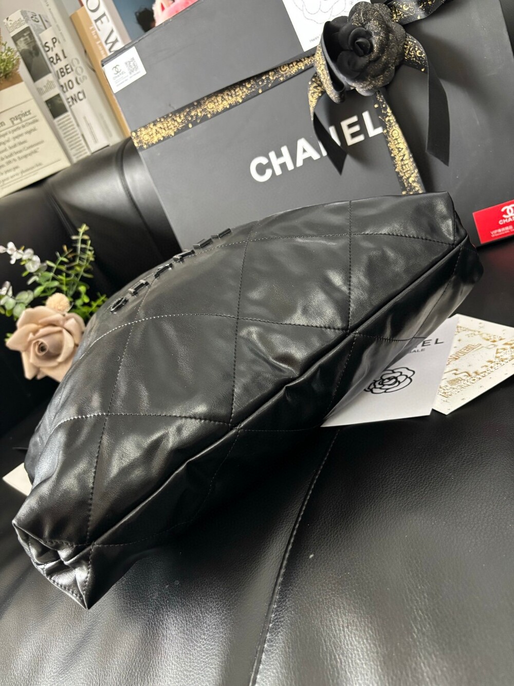 A stunning reinterpretation of the iconic Chanel 22 bag in a soft matte black finish.