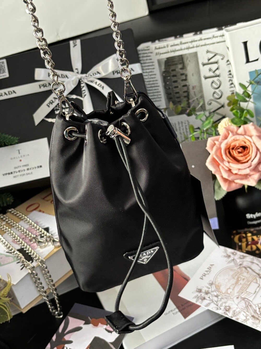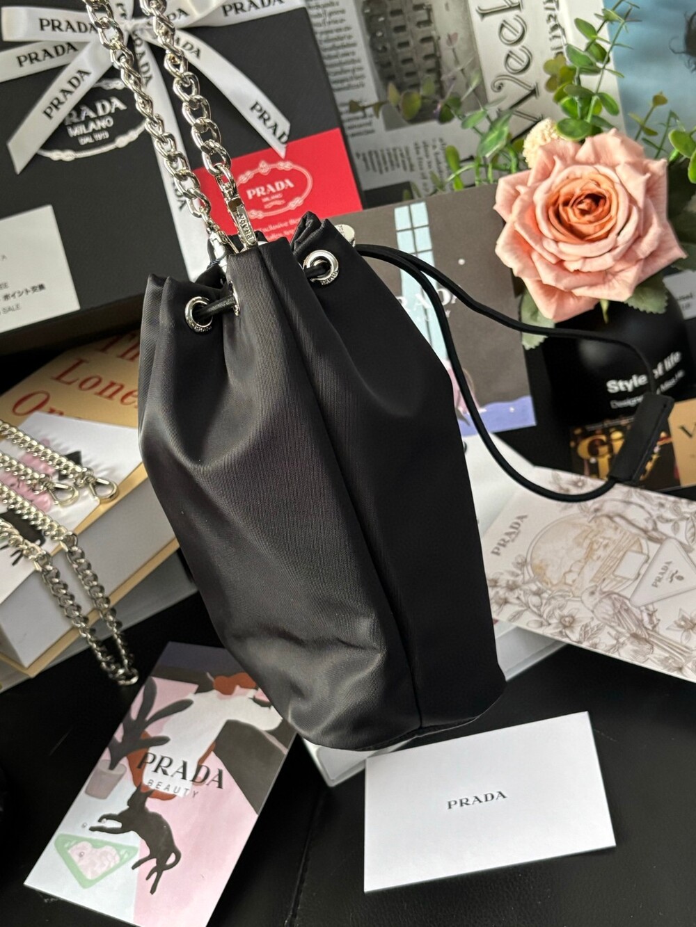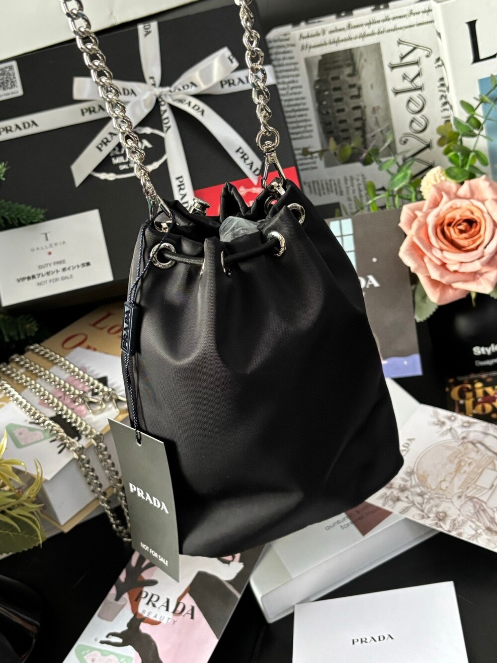A chic Prada mini bucket bag that perfectly blends elegance with playful charm.