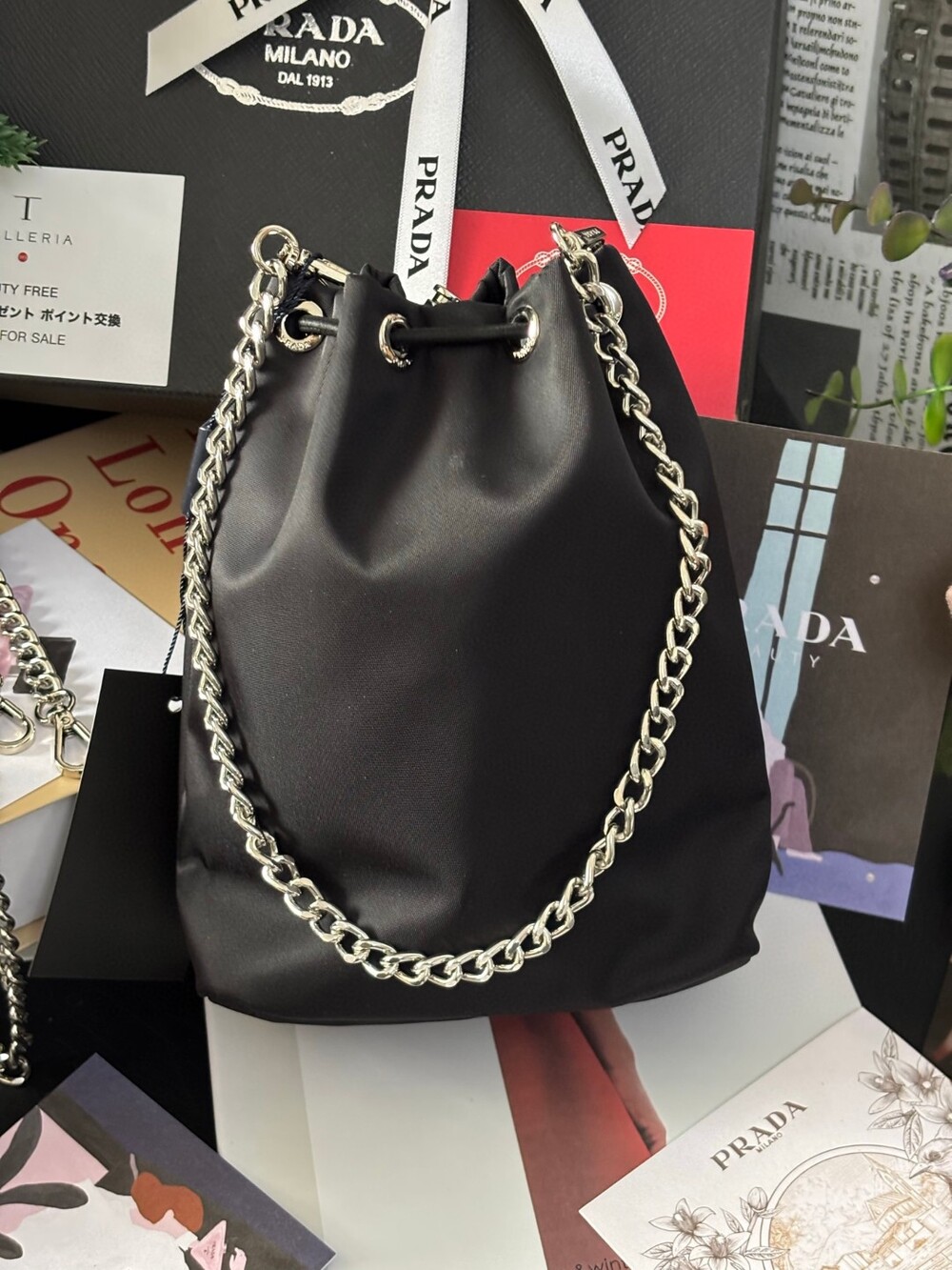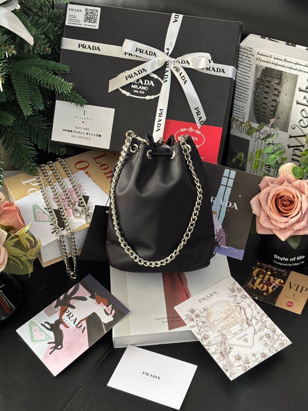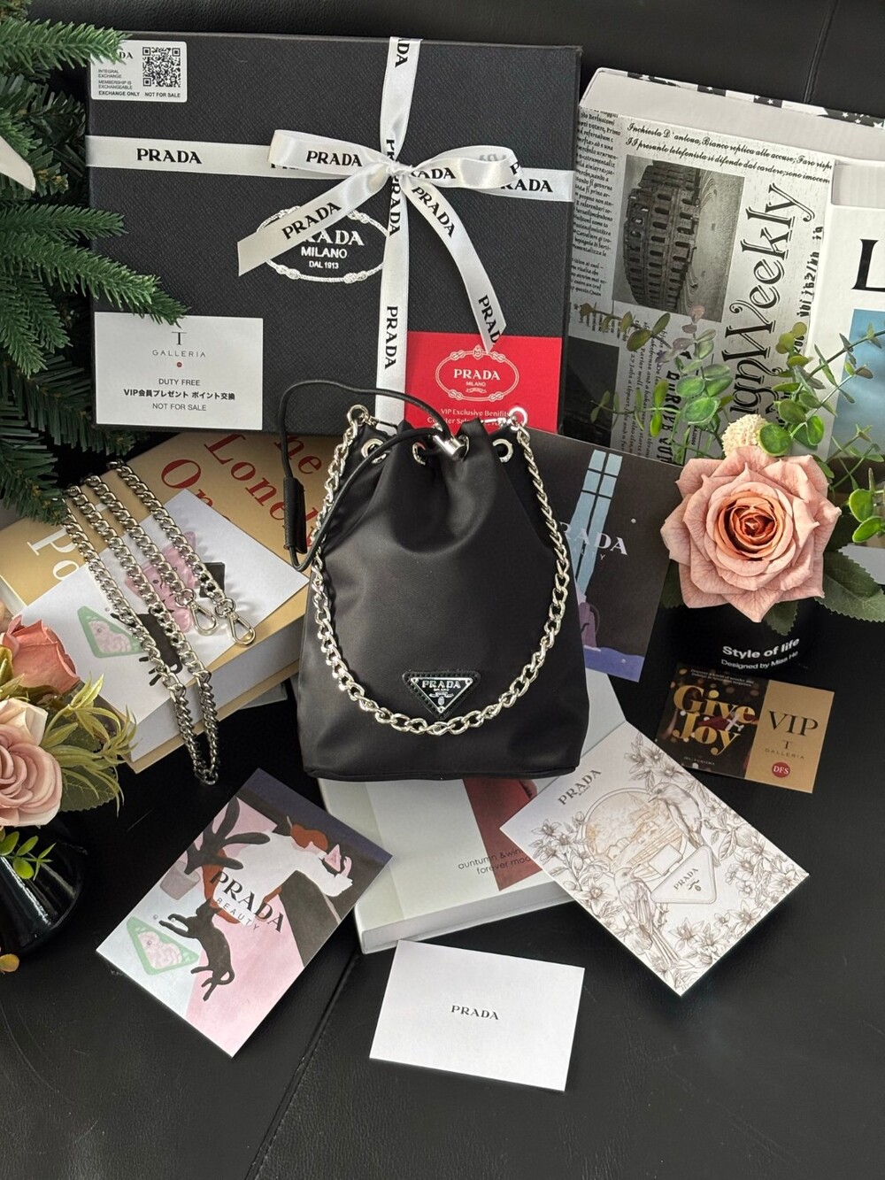A chic Prada mini bucket bag that perfectly blends elegance with playful charm.