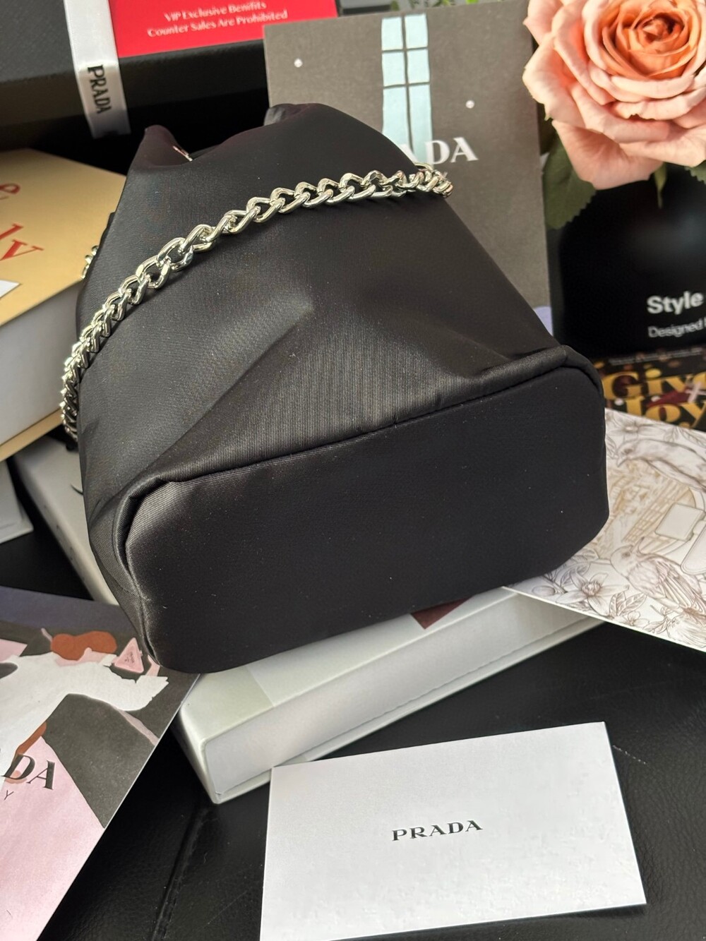 the iconic triangular Prada logo and a sleek silver chain detail that adds a subtle statement.