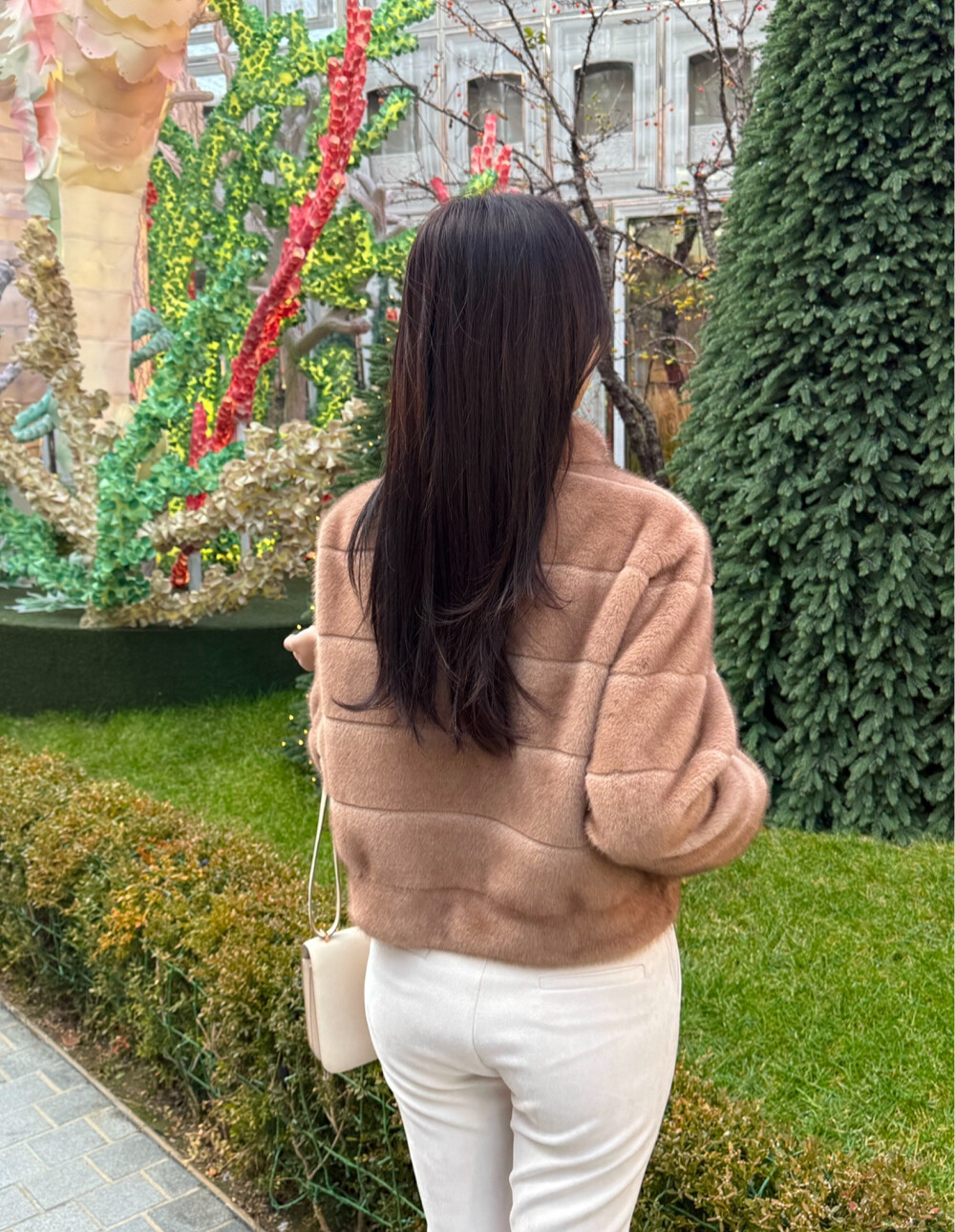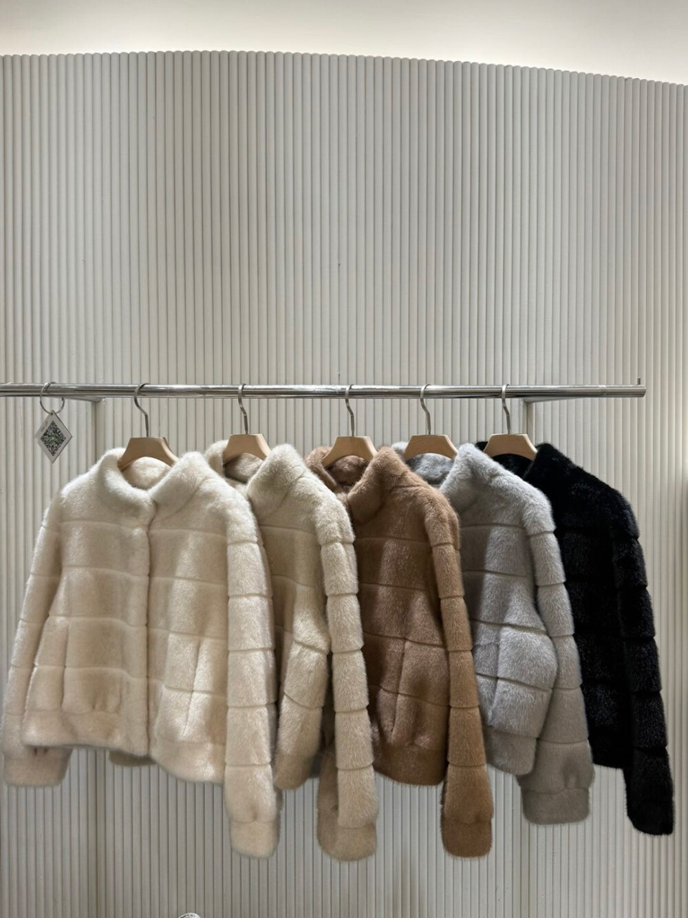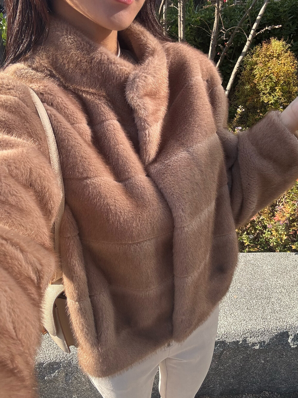 고급스러운 광택감이 돋보이는 벨벳 터치 페이크퍼 자켓입니다.