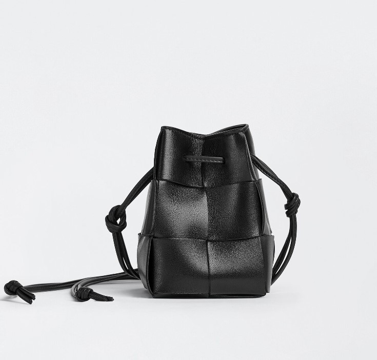 가죽 소재를 인트레치아토 위빙으로 완성한 미니 크로스바디 버킷 백
