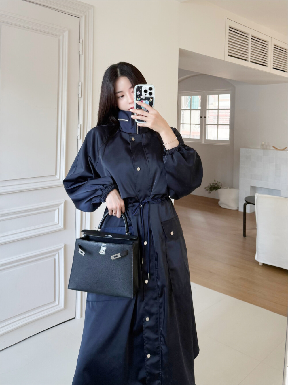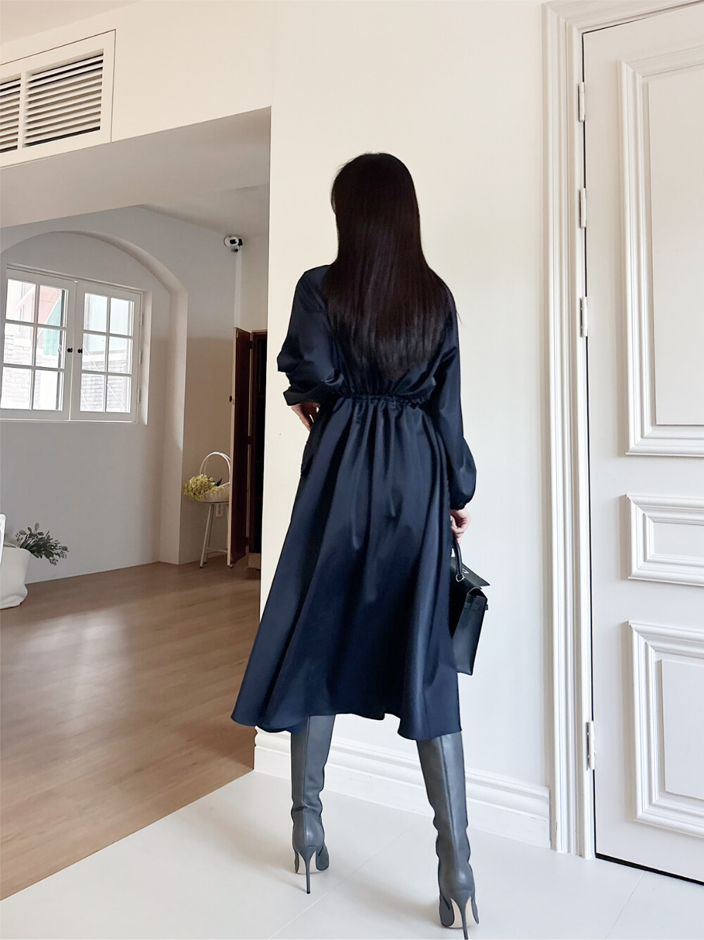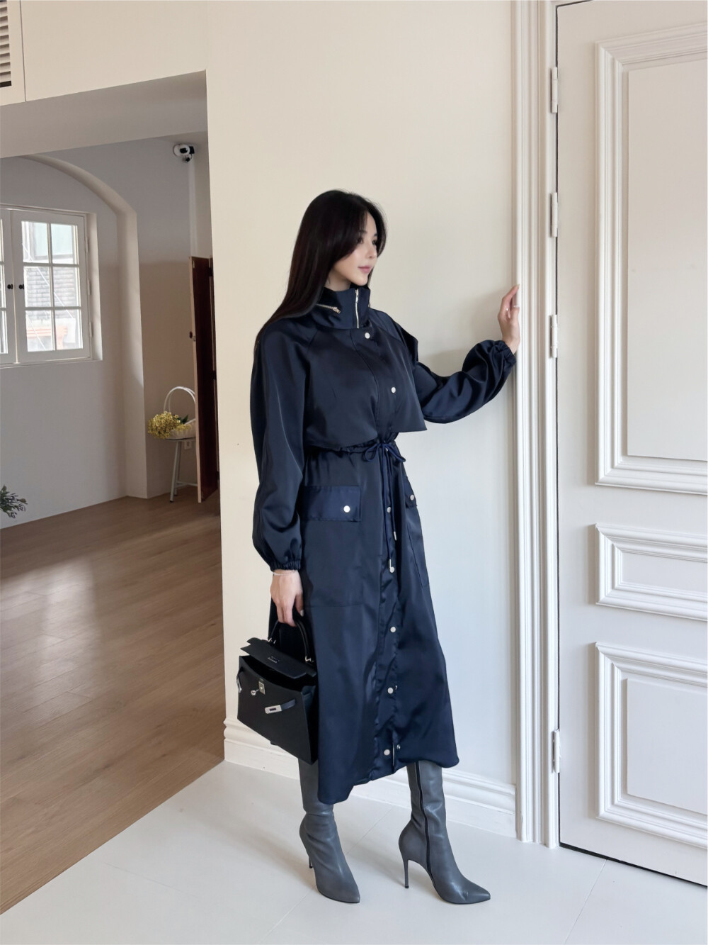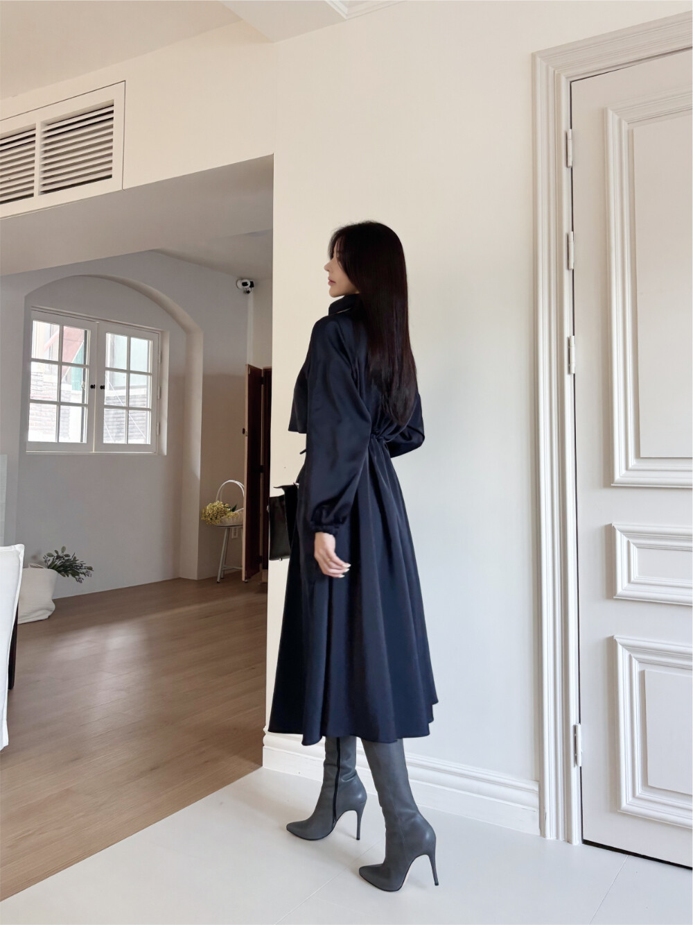 움직임에 따라 고급스럽게 흐르는 윤광이 룩 전체에 우아하고 세련된 무드를 더해줍니다.