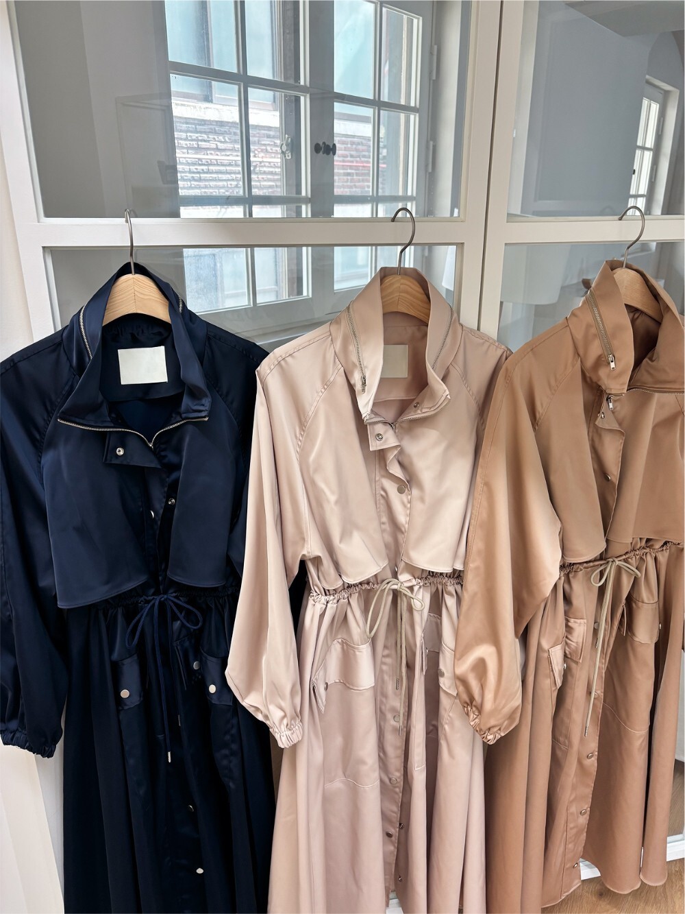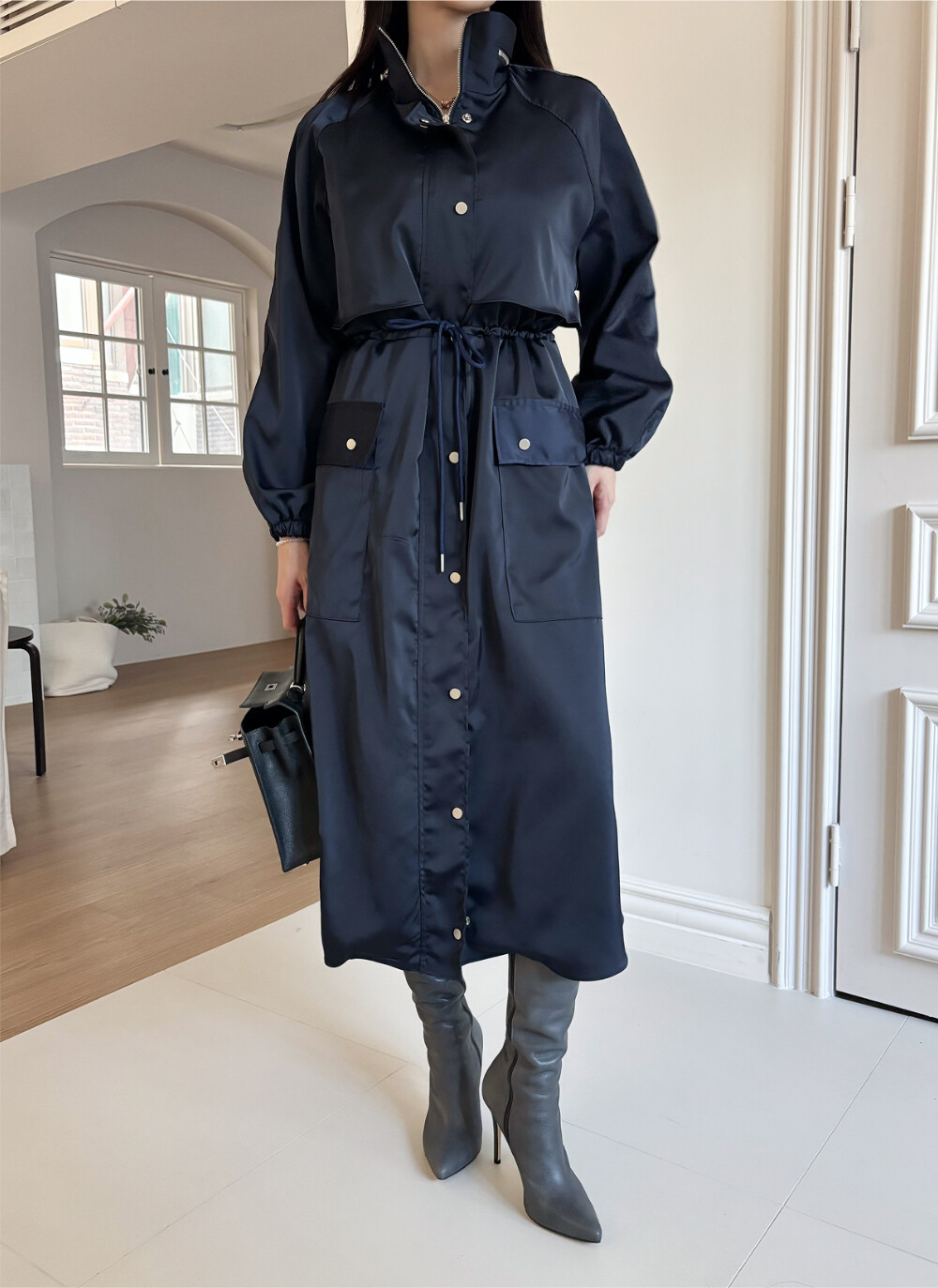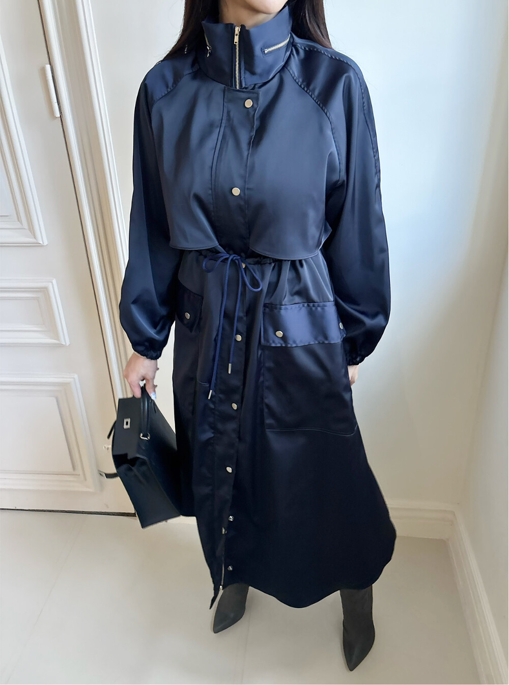 (High-quality Polyester Satin) 원단으로 제작된 트렌치 드레스 코트입니다.