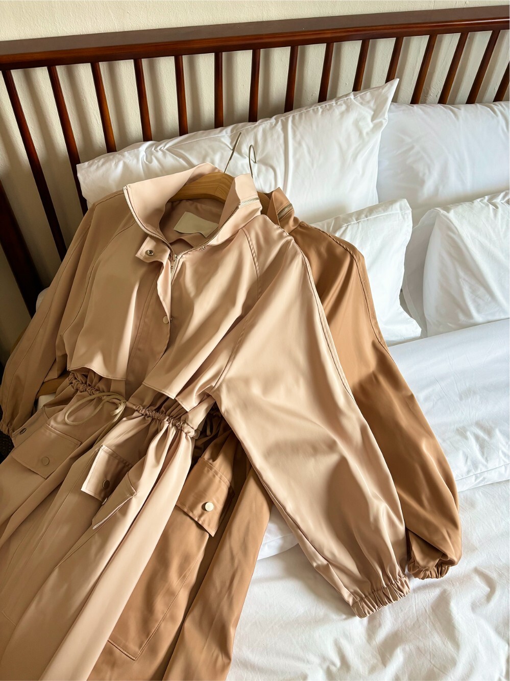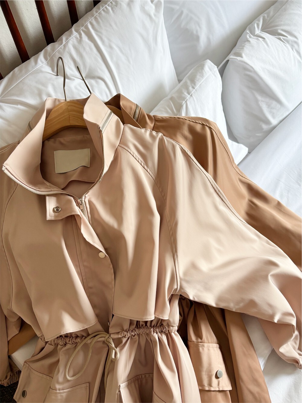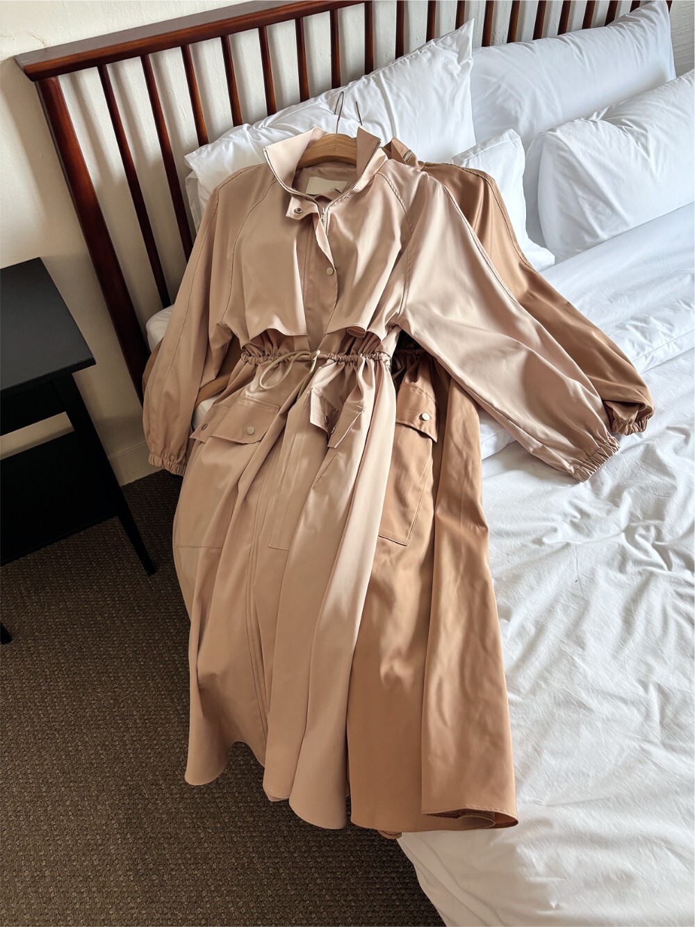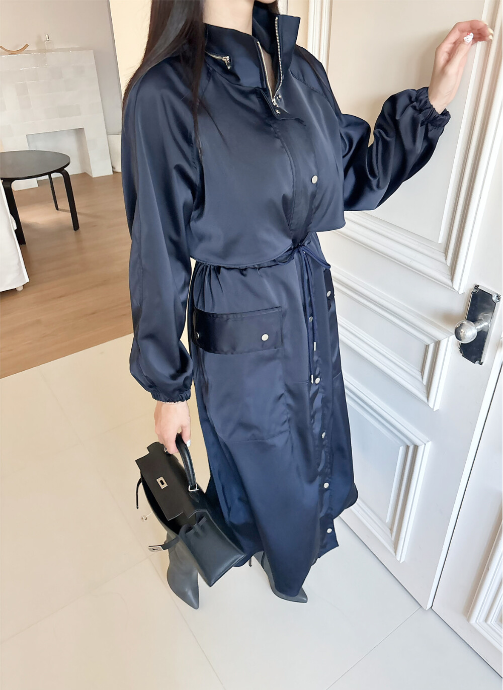 (High-quality Polyester Satin) 원단으로 제작된 트렌치 드레스 코트입니다.