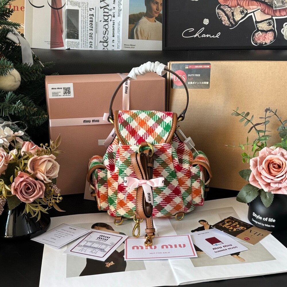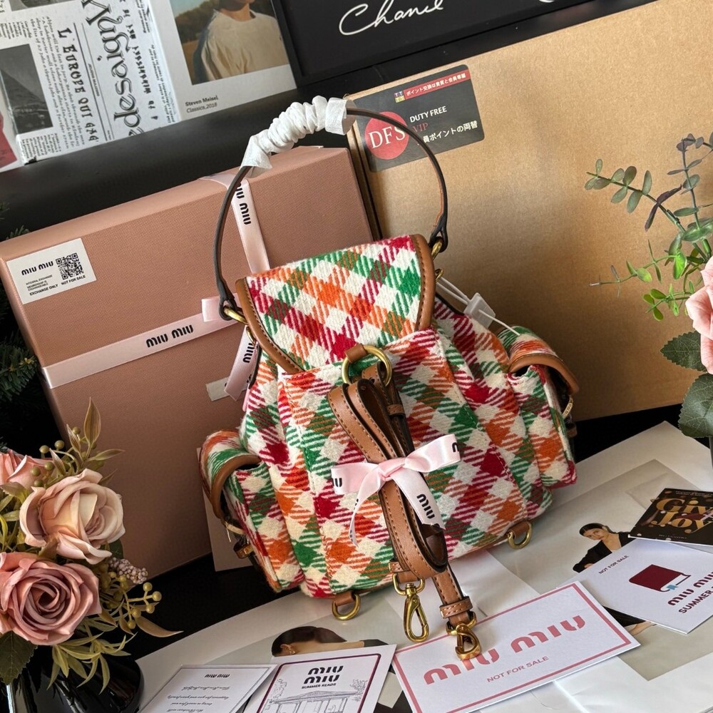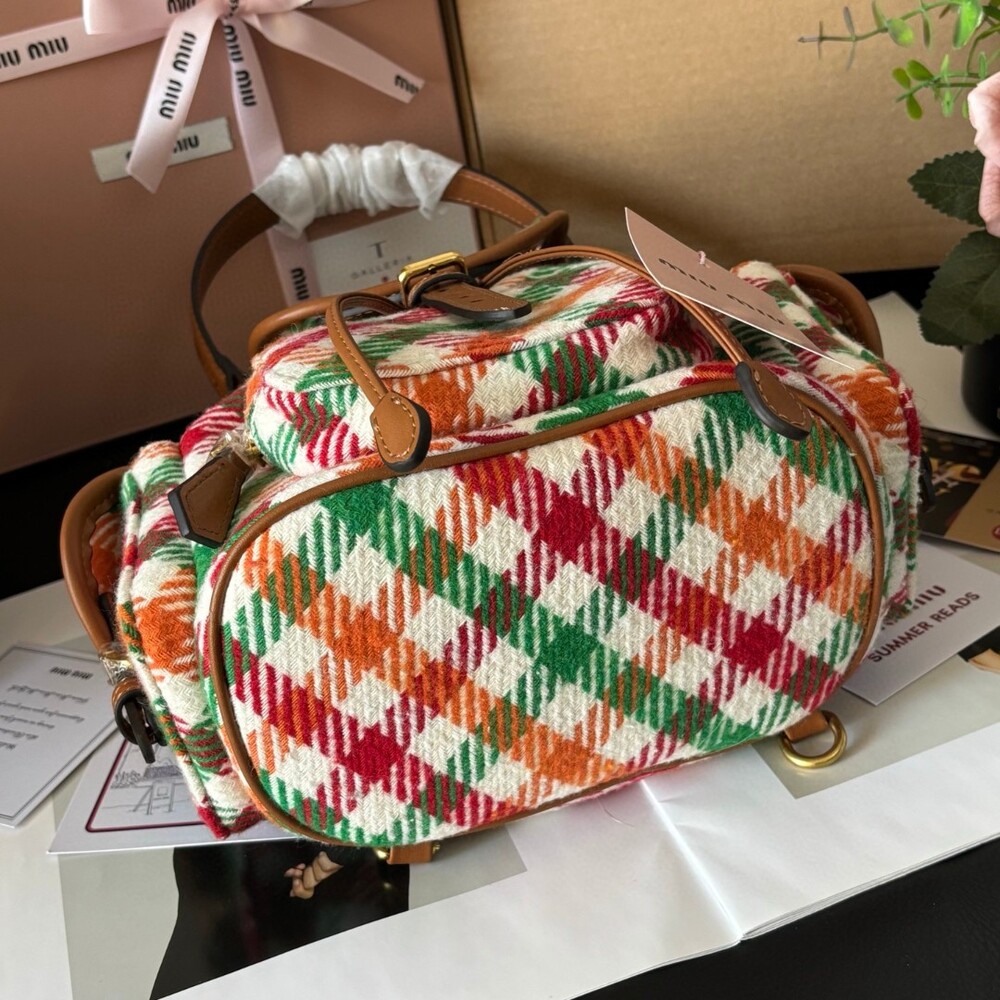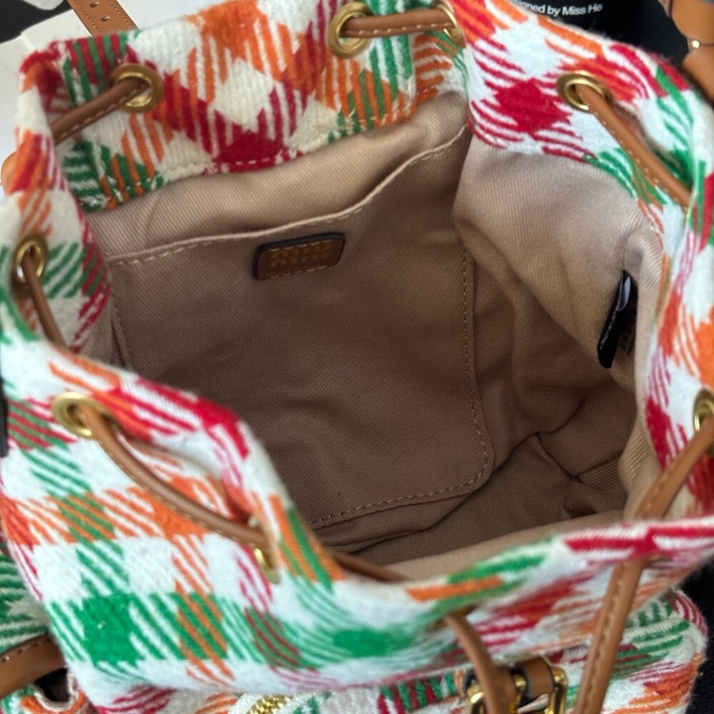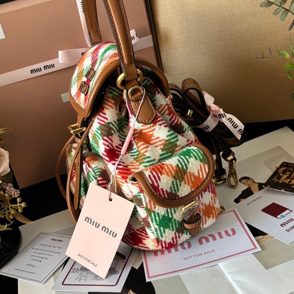 미우미우 특유의 감성을 담은 하운드투스 패턴 트위드 백팩입니다.
