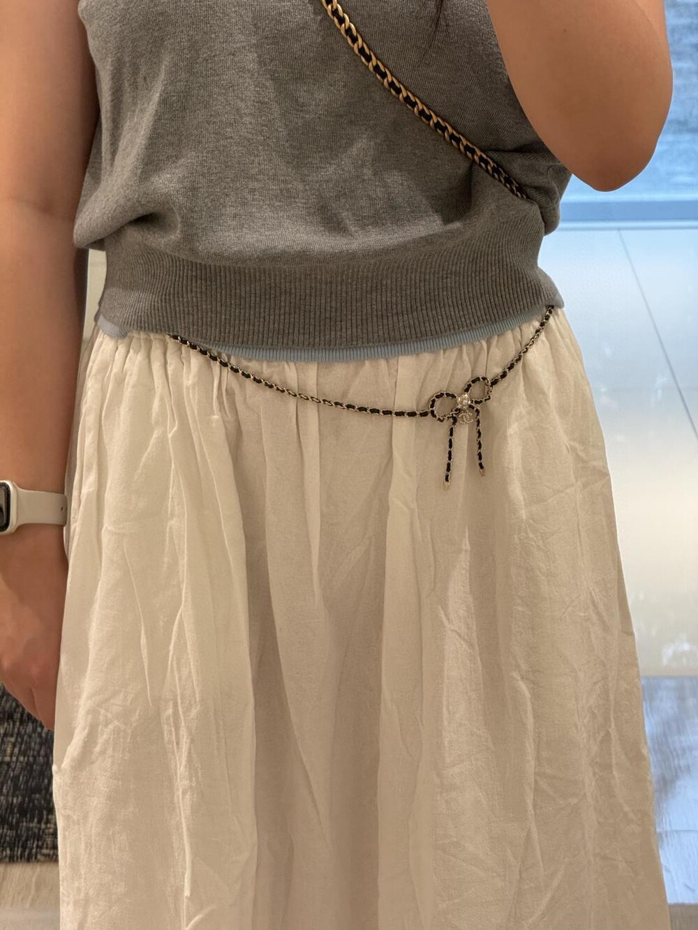 양가죽 디테일이 조화를 이룬 체인 벨트입니다.