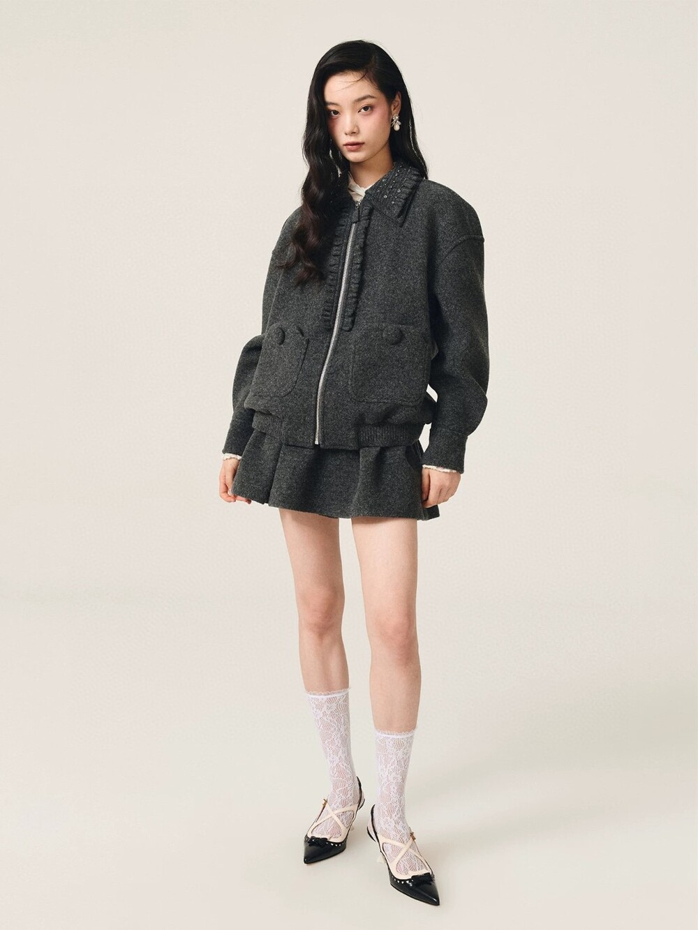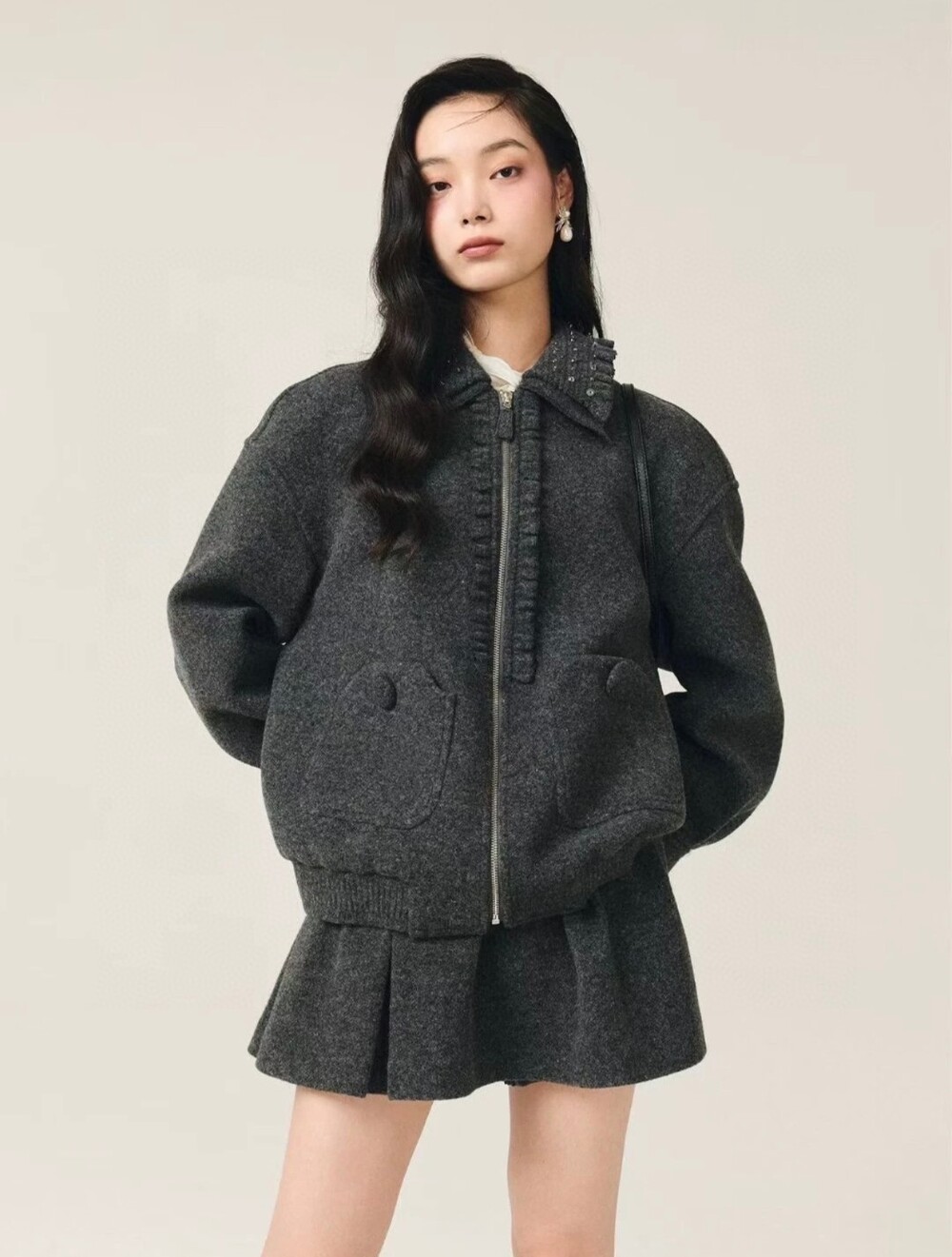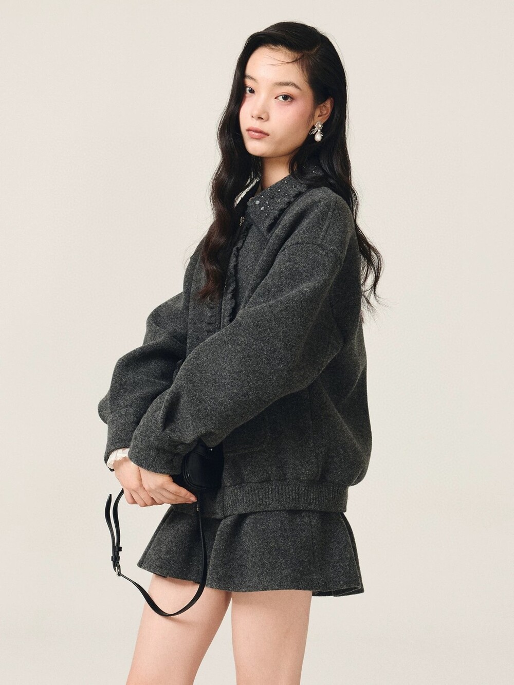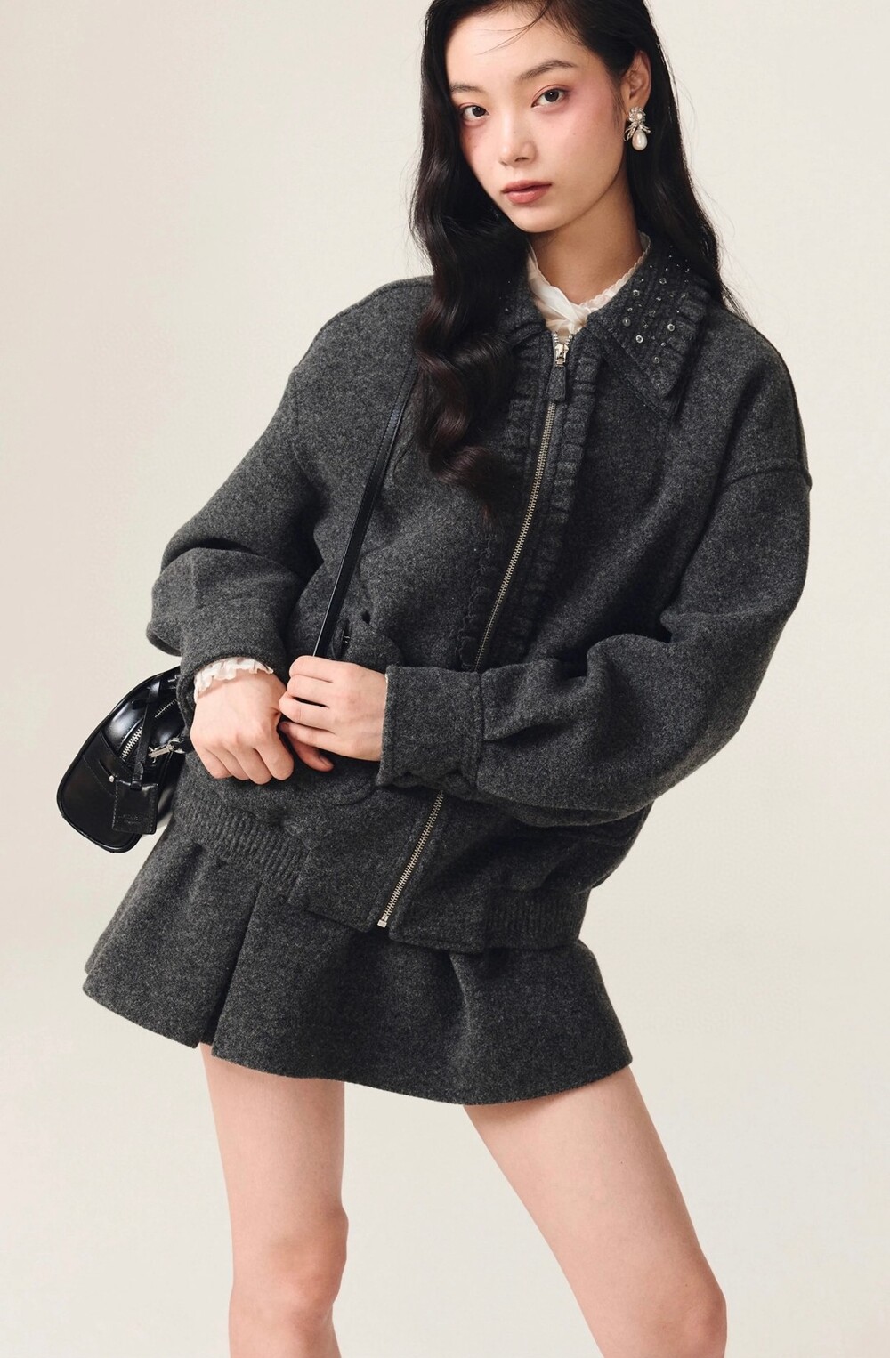 진한 차콜 그레이 울에 촘촘히 박힌 스톤 장식의 더블 레이어 카라,