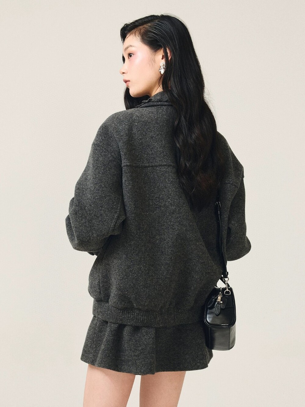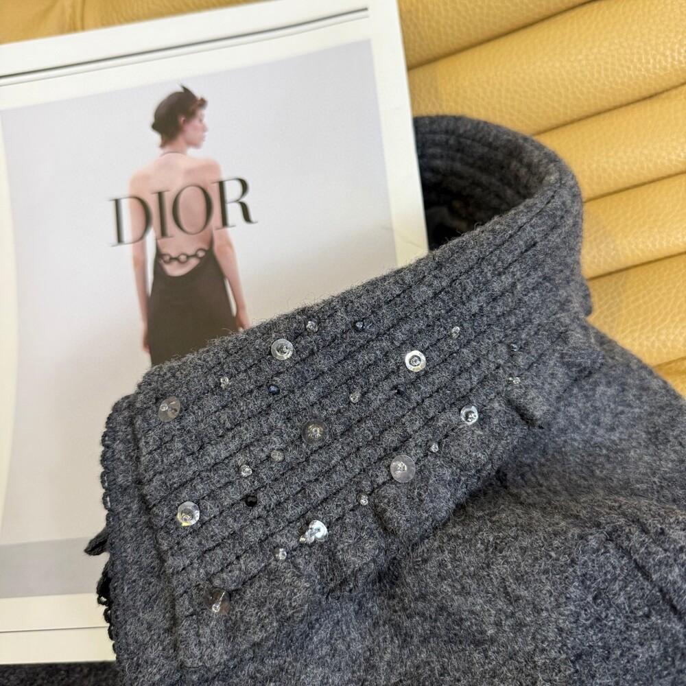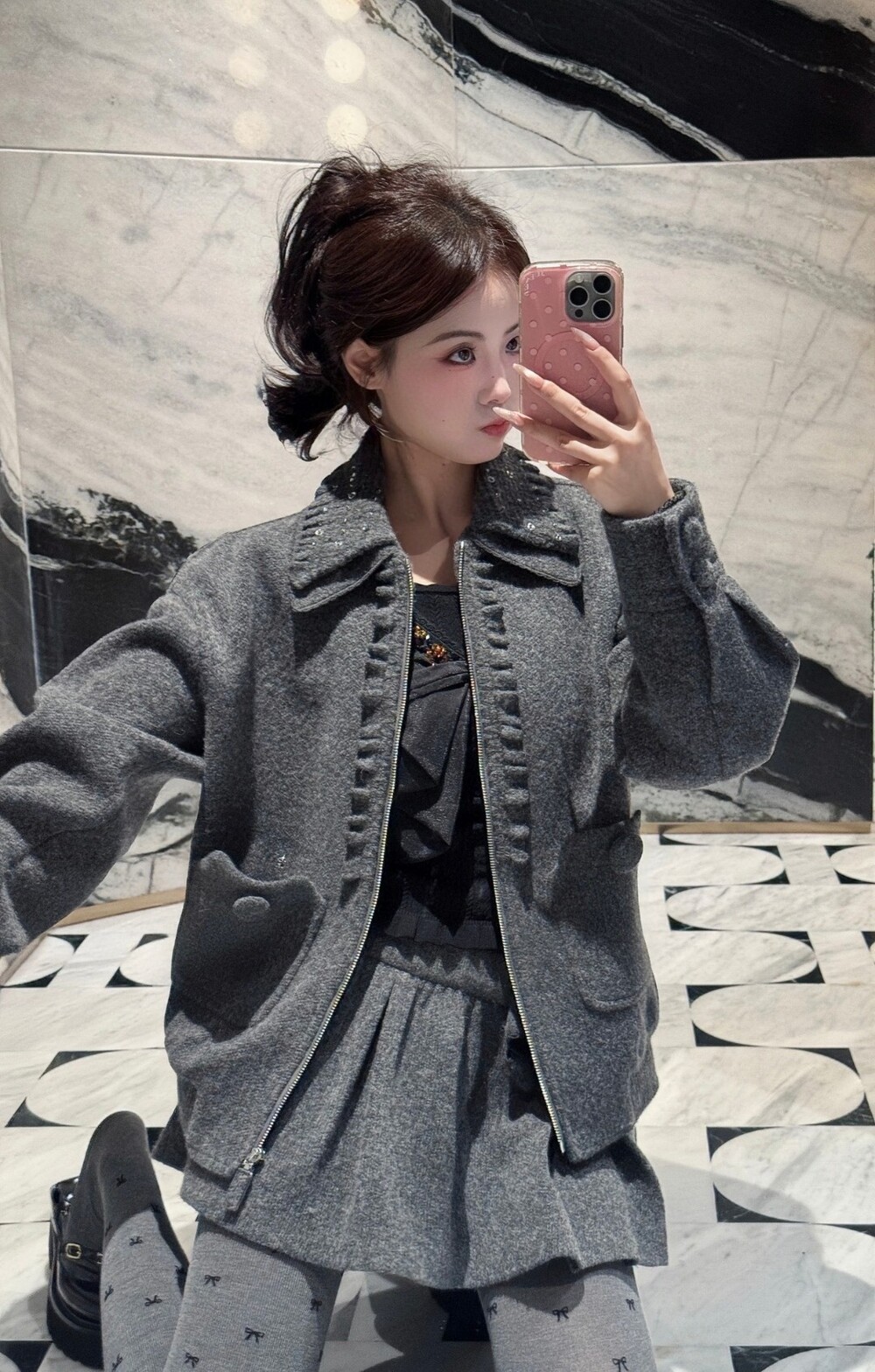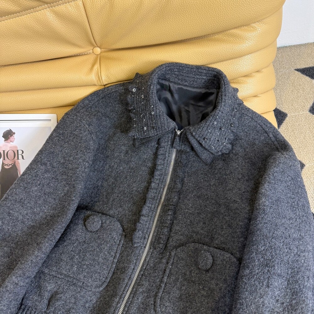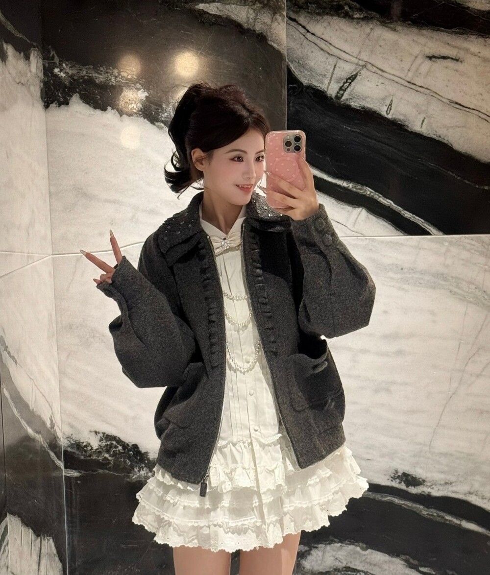 진한 차콜 그레이 울에 촘촘히 박힌 스톤 장식의 더블 레이어 카라,