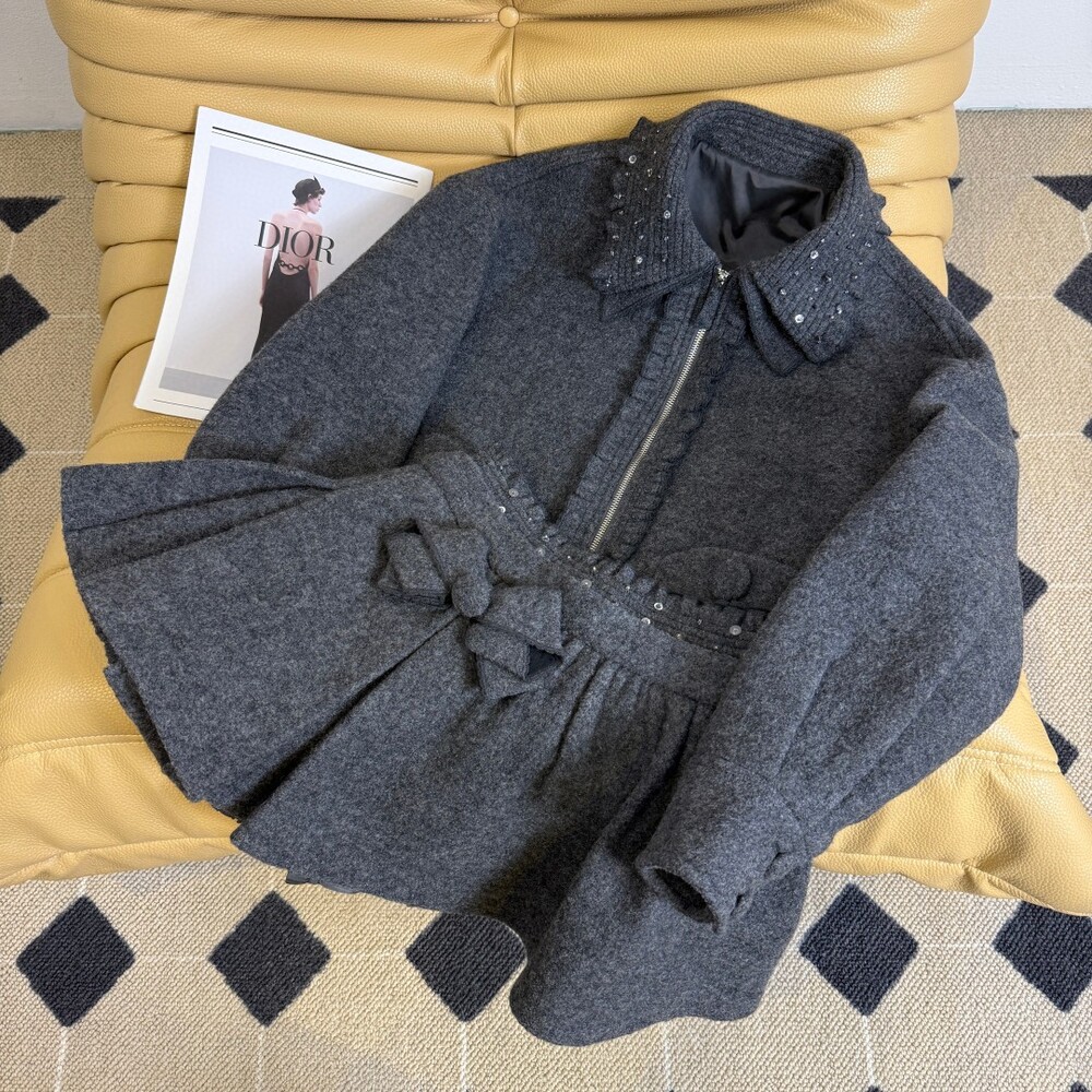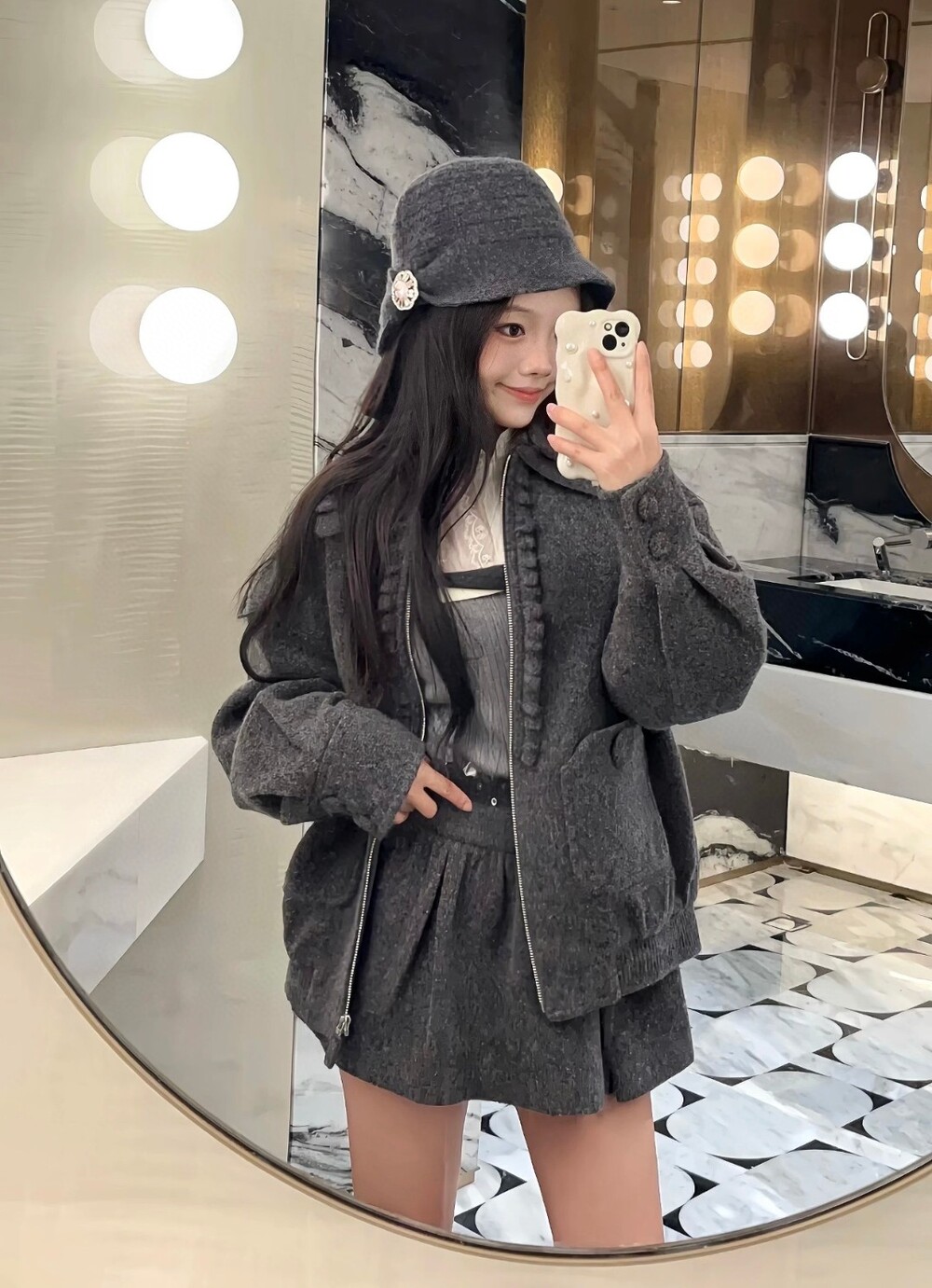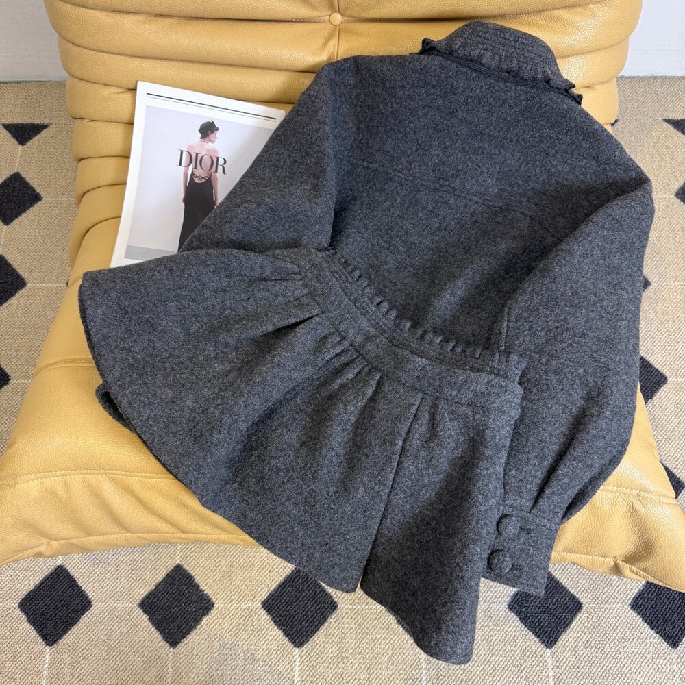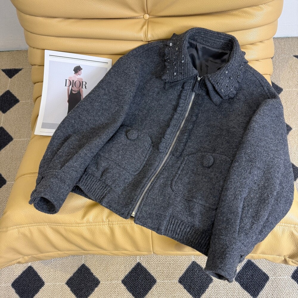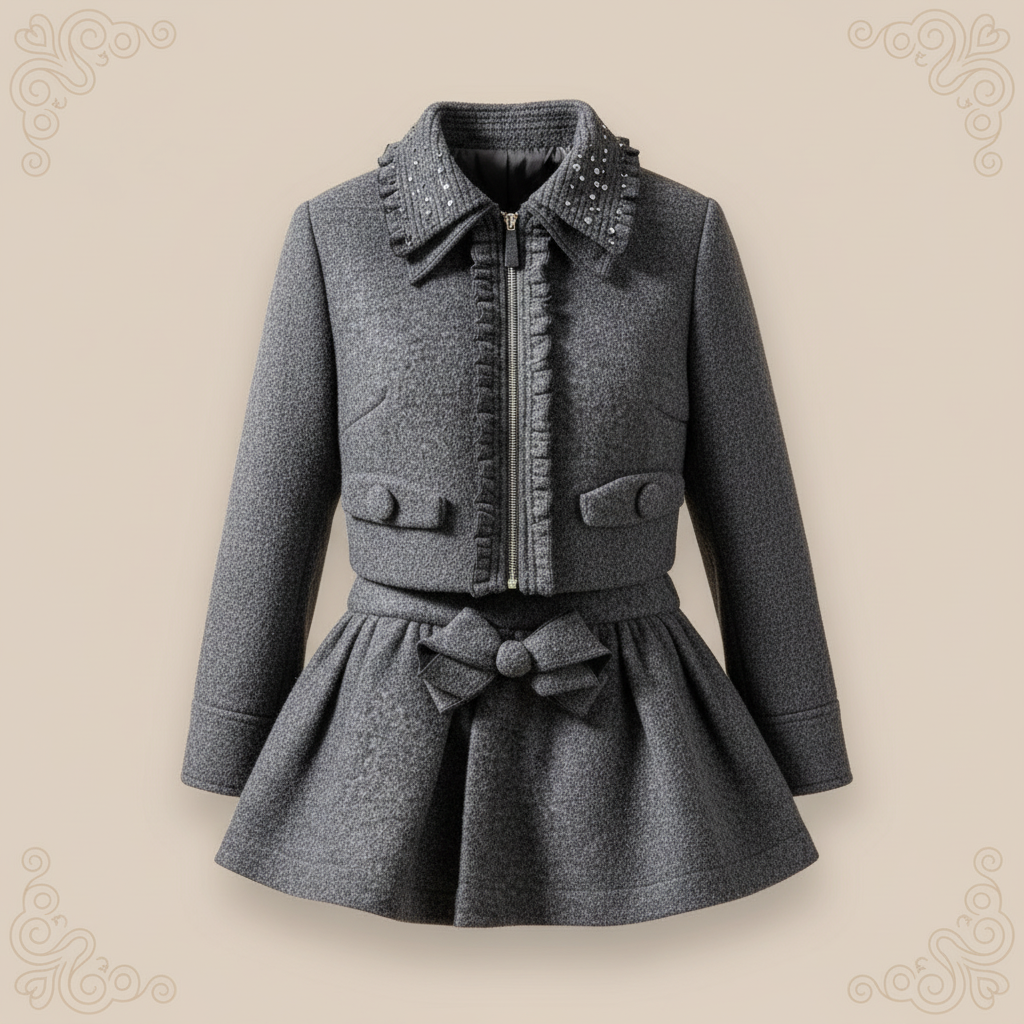 진한 차콜 그레이 울에 촘촘히 박힌 스톤 장식의 더블 레이어 카라,