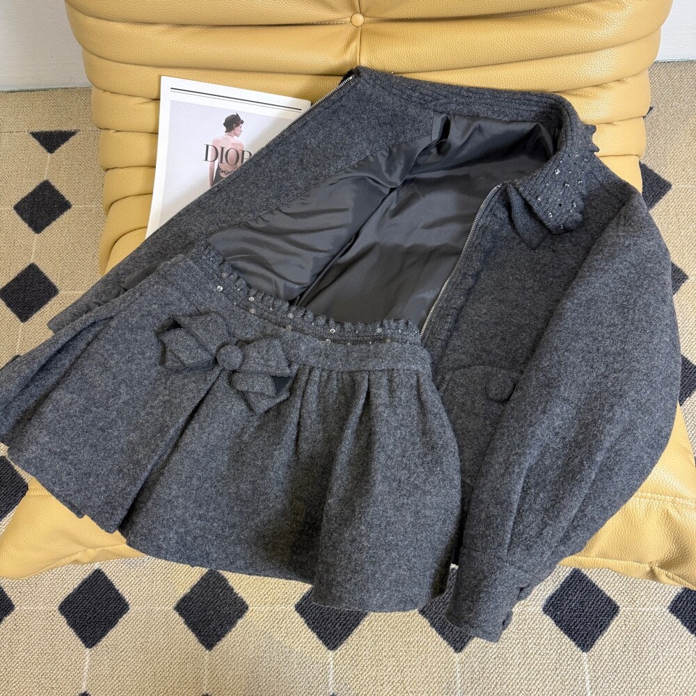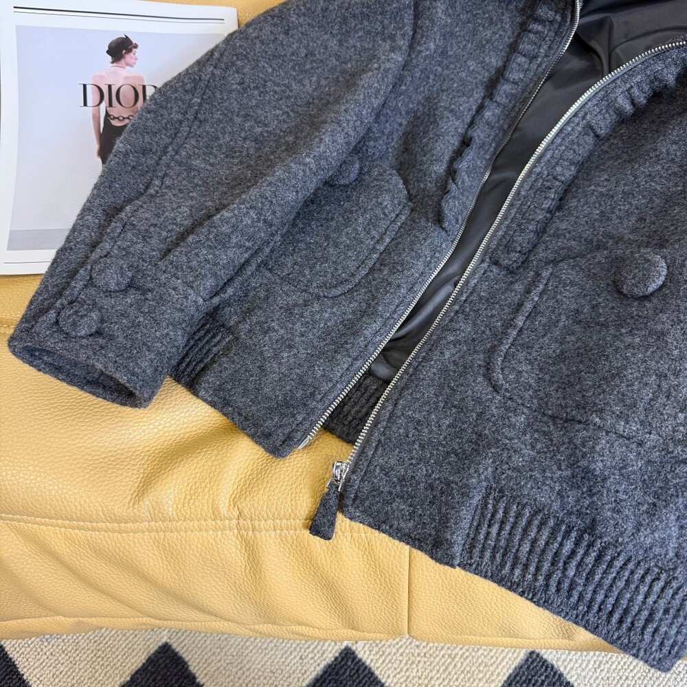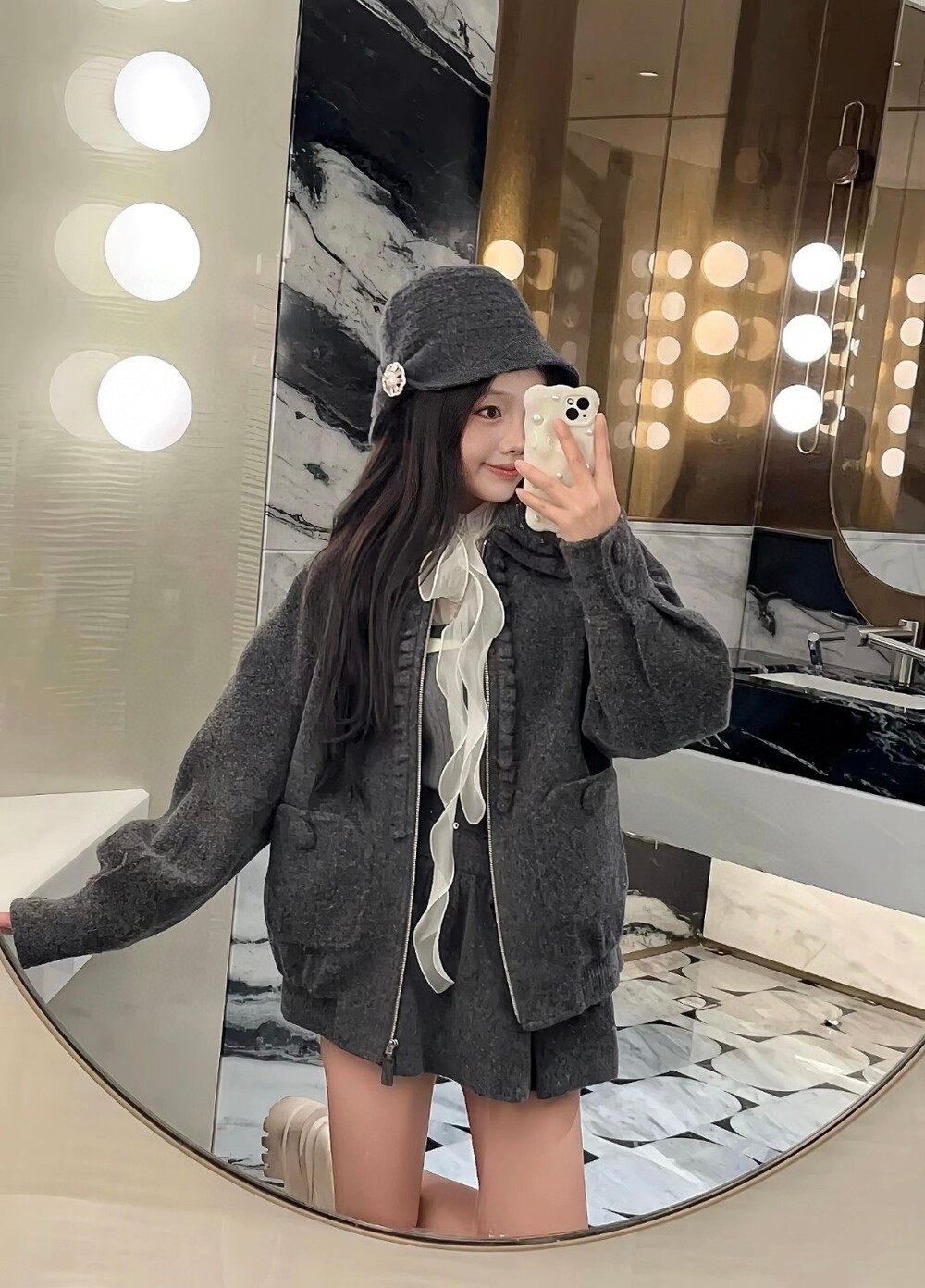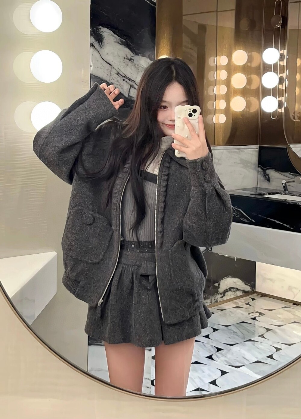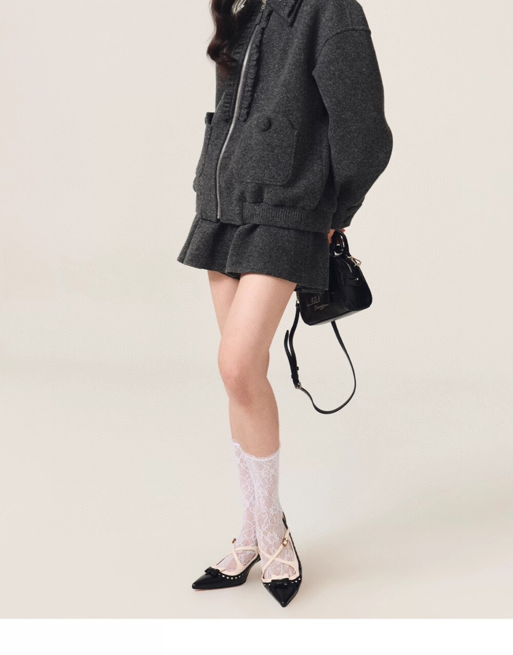 진한 차콜 그레이 울에 촘촘히 박힌 스톤 장식의 더블 레이어 카라,