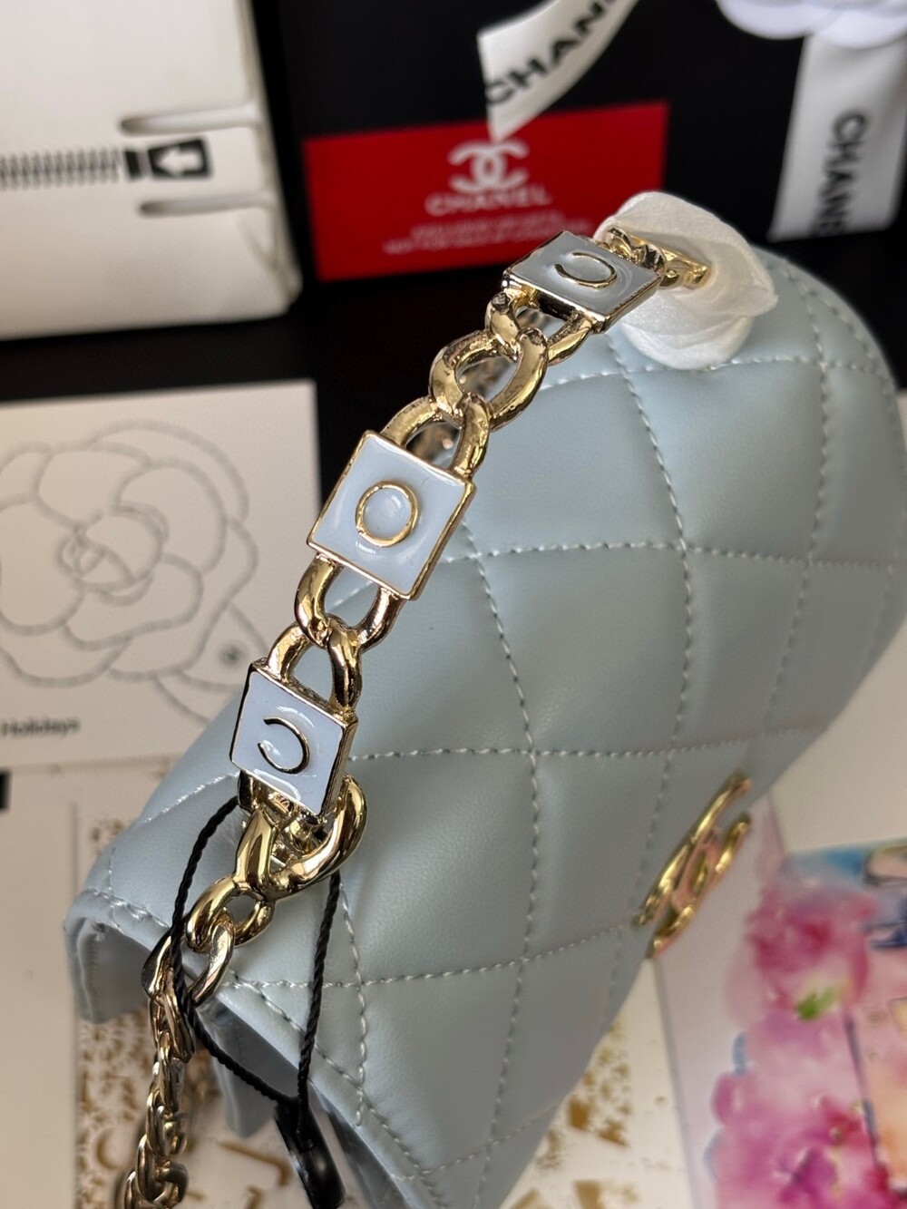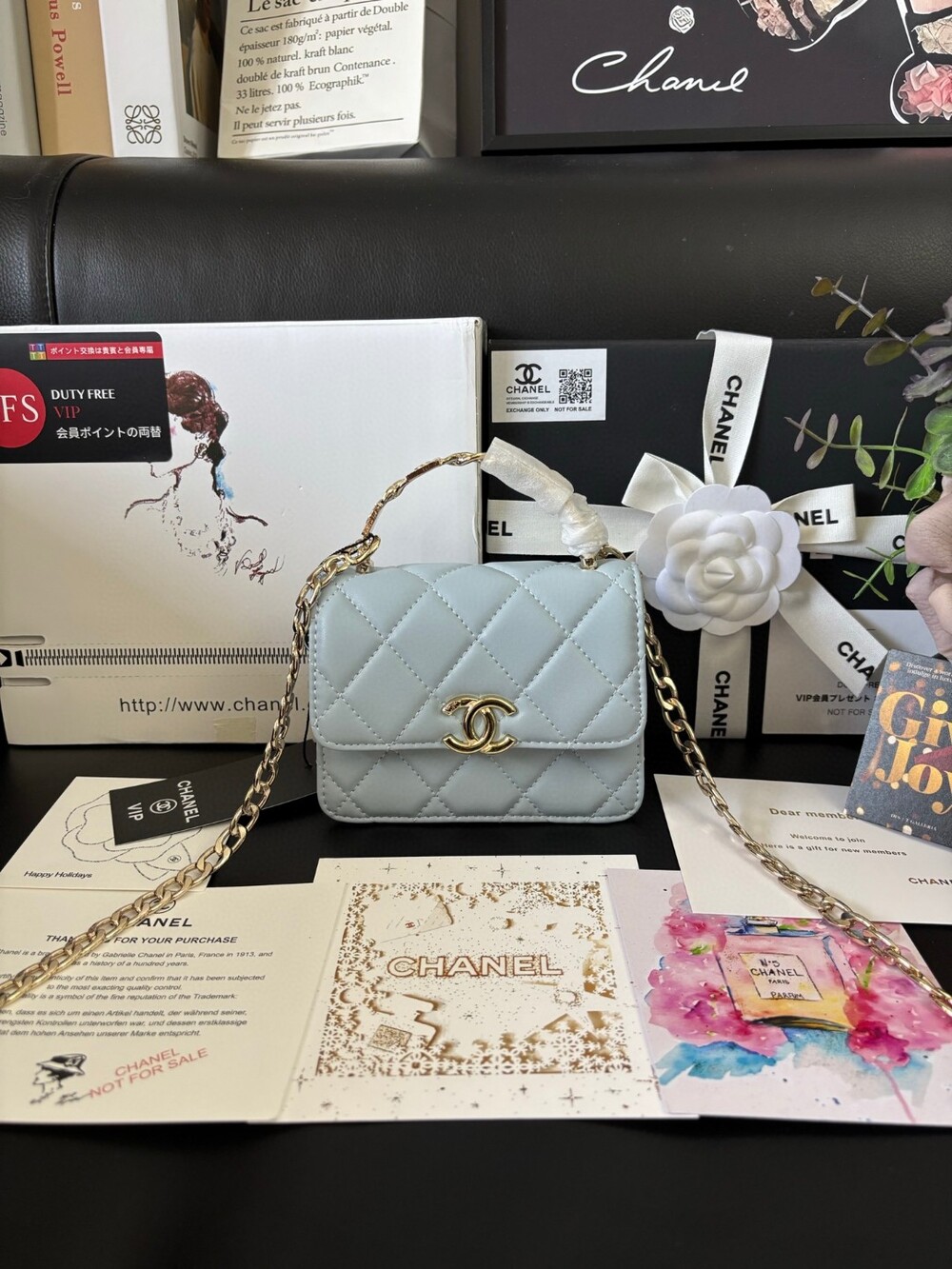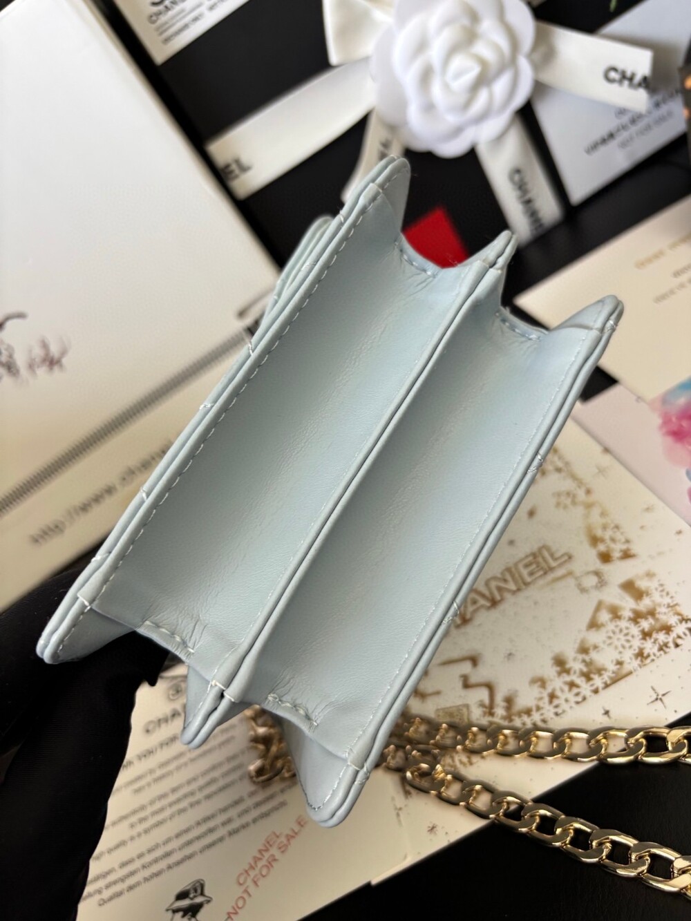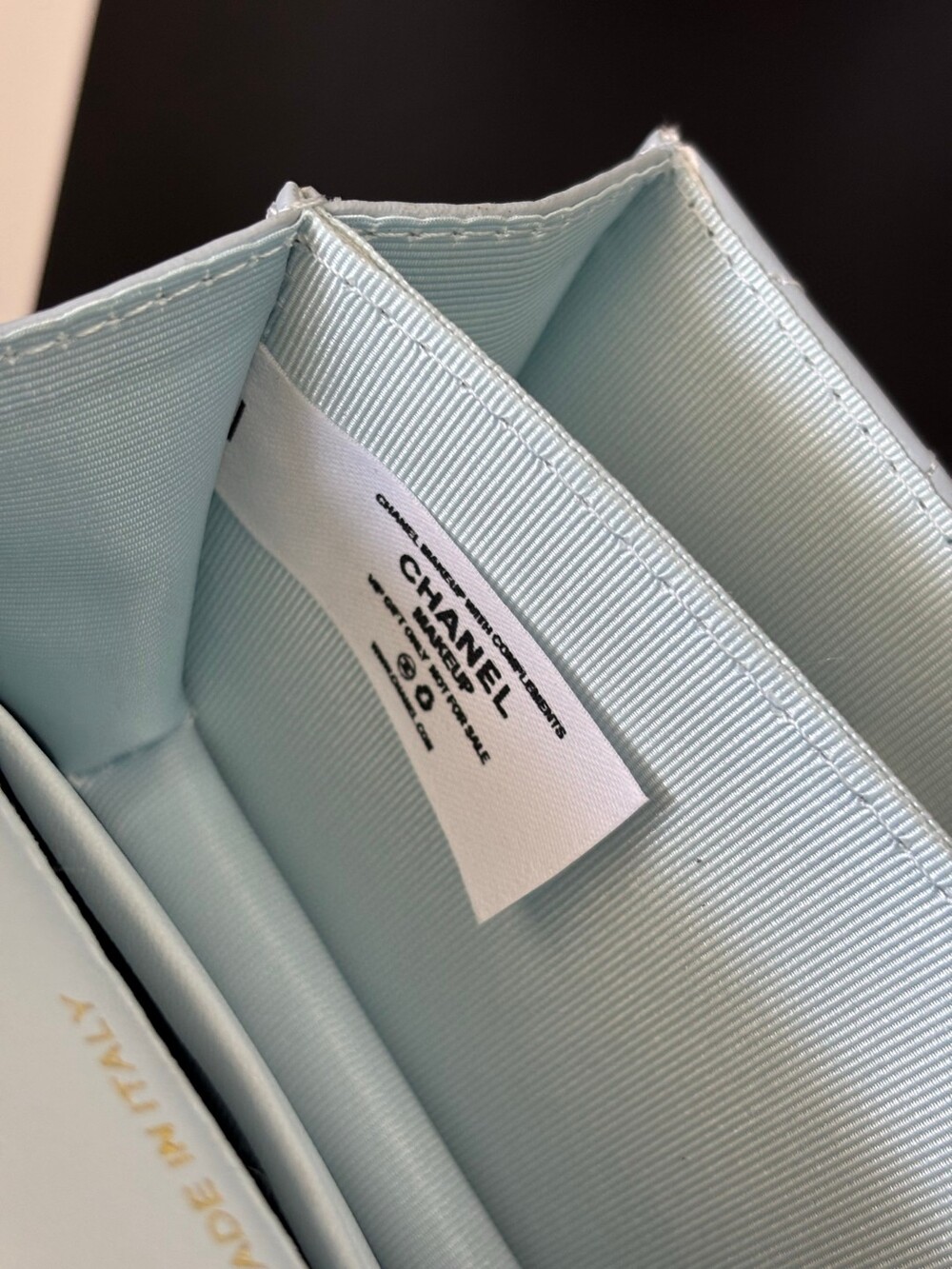 This Chanel 22S Mini Vanity Bag in a soft baby blue tone is the perfect seasonal accessory.Designed with a glossy enamel handle, soft matte texture, and detachable chain strap,this VIP gift-exclusive item combines charm with practicality.